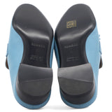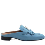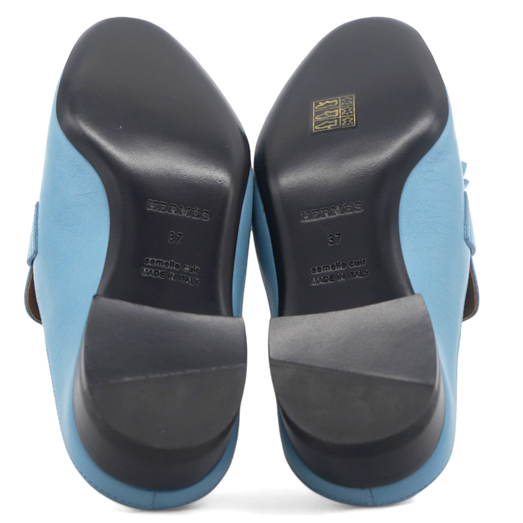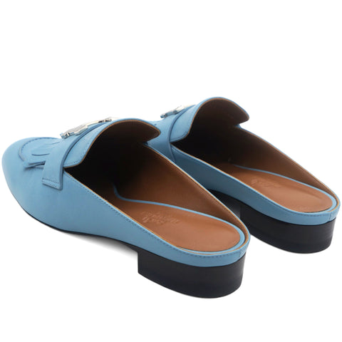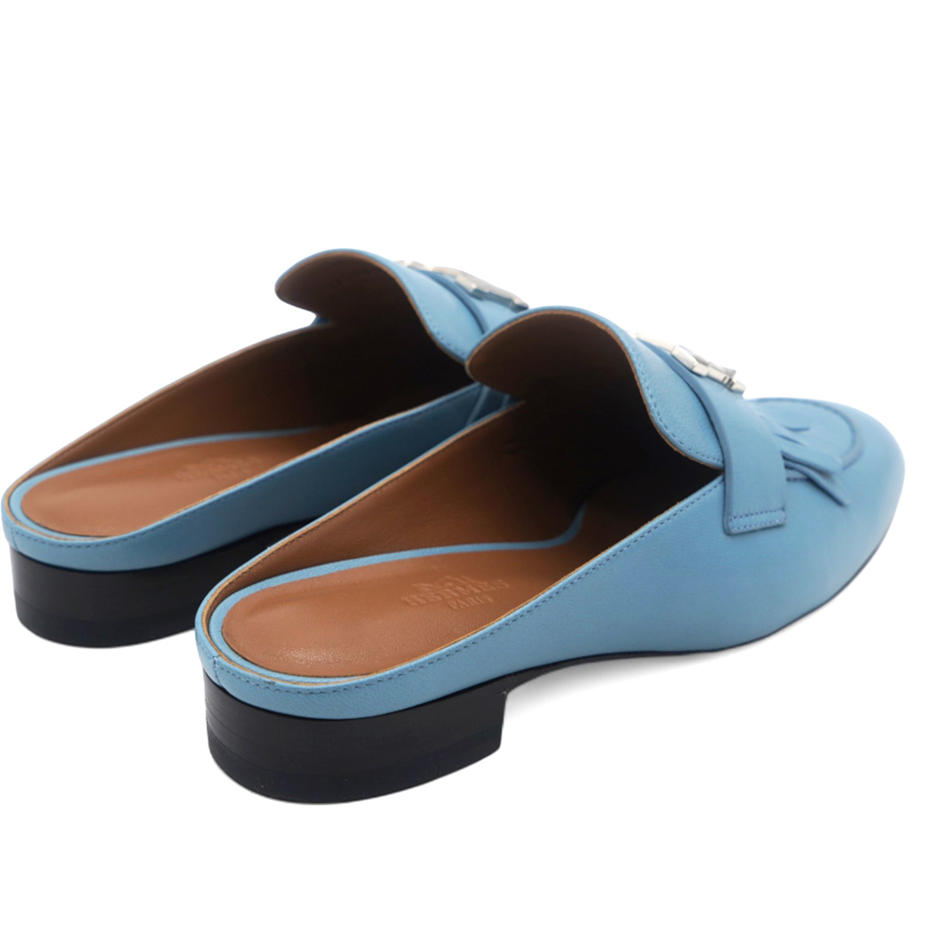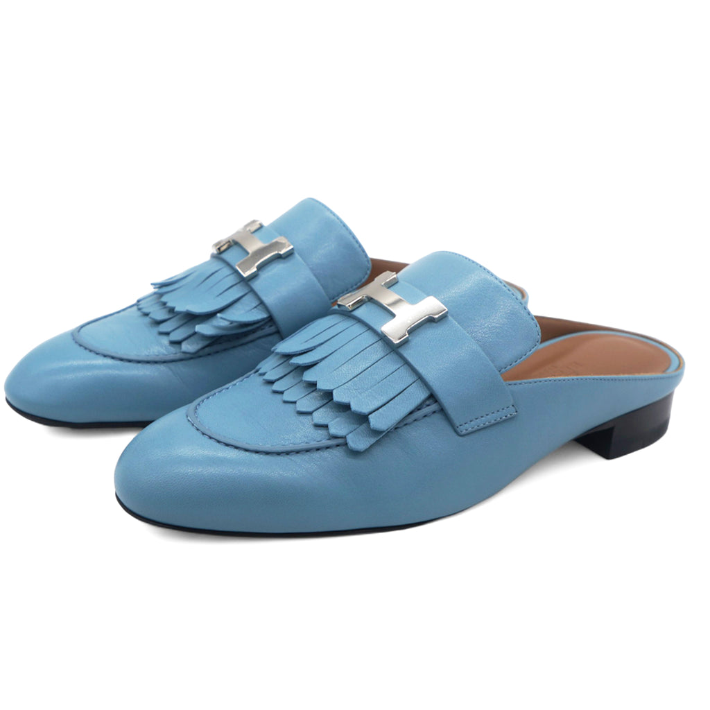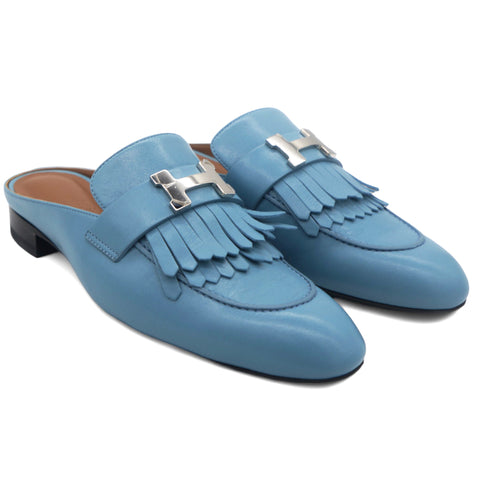 These stylish mules are crafted of fine light blue goatskin leather with a brown leather insole. They feature a fringe detail at the tongue with a polished silver Hermes logo,These are casual slip ons for everyday comfort, with the classical sophistication of Hermes!