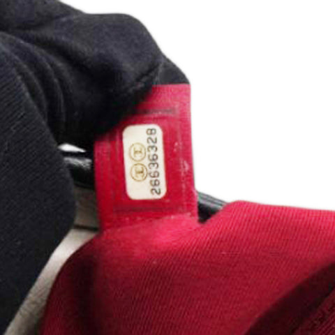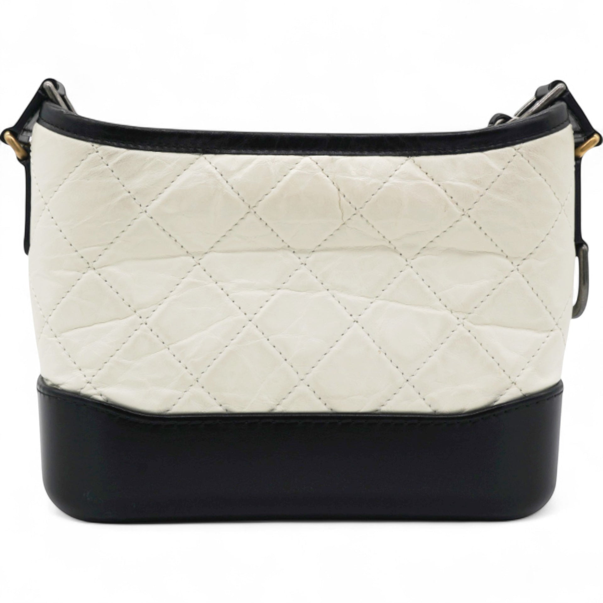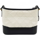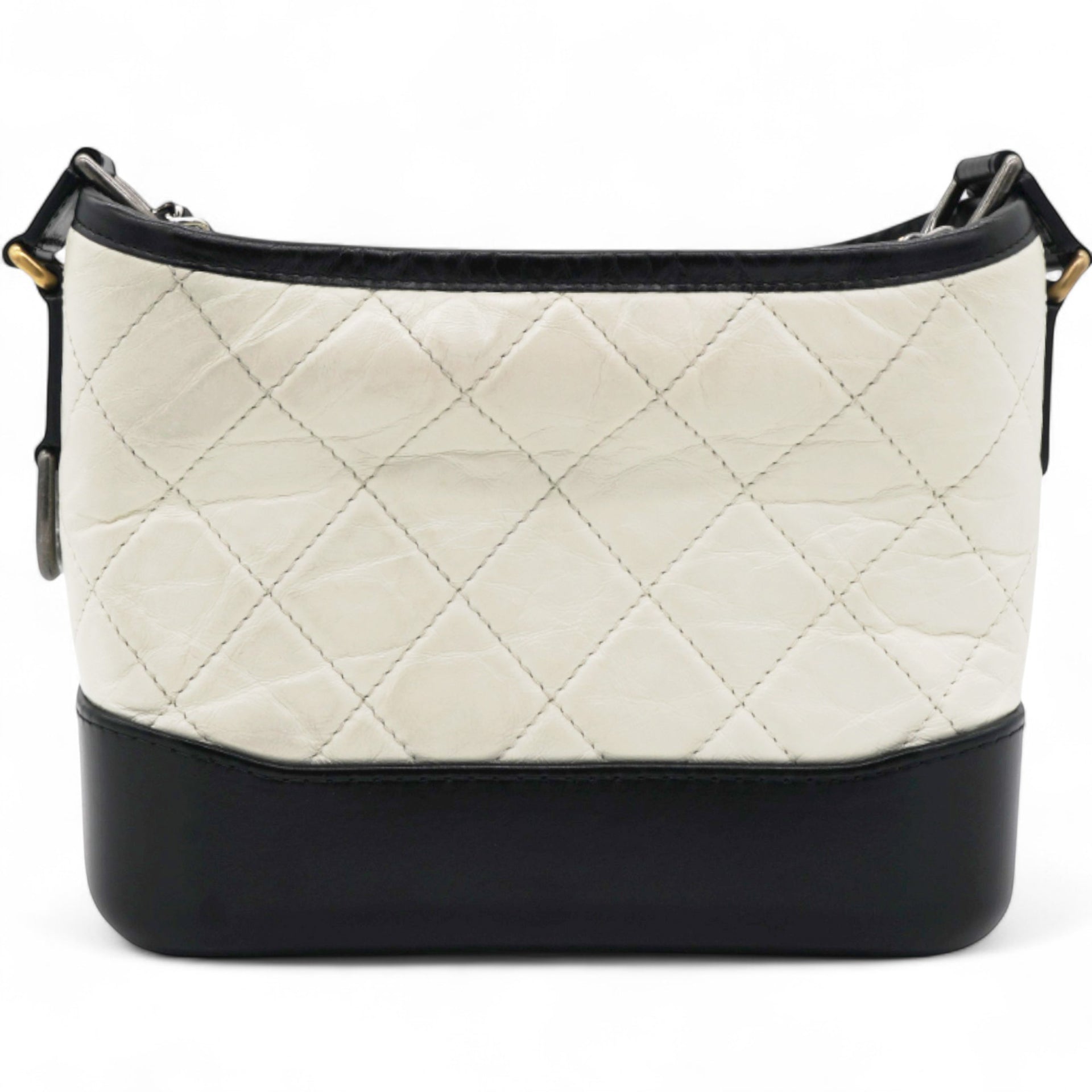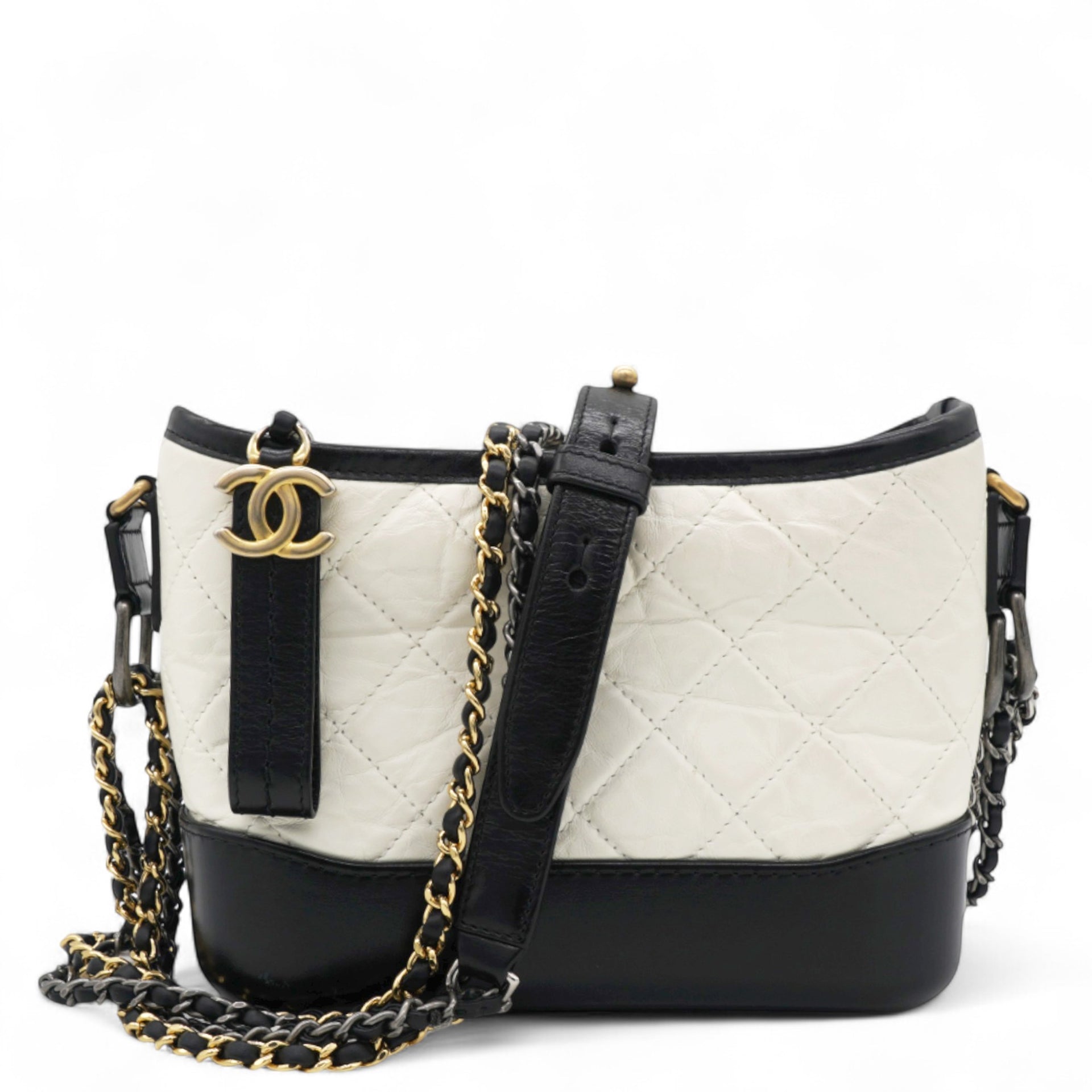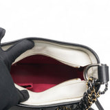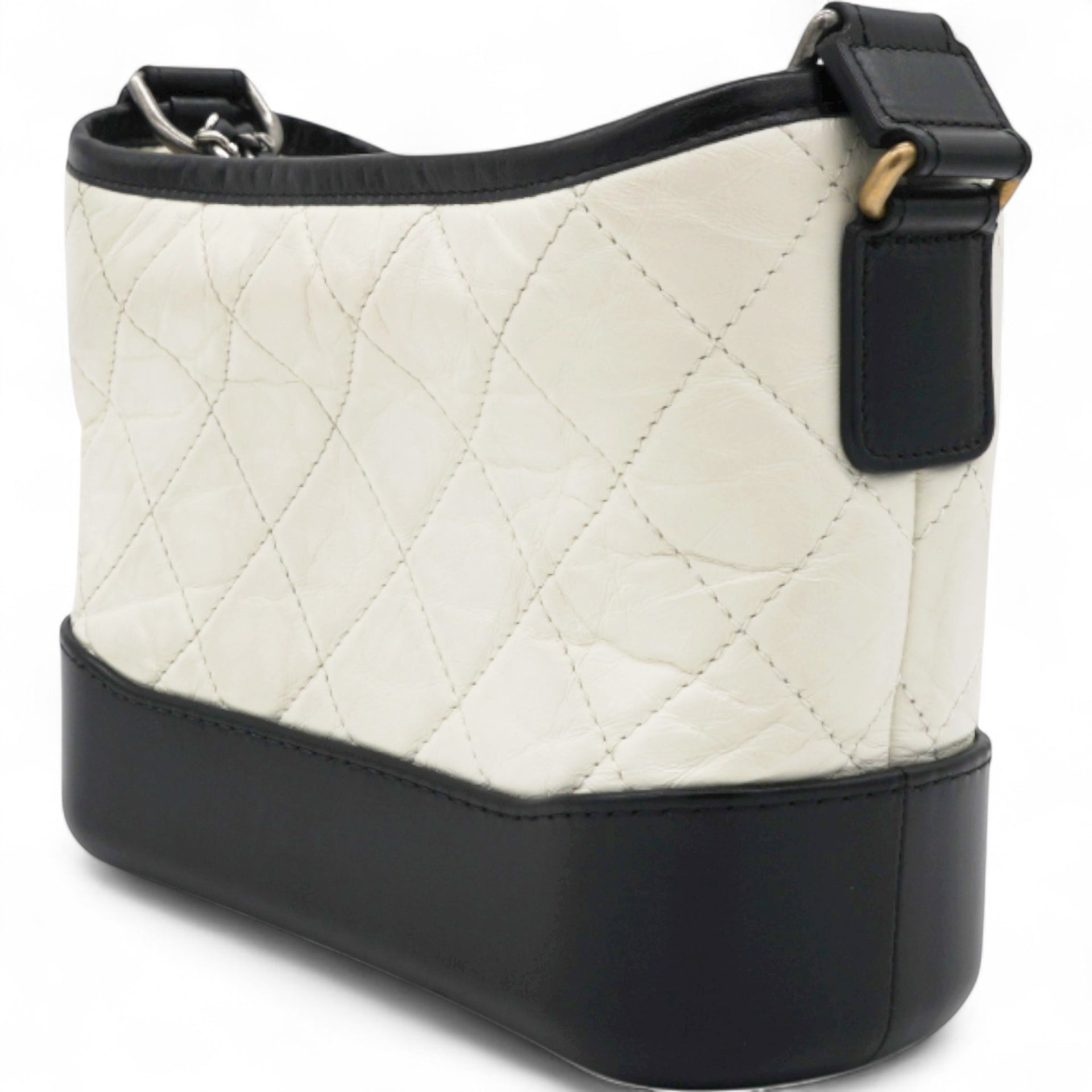 | This chic shoulder bag is crafted of diamond quilted aged leather in white, with a sturdy black leather base. The bag features a black leather threaded chain-link shoulder strap, with multiple hardware tones including polished gold, silver, and ruthenium. The top zipper opens to a deep red fabric interior with zipper and patch pockets. |