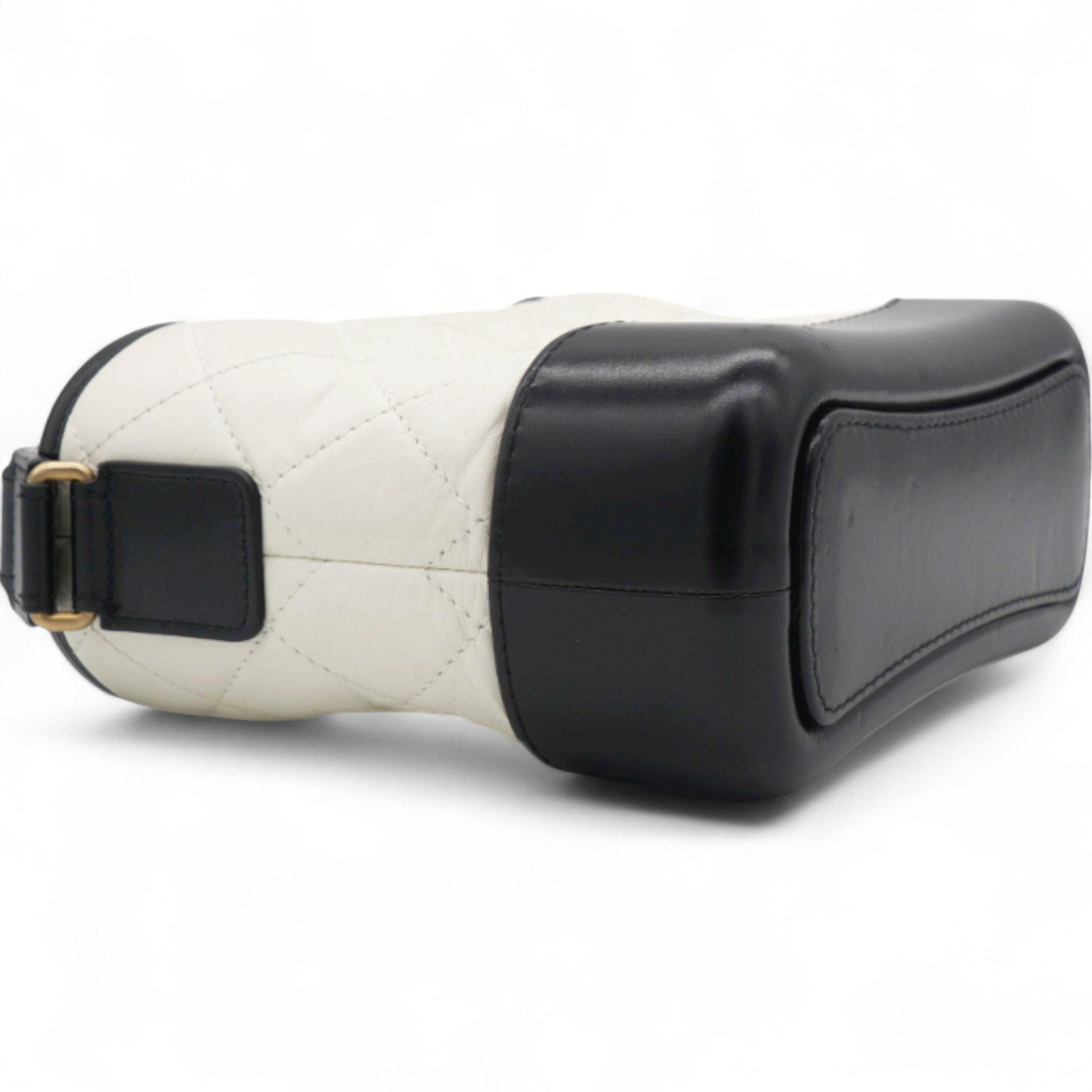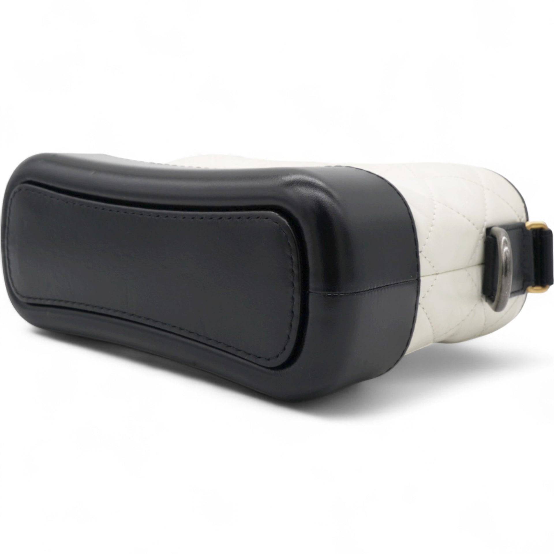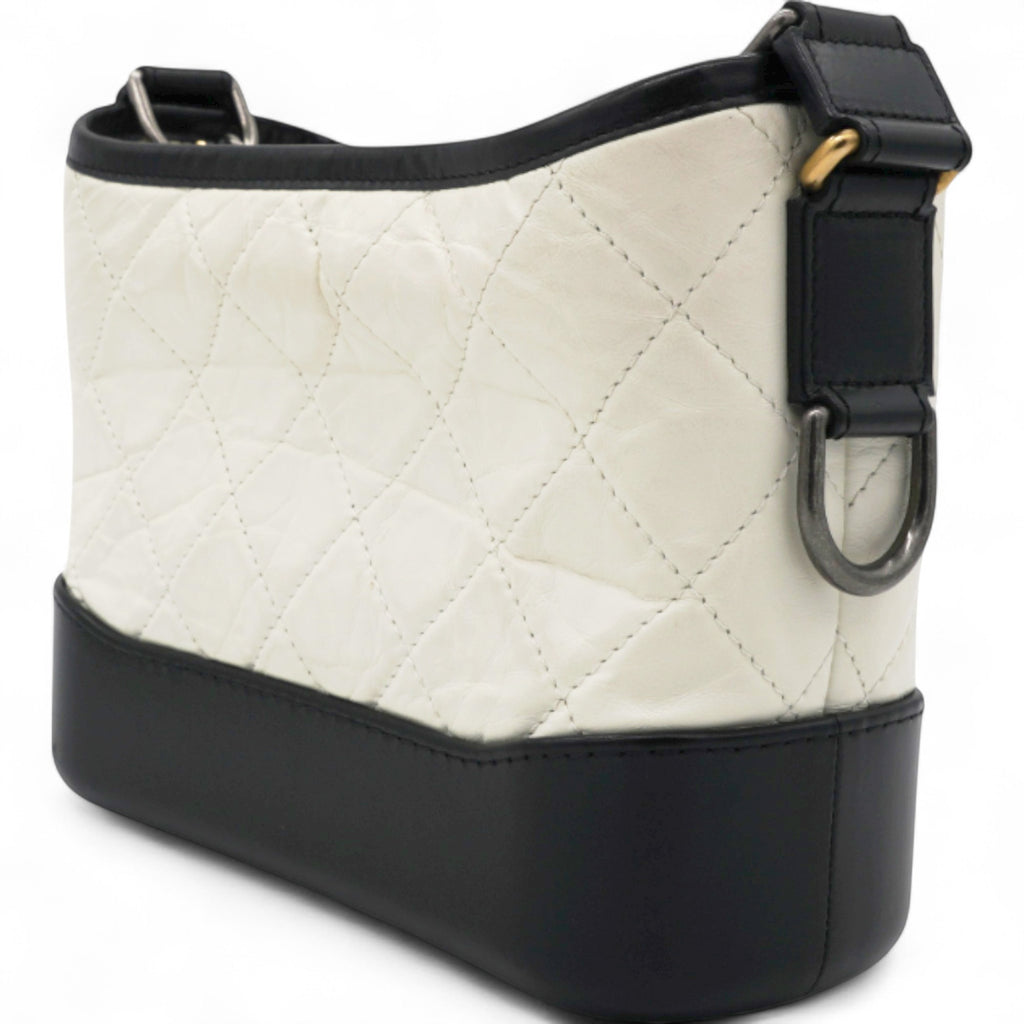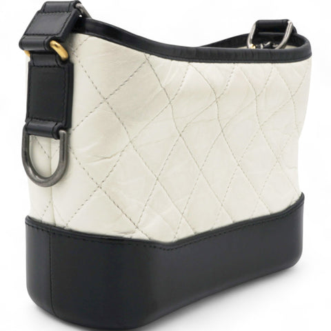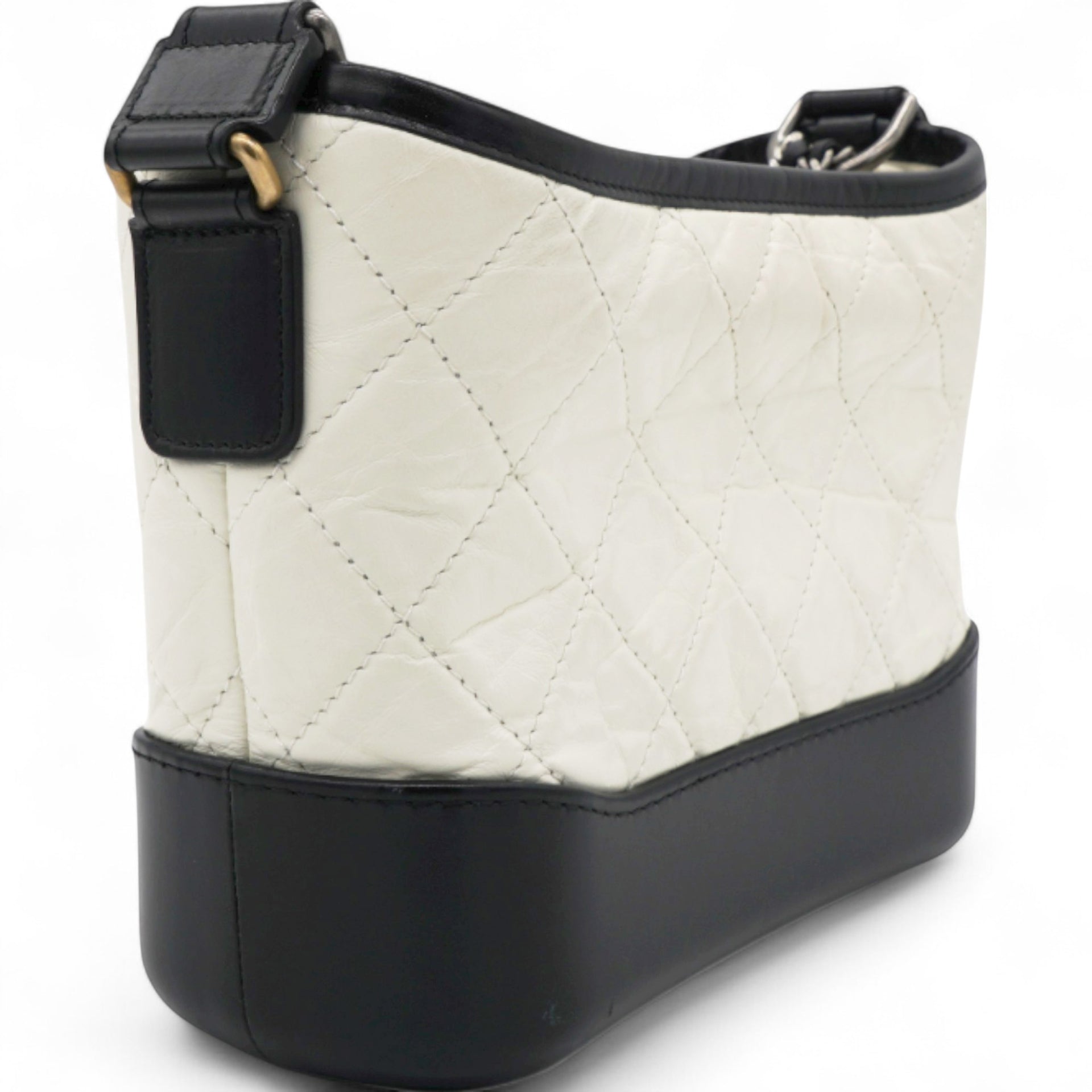 | This chic shoulder bag is crafted of diamond quilted aged leather in white, with a sturdy black leather base. The bag features a black leather threaded chain-link shoulder strap, with multiple hardware tones including polished gold, silver, and ruthenium. The top zipper opens to a deep red fabric interior with zipper and patch pockets. |
