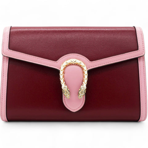 | This petite bag is crafted of beautifully grained calfskin leather in red. This shoulder bag features an optional matte silver chain shoulder strap and a textured horseshoe tiger head spurred closure encrusted with crystals. The double flap opens to a beige suede interior with a key ring that can attach to a larger bag. |