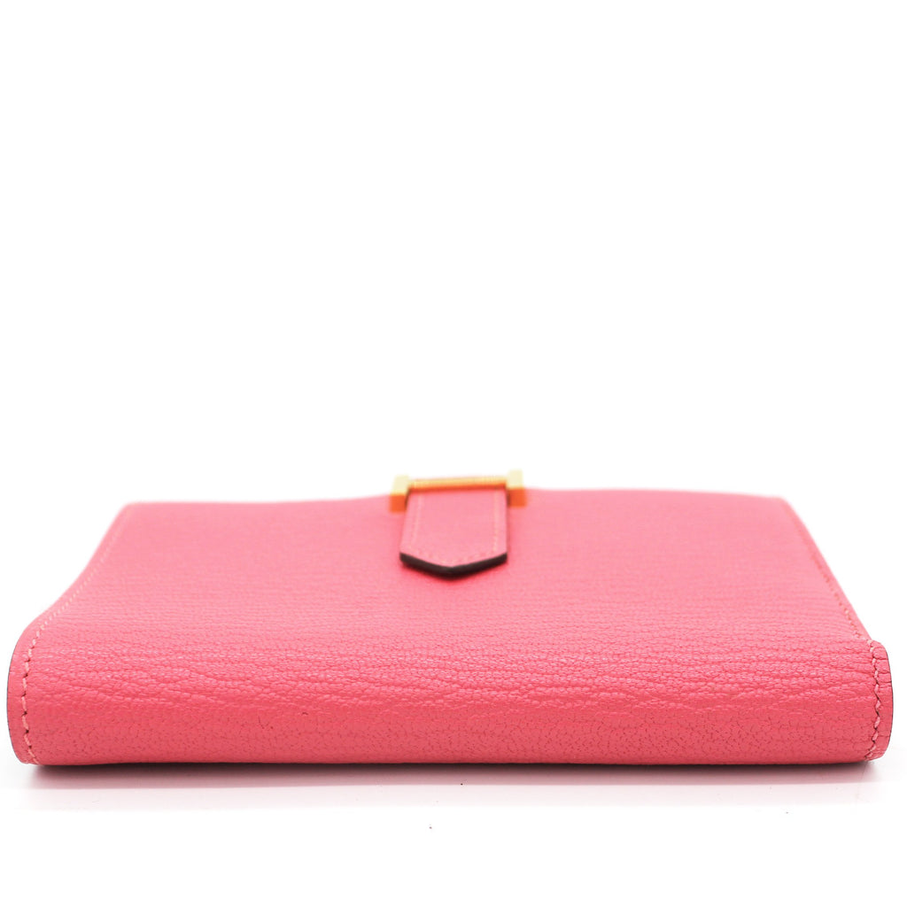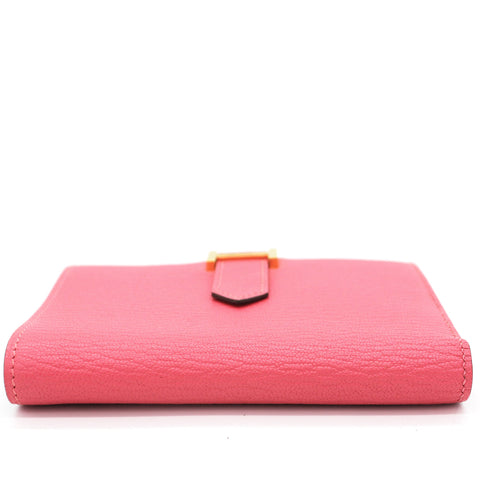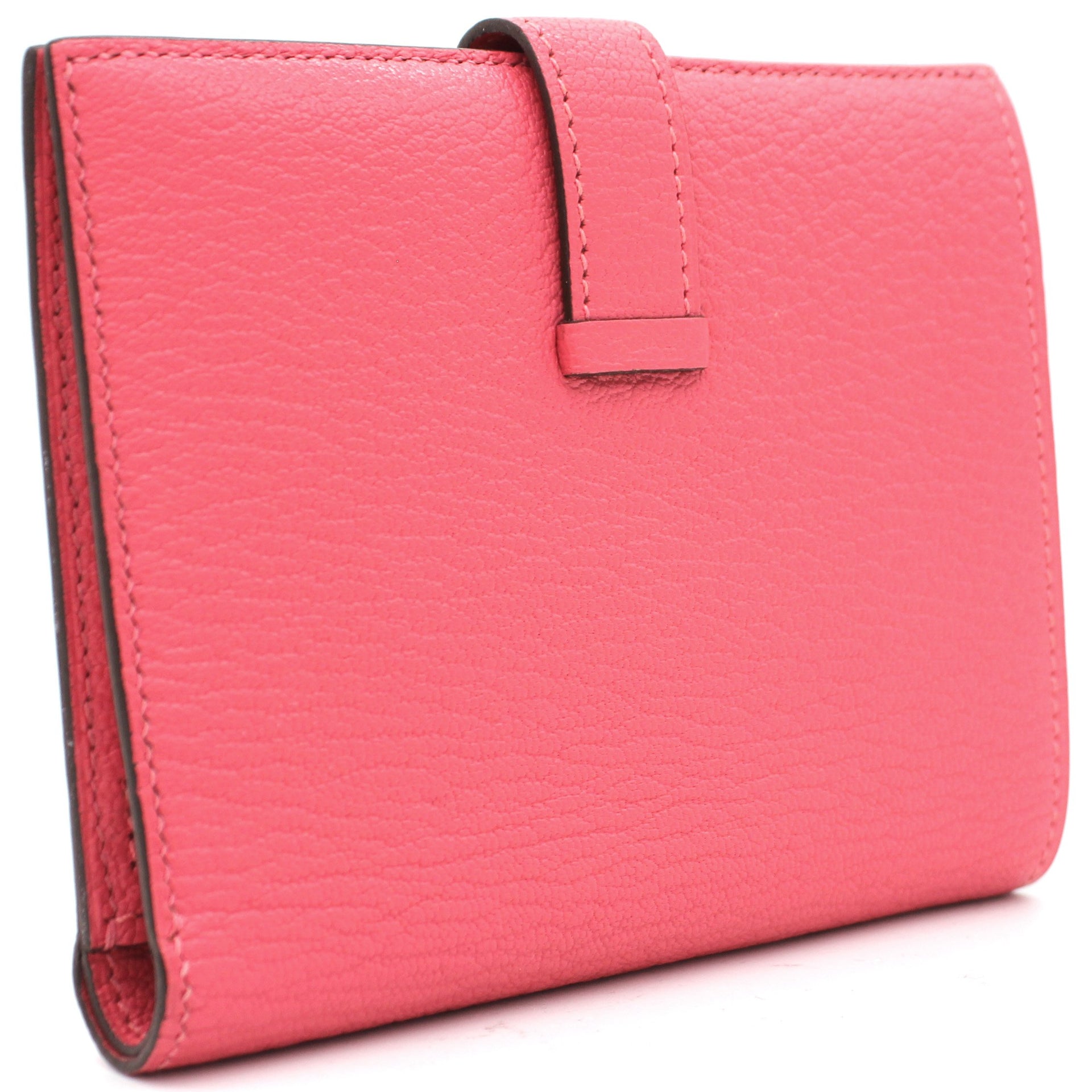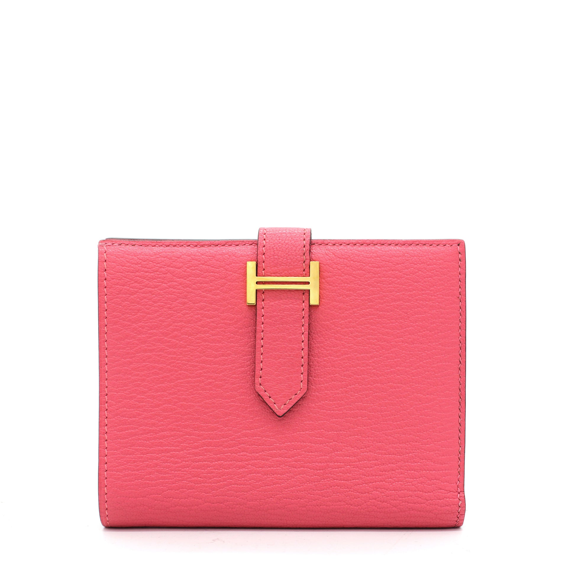 | Compact wallet in Mysore goatskin with 4 credit card slots, 4 pockets, zipped change purse and gold plated 'H' tab closure |