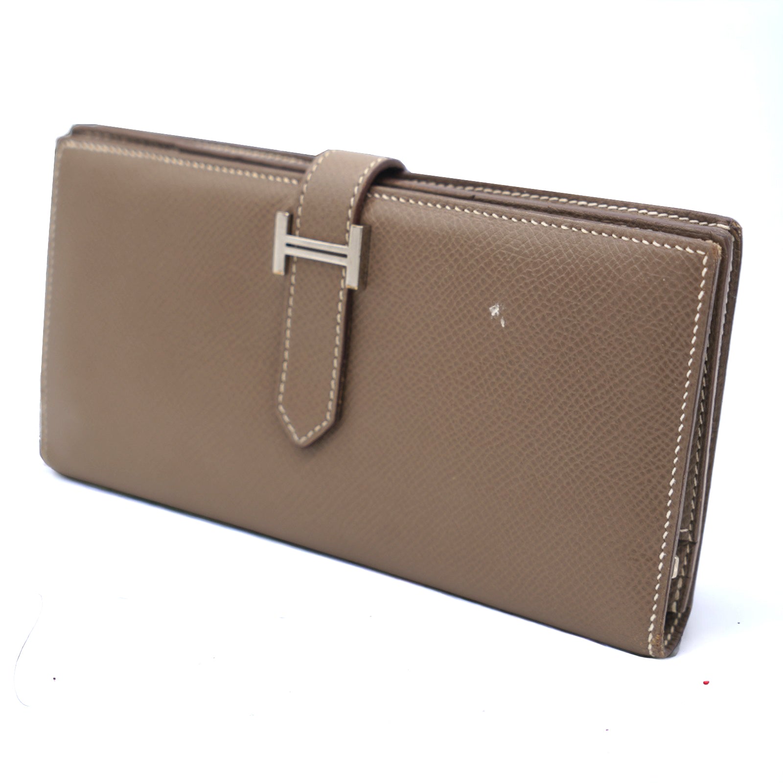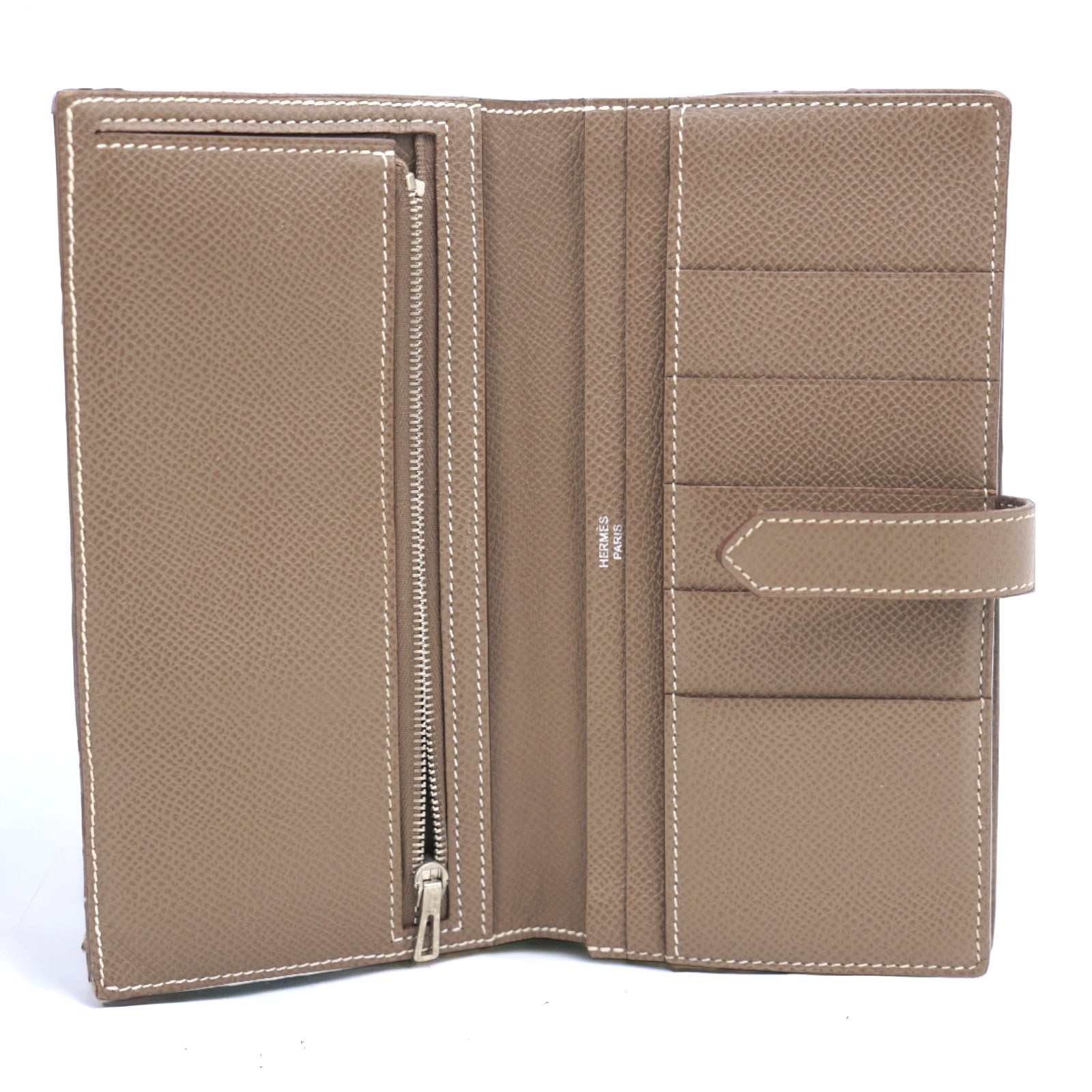 | This authentic Hermes Bearn Wallet Long is your perfect small accessory. Crafted from epsom Etoupe leather featuring its silver-plated 'H' tab closure and silver-tone hardware accents. Its matching Etoupe leather-lined interior showcases multiple card slots, patch and zip pockets perfect for storing bills, coins and cards. A timeless investment piece for any fashionista. |