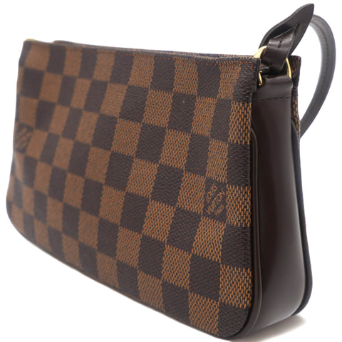 This Navona clutch bag from Louis Vuitton Pre-Owned featuring brown, signature Damier Ebène canvas, leather trim, single detachable top handle, top zip fastening, main compartment, internal logo patch, gold-tone hardware and circa.