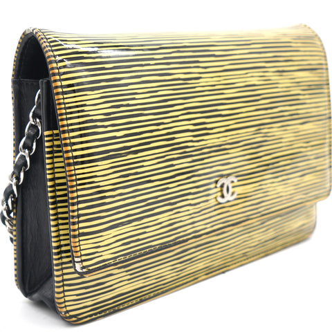 Yellow and Black Patent Calfskin Striped Wallet on Chain