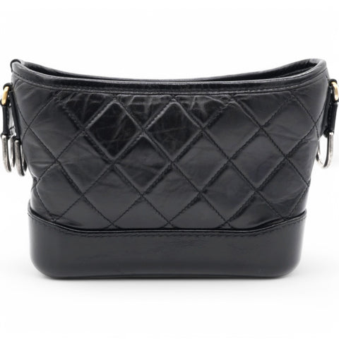 | The bag is featured in diamond-stitched aged eather in black with leather trim and base. The bag features a thin gold-tone, silver-tone, and ruthenium chain link leather threaded shoulder straps with a shoulder pad. The top zipper opens to a red fabric interior with pockets. |