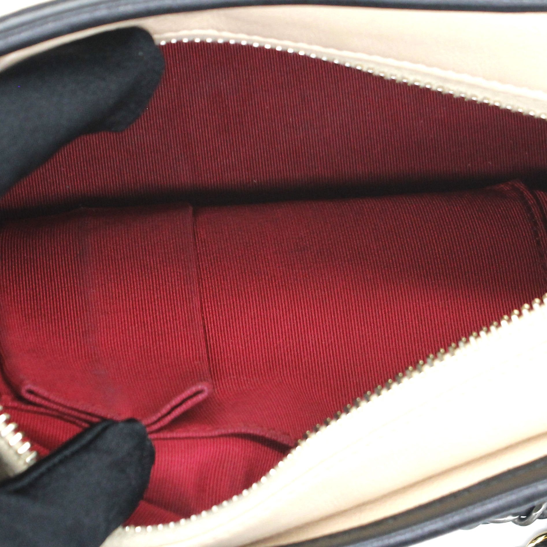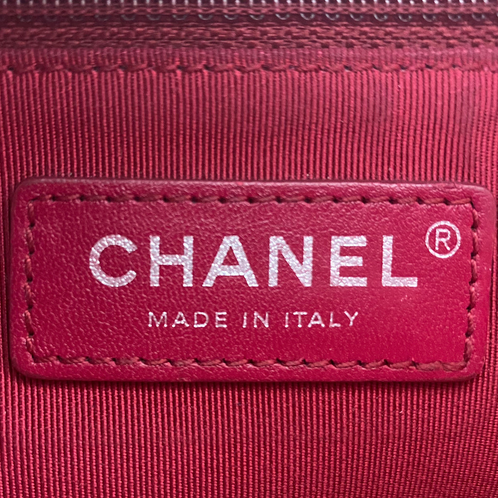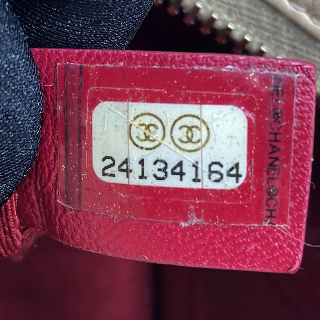 Exterior Material: Beige calfskin with a smooth black leather base. Gradient gold to ruthenium chain threaded leather shoulder strap and an aged gold CC logo. Interior Material: Red textile lining with one main compartment and zipped pocket. Accessories: Dust Bag; Box; Authentic Card Serial Number: 24134164 Bought Year: 2018 |