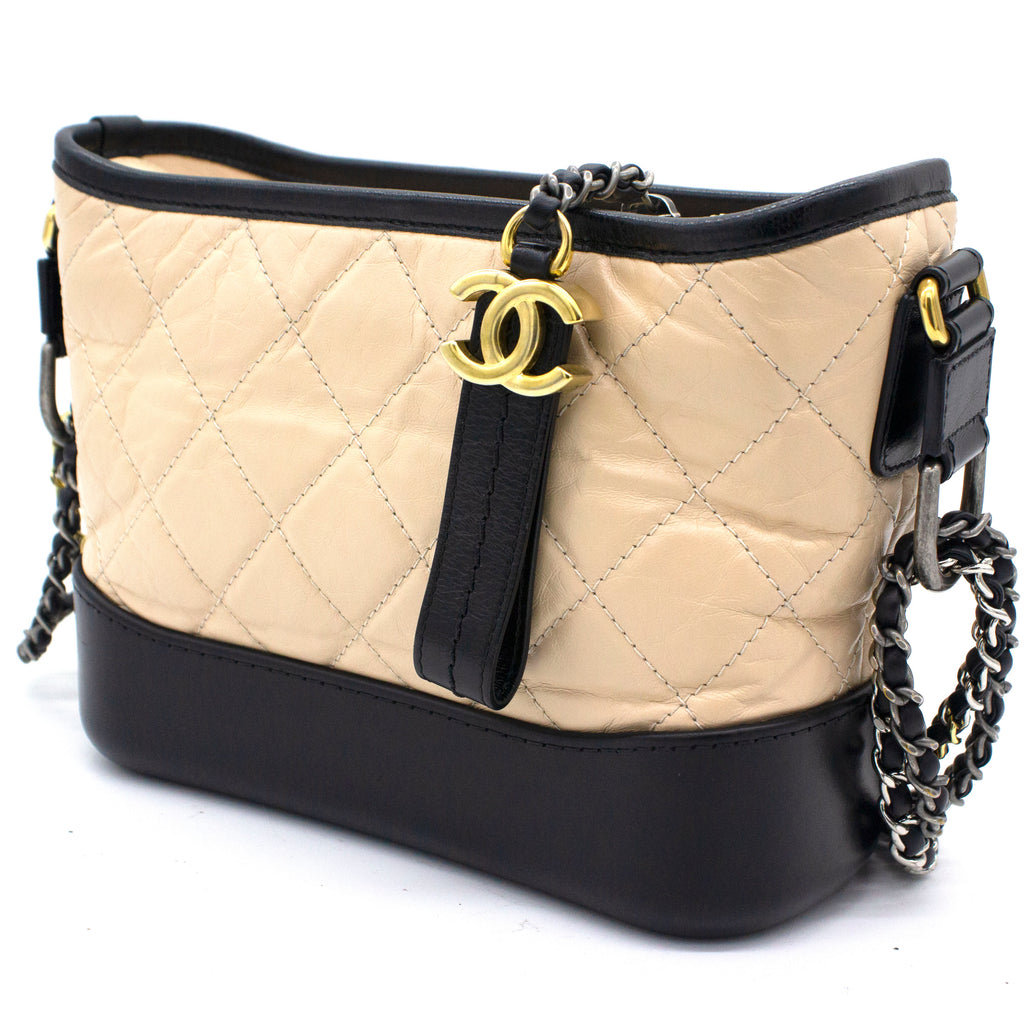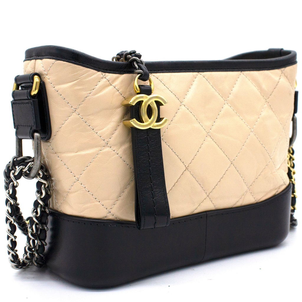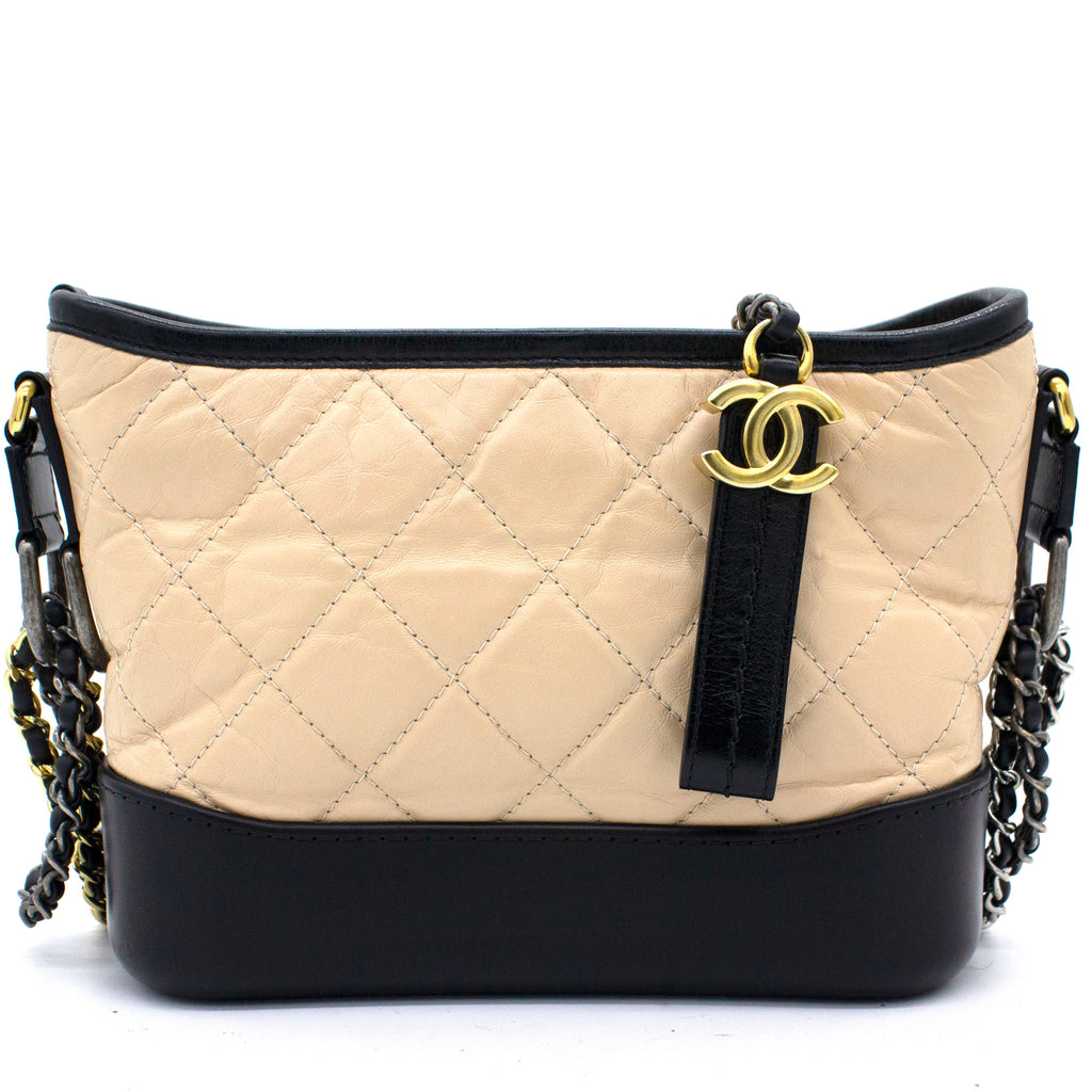 | Get yourself this beautiful Gabrielle bag from the iconic house of Chanel. It exudes style and will always deliver sophistication. Crafted in Italy and made from quality leather, it comes in a lovely shade of beige and balck. The exterior flaunts the signature quilted pattern on top, a zip closure with the zip pull carrying the CC logo, a fabric interior with a zip pocket and a long interwoven strap. It is finished with gold-tone hardware. |