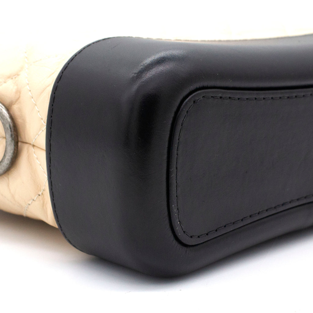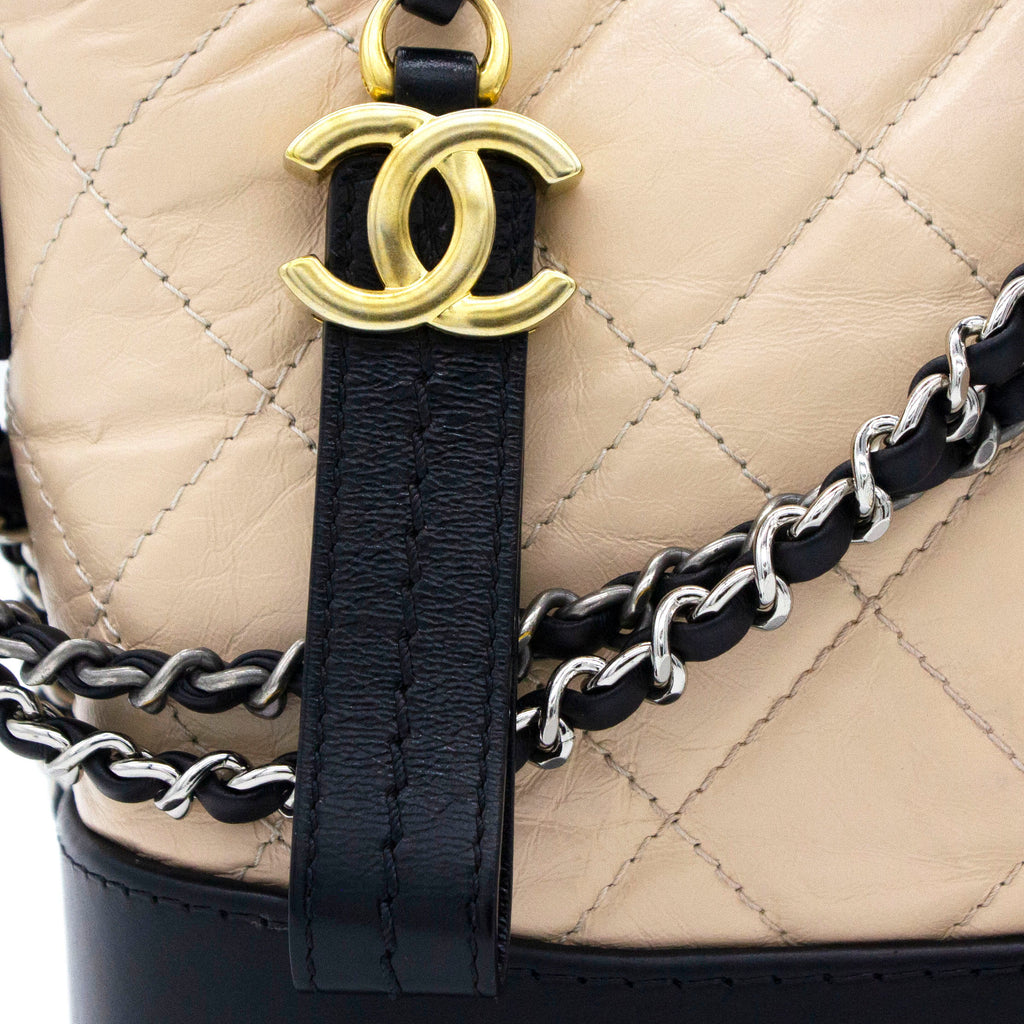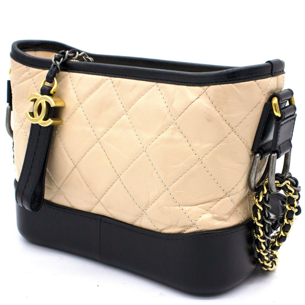 | Get yourself this beautiful Gabrielle bag from the iconic house of Chanel. It exudes style and will always deliver sophistication. Crafted in Italy and made from quality leather, it comes in a lovely shade of beige and balck. The exterior flaunts the signature quilted pattern on top, a zip closure with the zip pull carrying the CC logo, a fabric interior with a zip pocket and a long interwoven strap. It is finished with gold-tone hardware. |