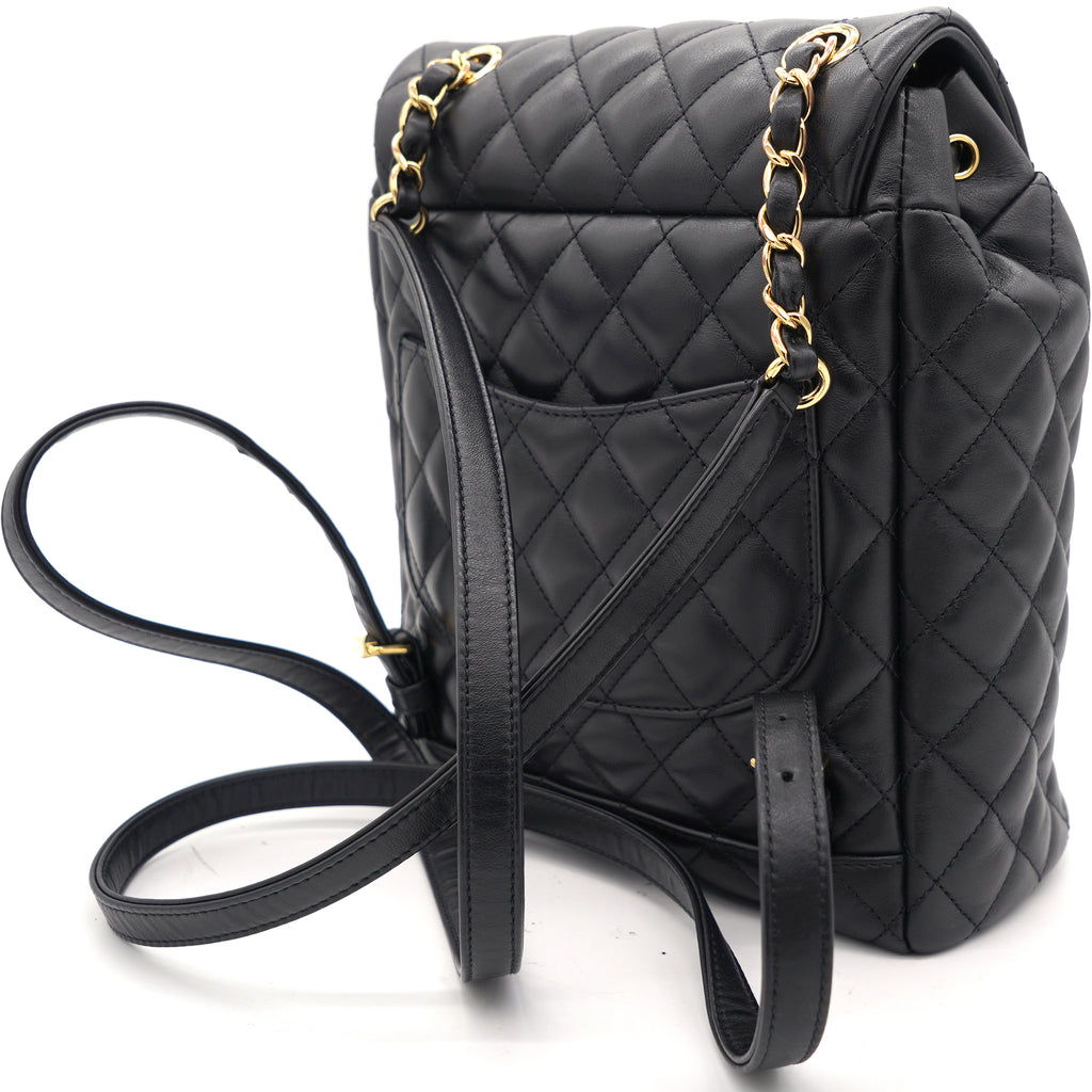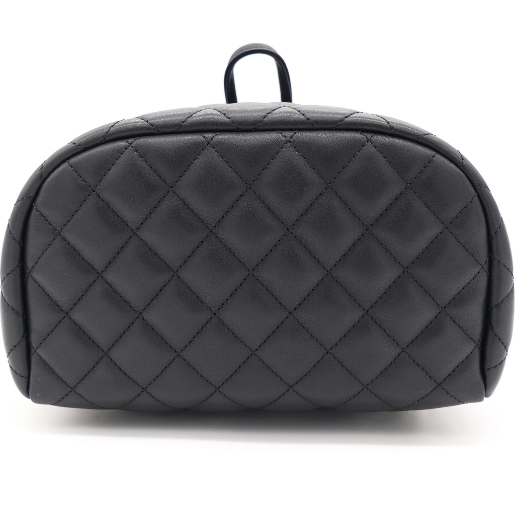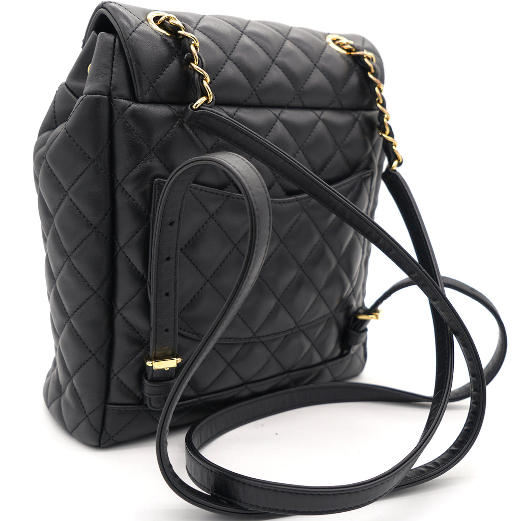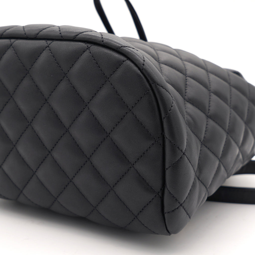 | This stylish backpack is beautifully crafted of soft and smooth diamond-quilted calfskin leather in black. It features polished silver chain link leather threaded shoulder straps, an exterior rear patch pocket, a facing external flap that opens with a polished silver Chanel CC turn lock and an open-top that closes with a cinch cord. |