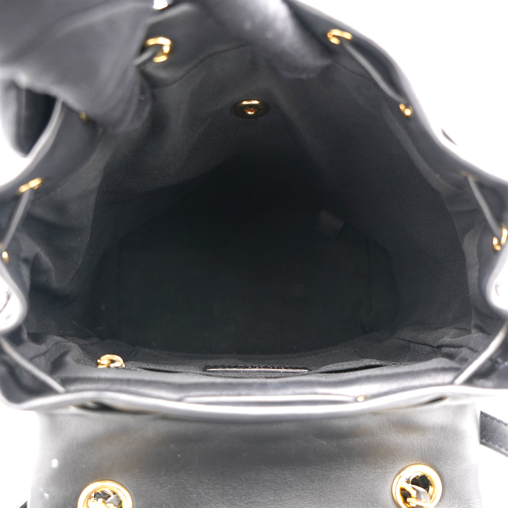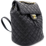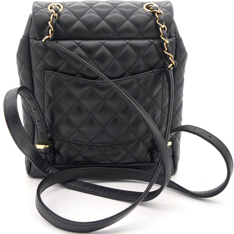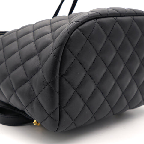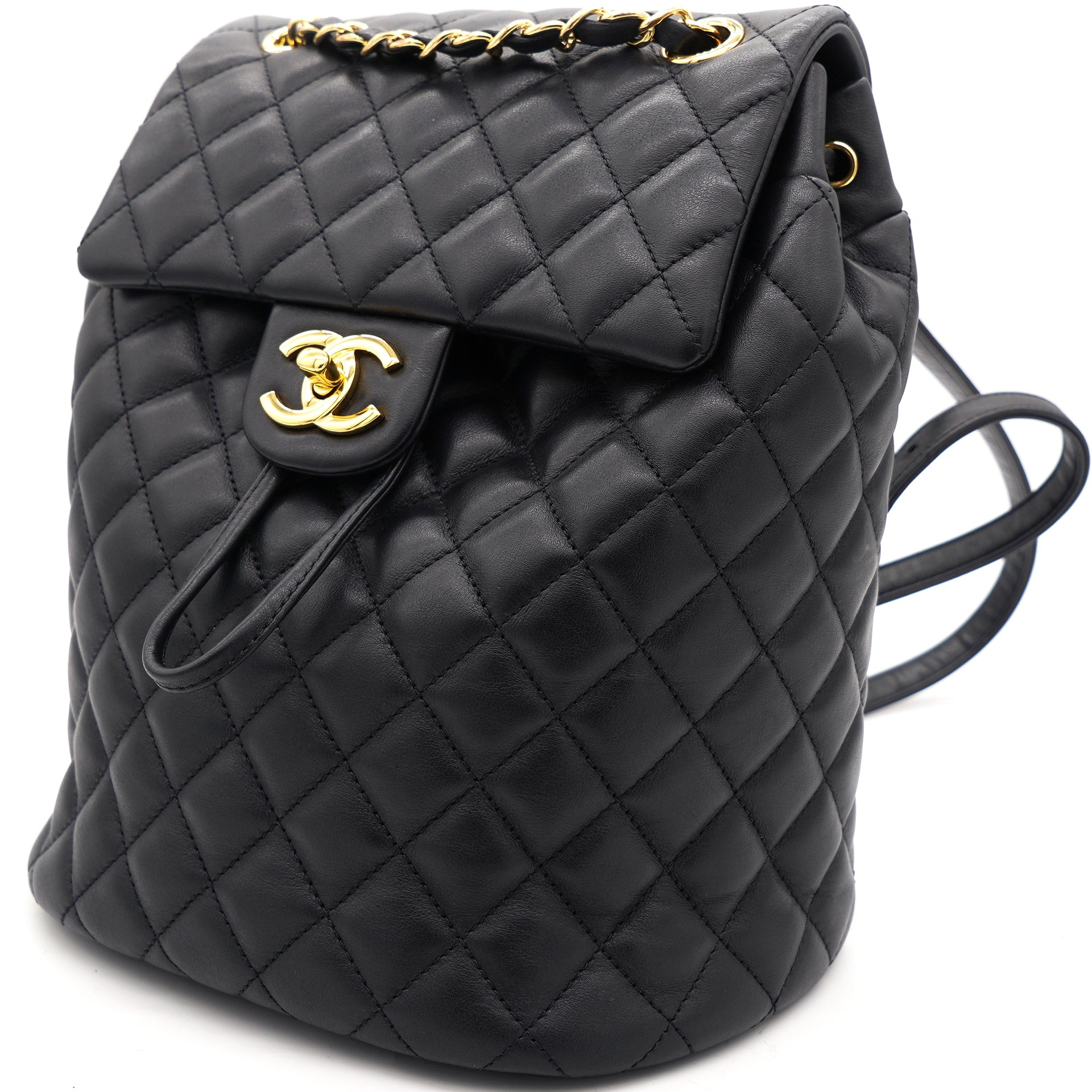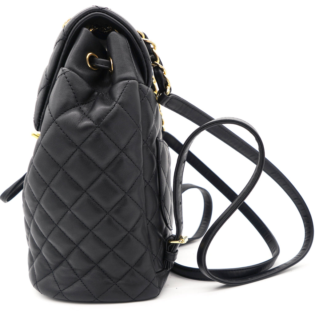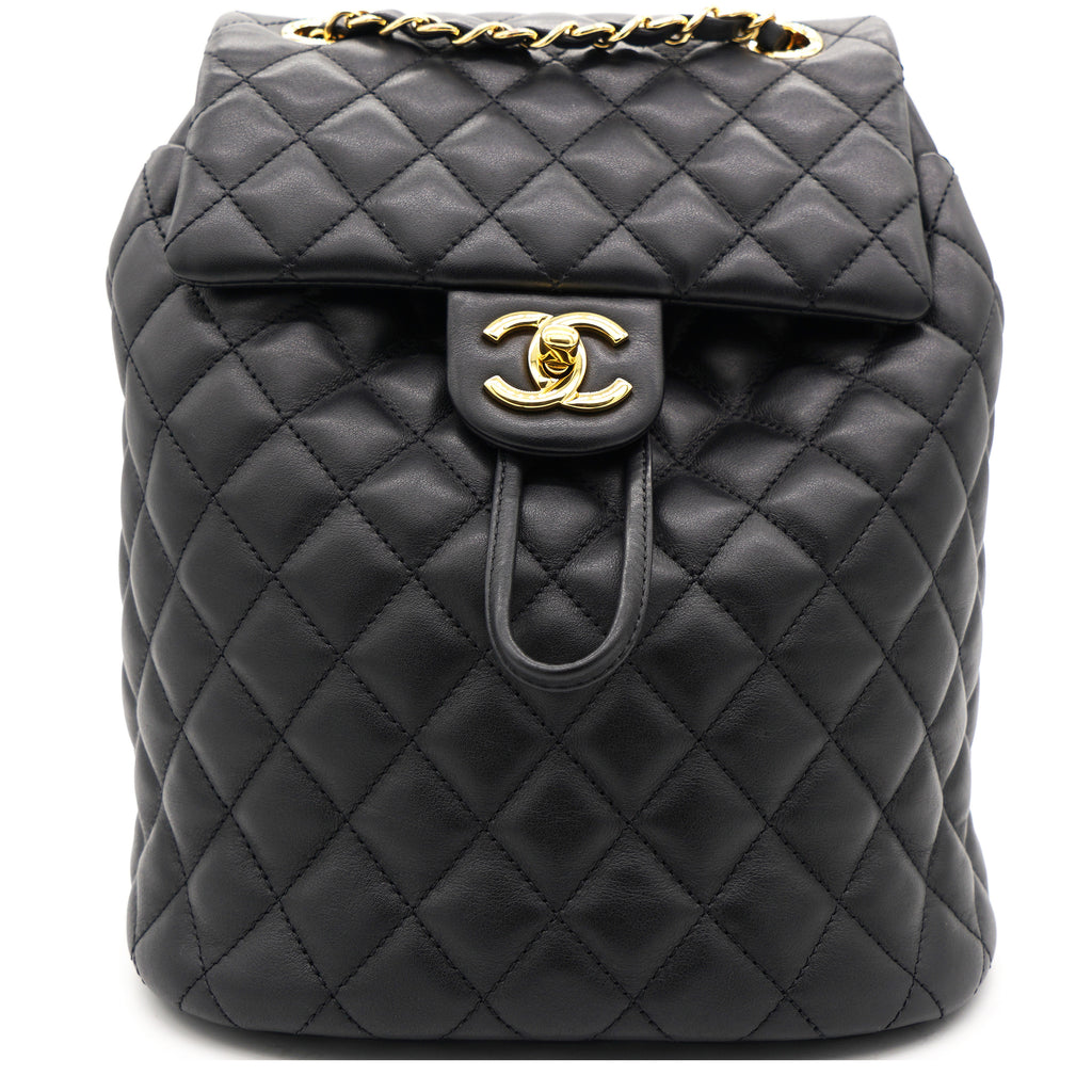 | This stylish backpack is beautifully crafted of soft and smooth diamond-quilted calfskin leather in black. It features polished silver chain link leather threaded shoulder straps, an exterior rear patch pocket, a facing external flap that opens with a polished silver Chanel CC turn lock and an open-top that closes with a cinch cord. |