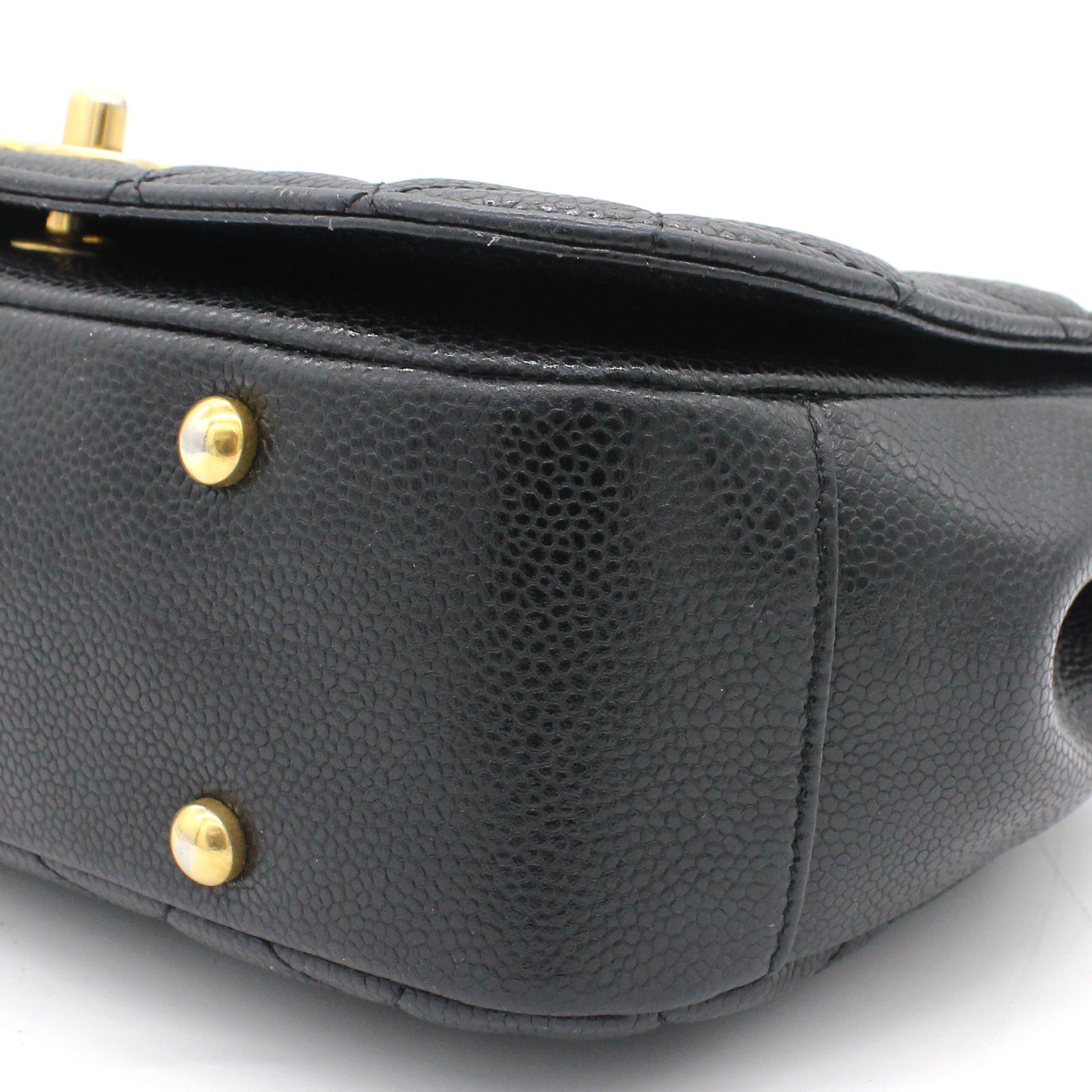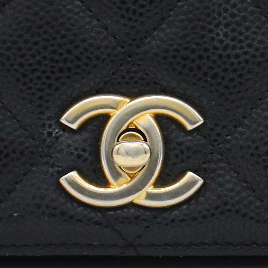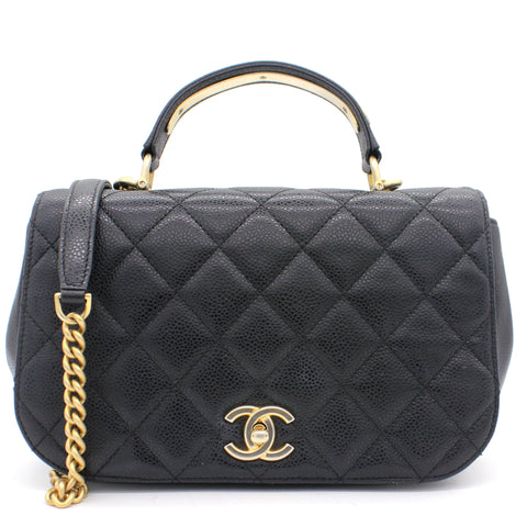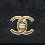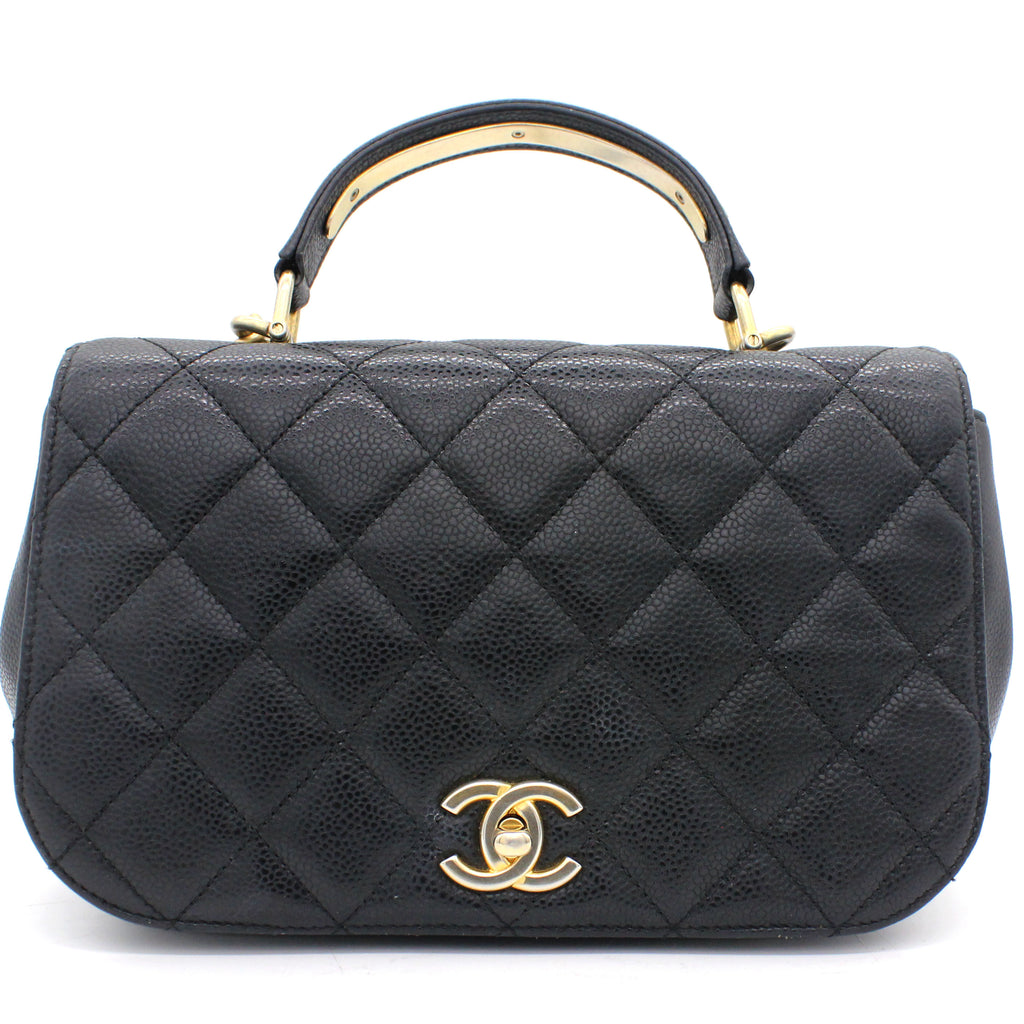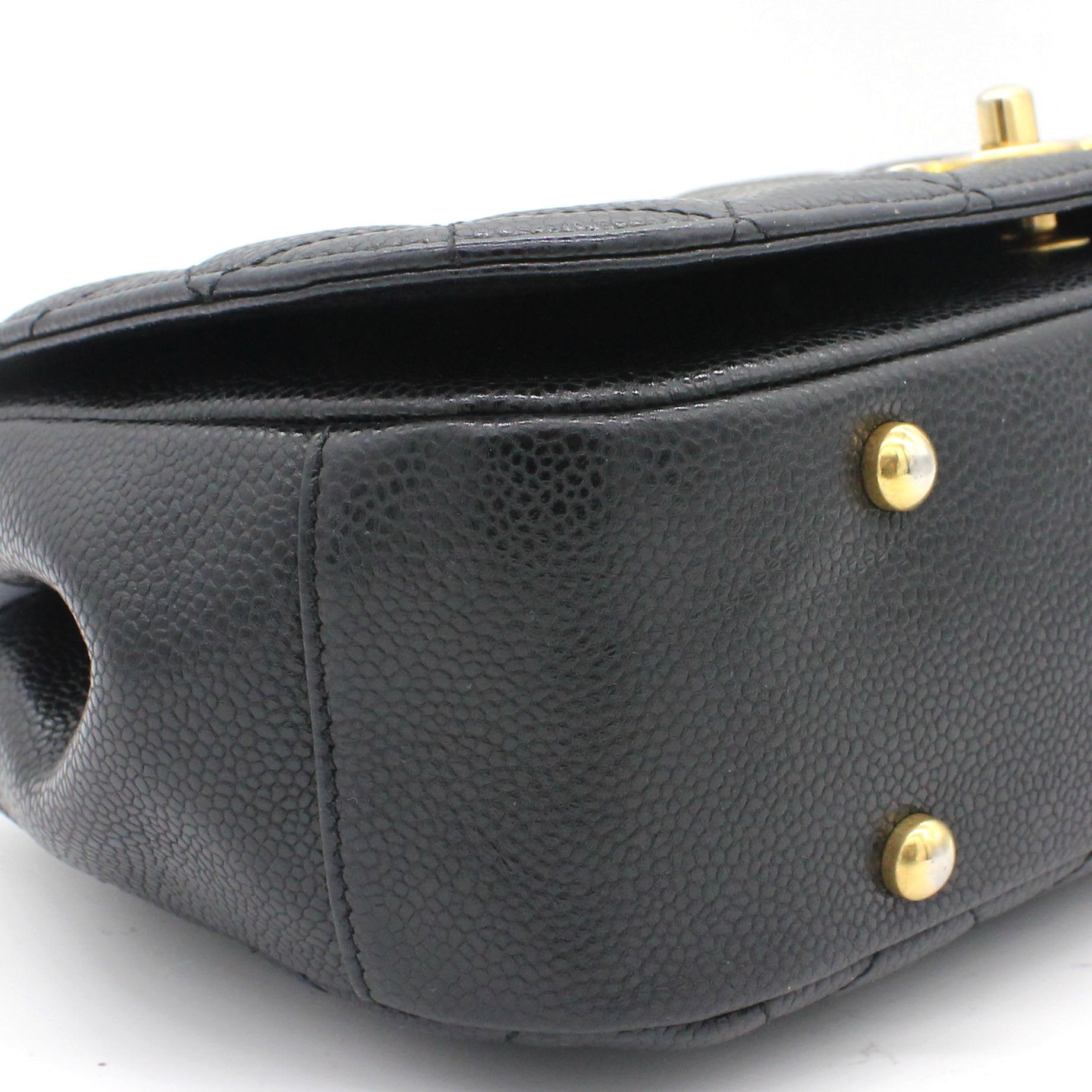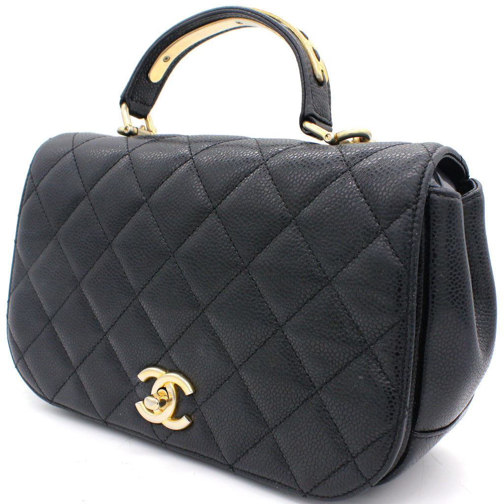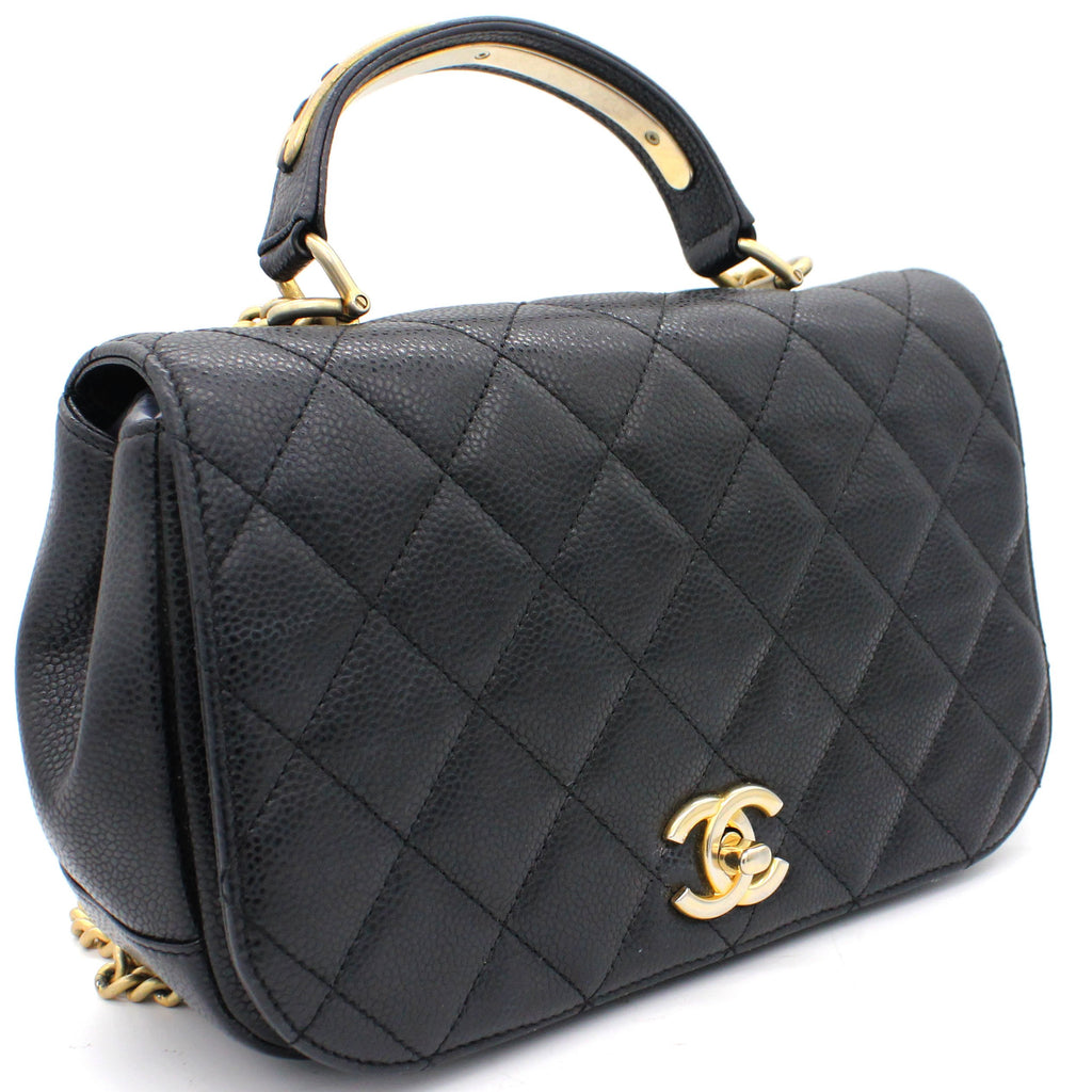 | This versatile crossbody features diamond quilted textured caviar leather and aged brass hardware. The top handle is accented by a metal bar with a raised CC logo, and the crossbody shoulder strap features a long gold chain with a leather shoulder pad. The front features a full flap that opens with a CC turn lock to a grosgrain fabric interior and a zippered pocket. |