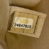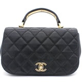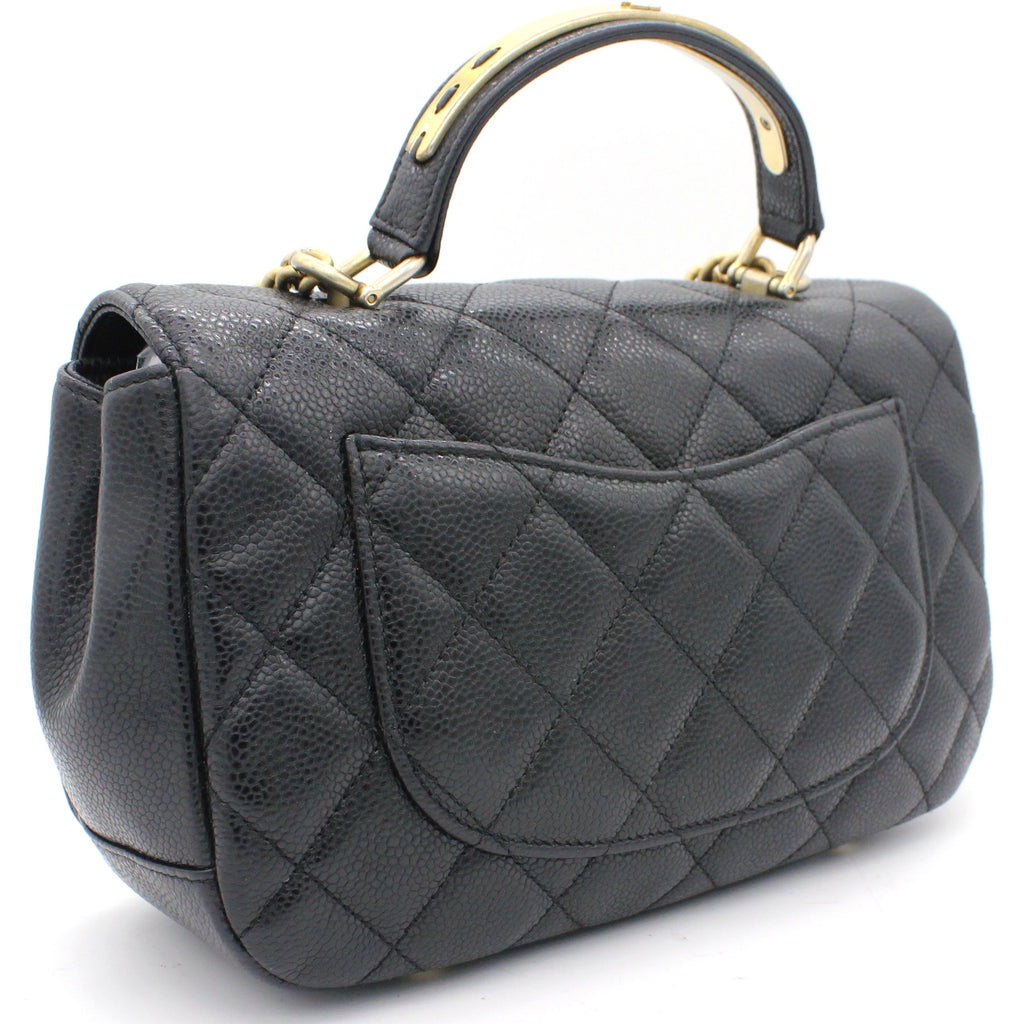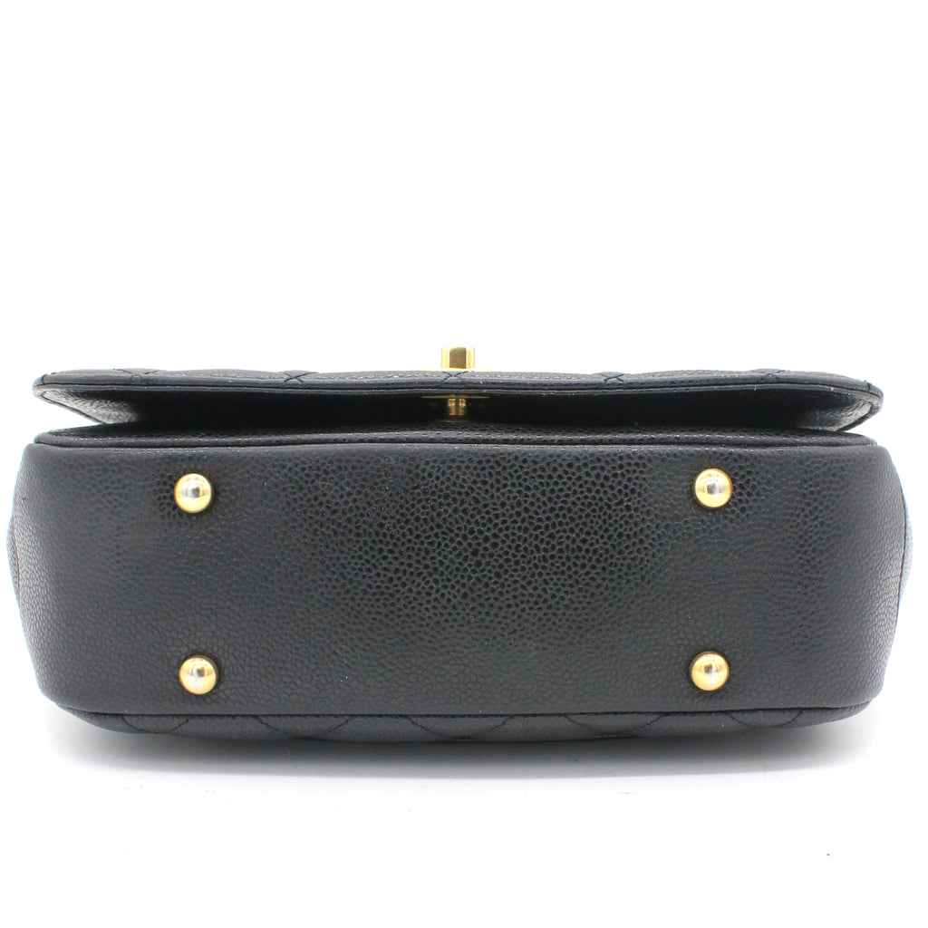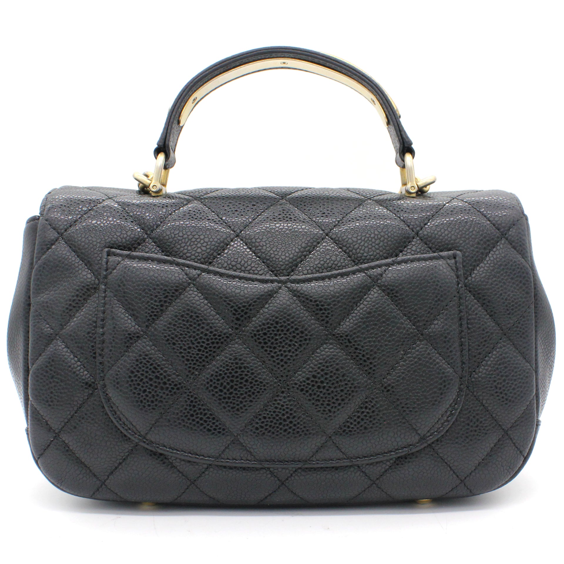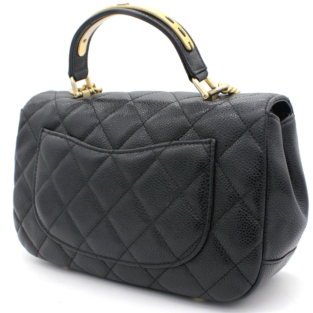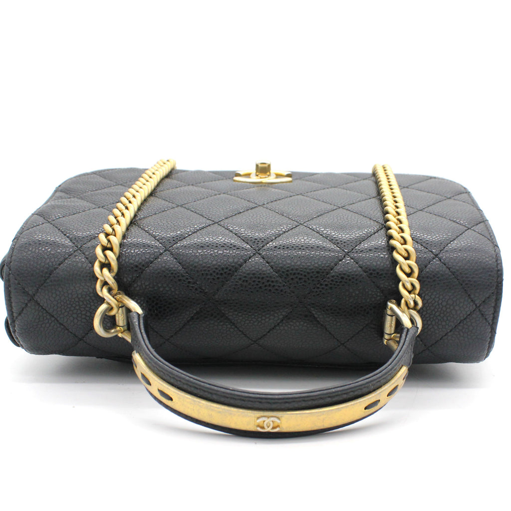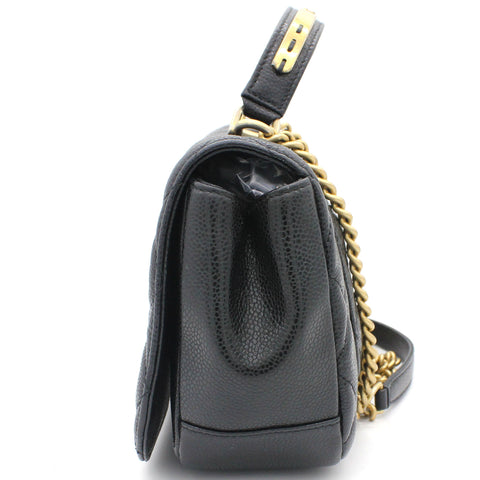 | This versatile crossbody features diamond quilted textured caviar leather and aged brass hardware. The top handle is accented by a metal bar with a raised CC logo, and the crossbody shoulder strap features a long gold chain with a leather shoulder pad. The front features a full flap that opens with a CC turn lock to a grosgrain fabric interior and a zippered pocket. |