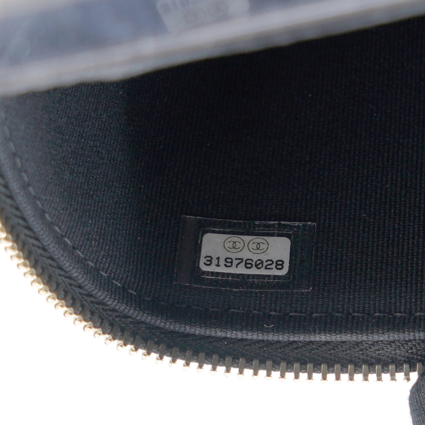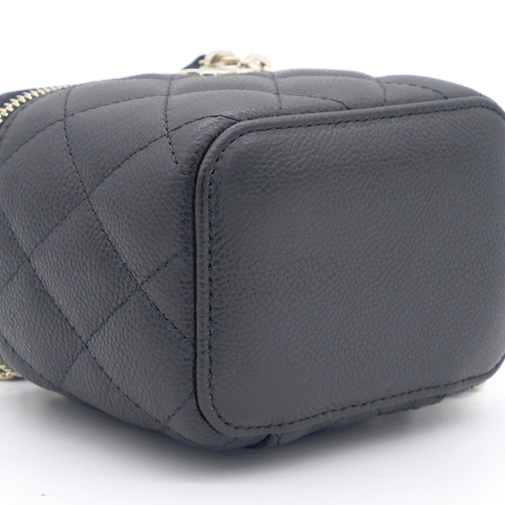 | This stylish crossbody is crafted of luxurious caviar leather in black. The bag features a leather threaded gold chain-link shoulder strap and gold hardware. The handbag features a 3/4 wrap-around zipper that opens to a fabric interior. This is a stylish mini shoulder bag for all of your needs, from Chanel! |