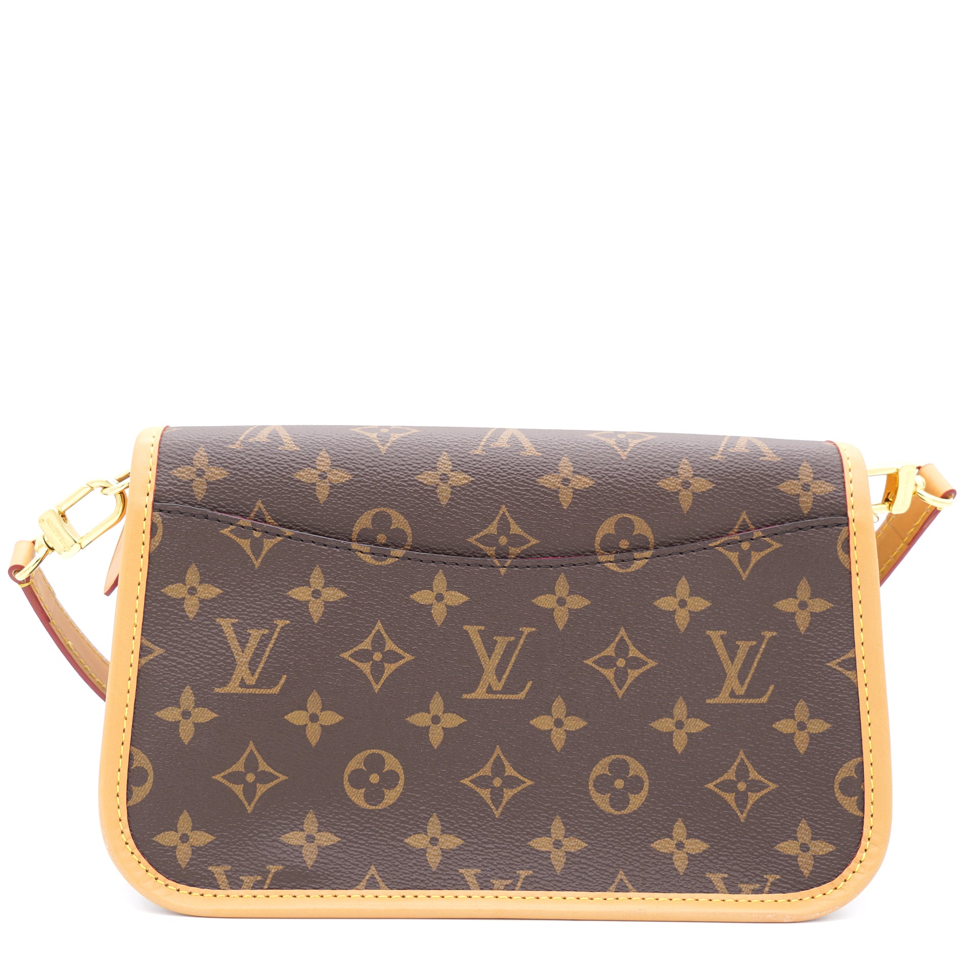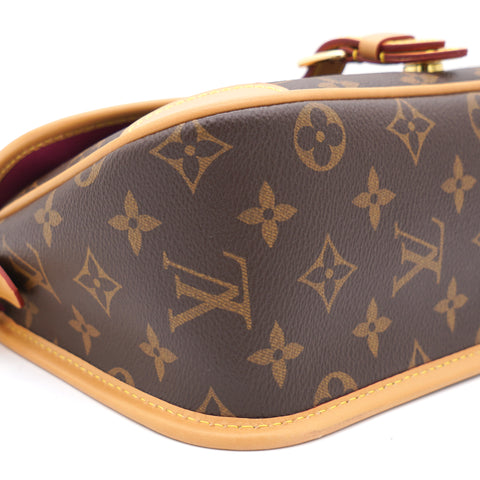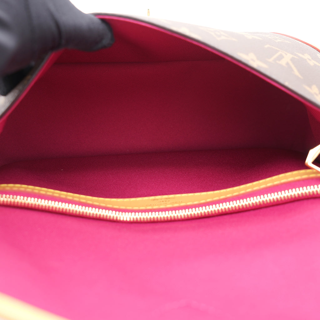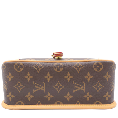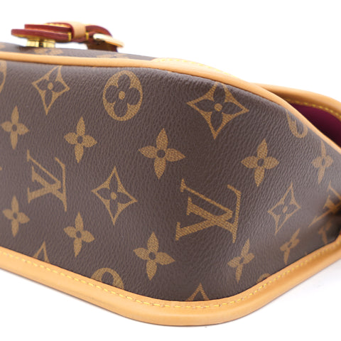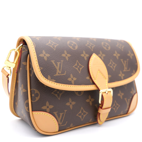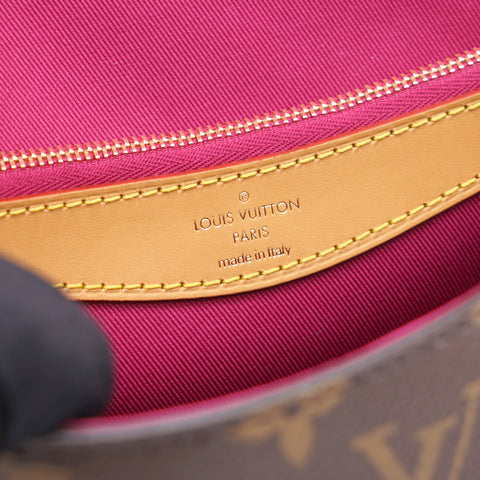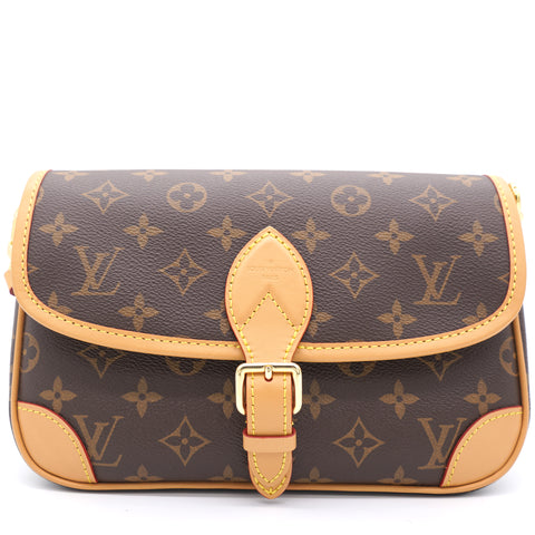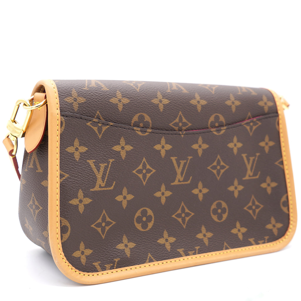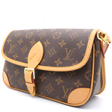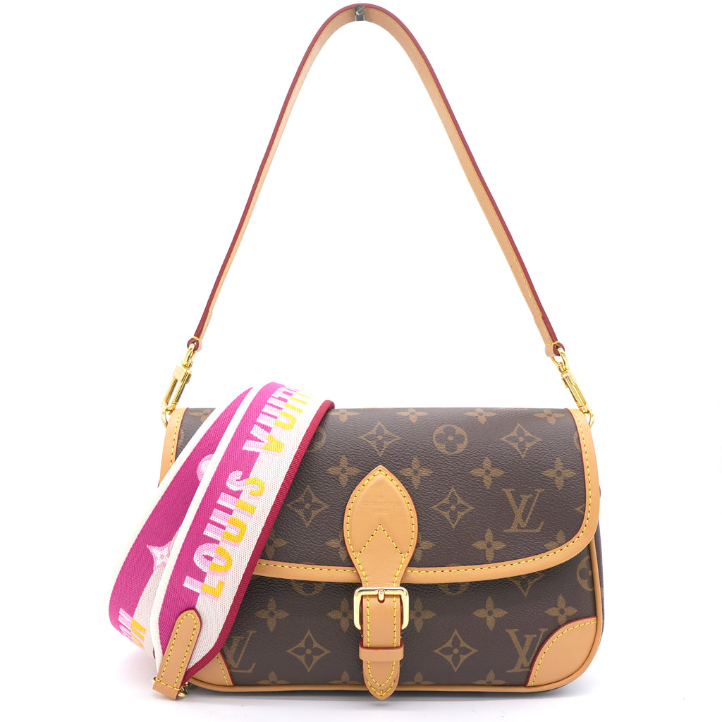 | The Diane satchel in Monogram canvas revisits a classic model from the 90s, combining such vintage details as leather corners and an archival-inspired buckle with the modern functionality of smart pockets and a well-organized interior. The exclusive wide jacquard strap reverses from a bold Louis Vuitton signature to a subtle Monogram Flower motif. |