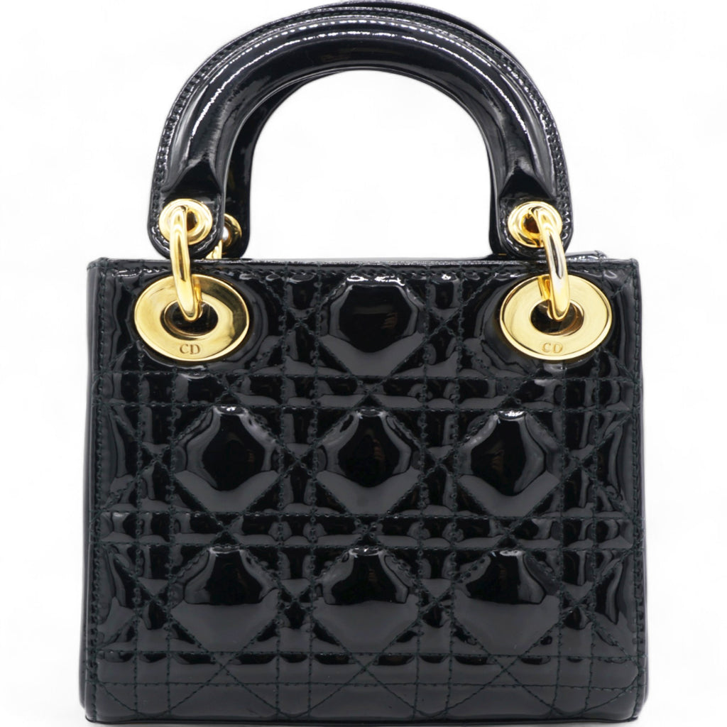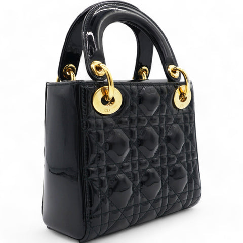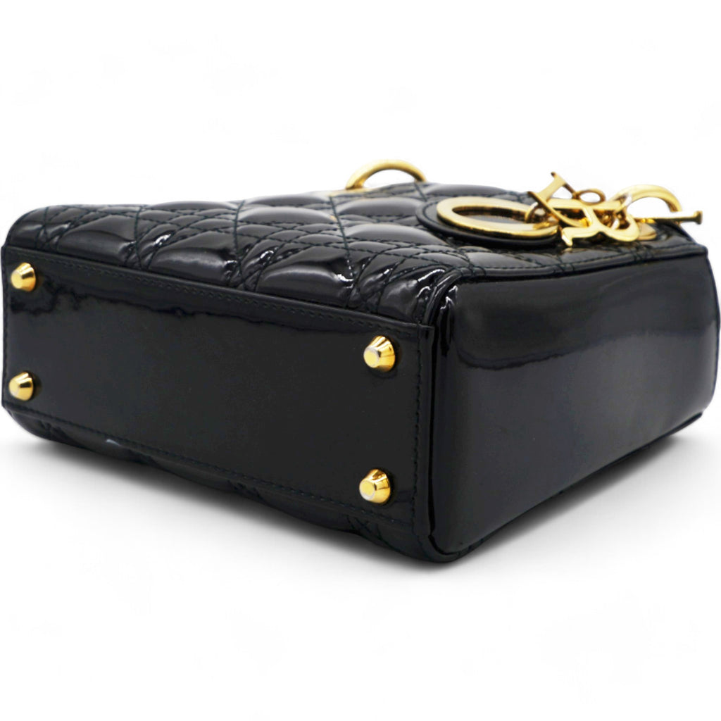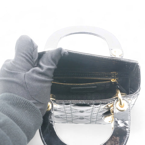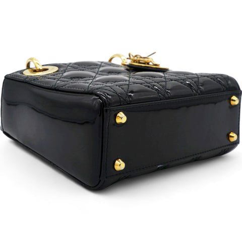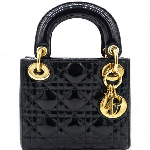| This delightful mini tote is crafted of black patent leather with an attractive geometric embroidered quilted design. The bag has matching black leather handles and polished gold hardware including a hanging "Dior" charm. The interior is a black microfiber interior with a zipper pocket. |