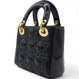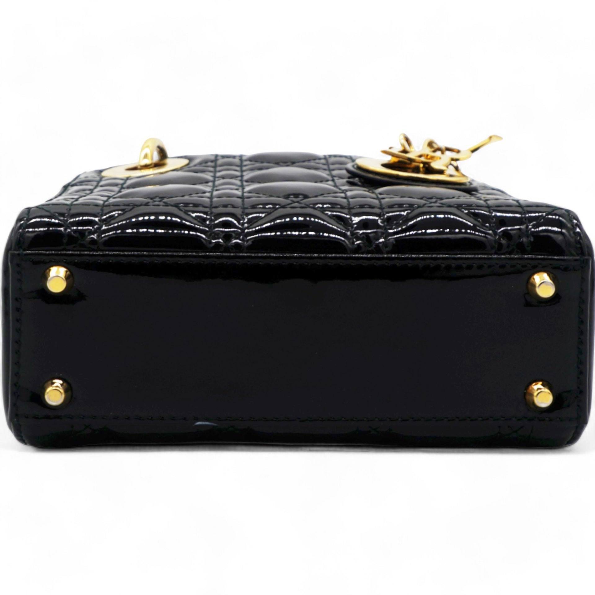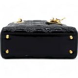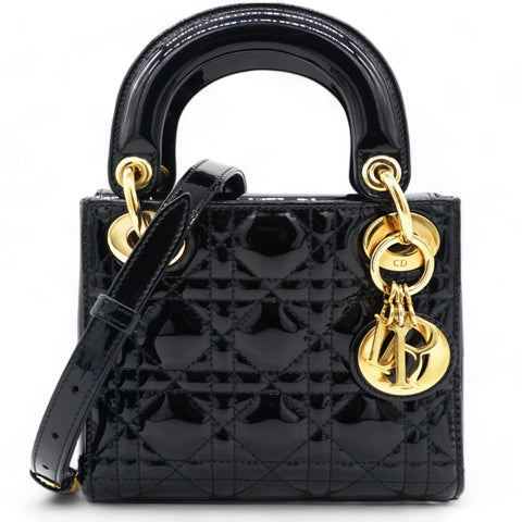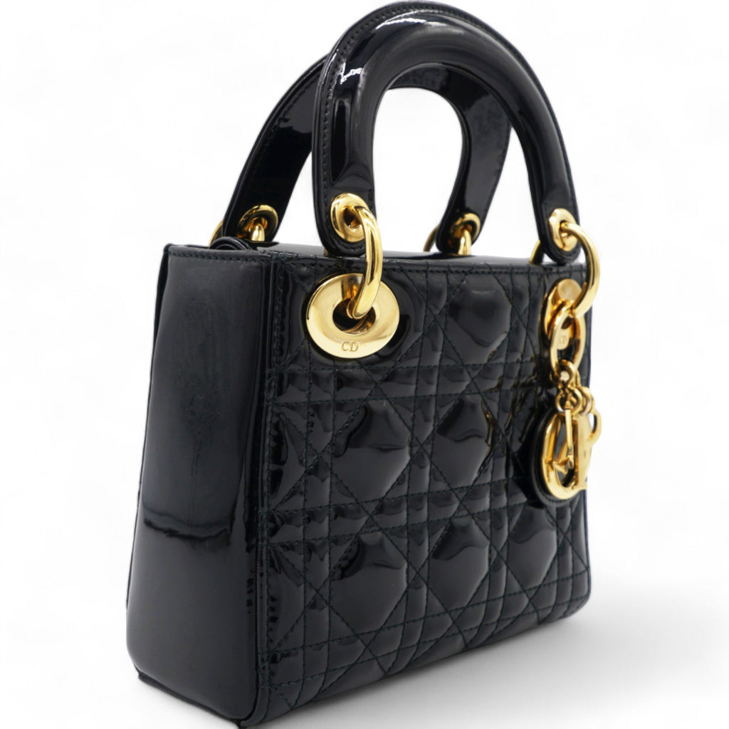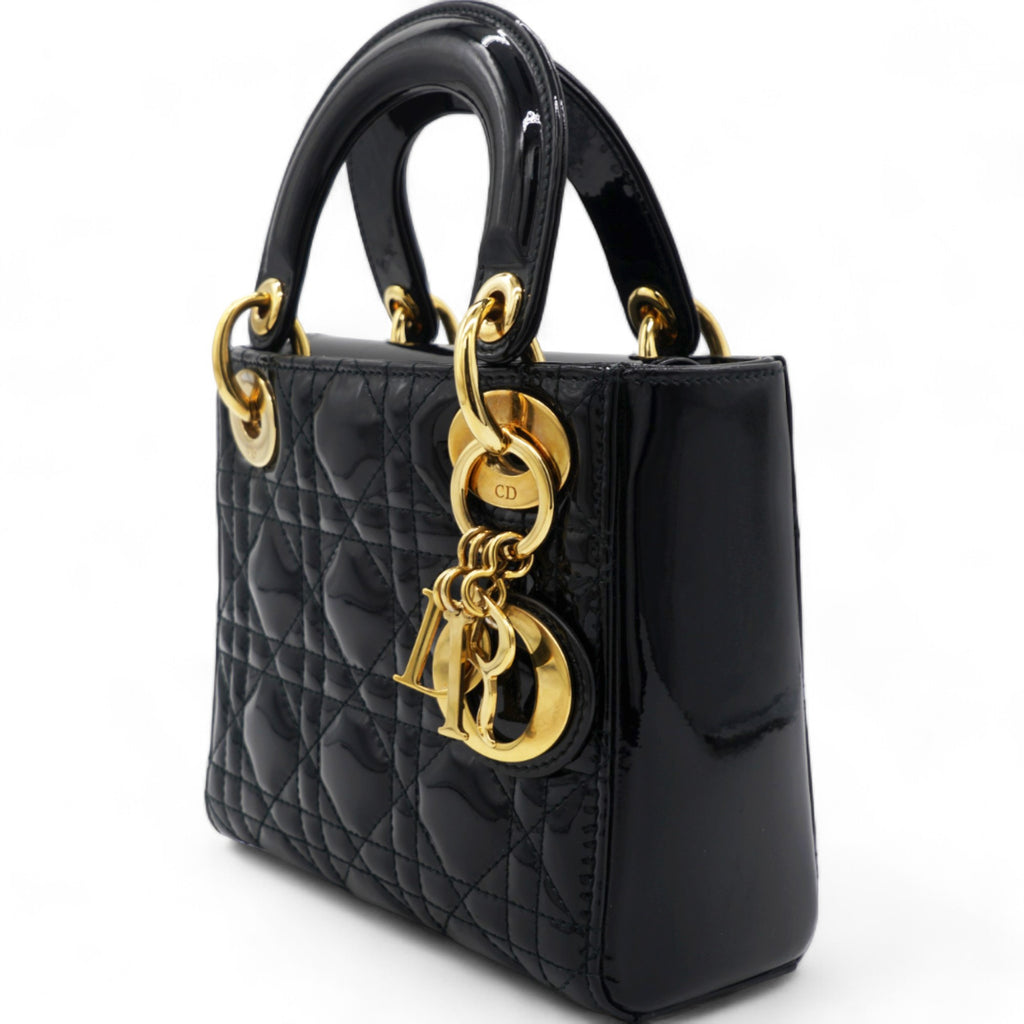 | This delightful mini tote is crafted of black patent leather with an attractive geometric embroidered quilted design. The bag has matching black leather handles and polished gold hardware including a hanging "Dior" charm. The interior is a black microfiber interior with a zipper pocket. |