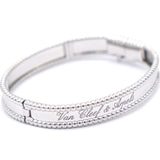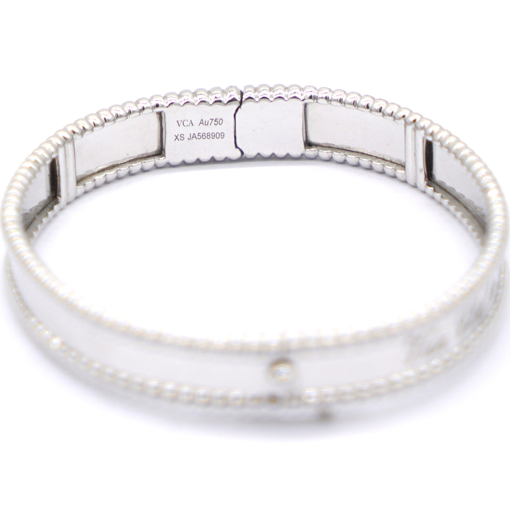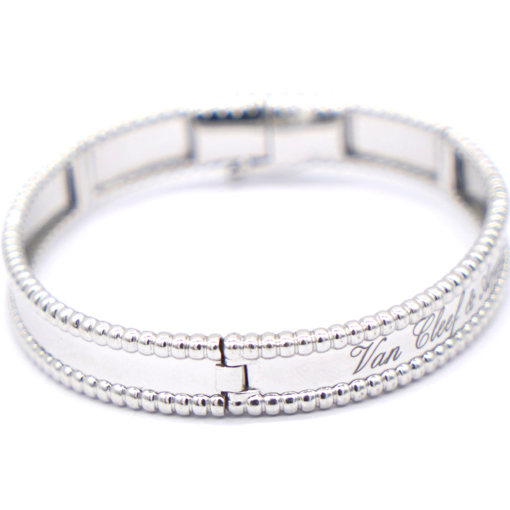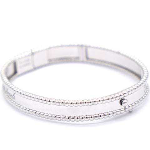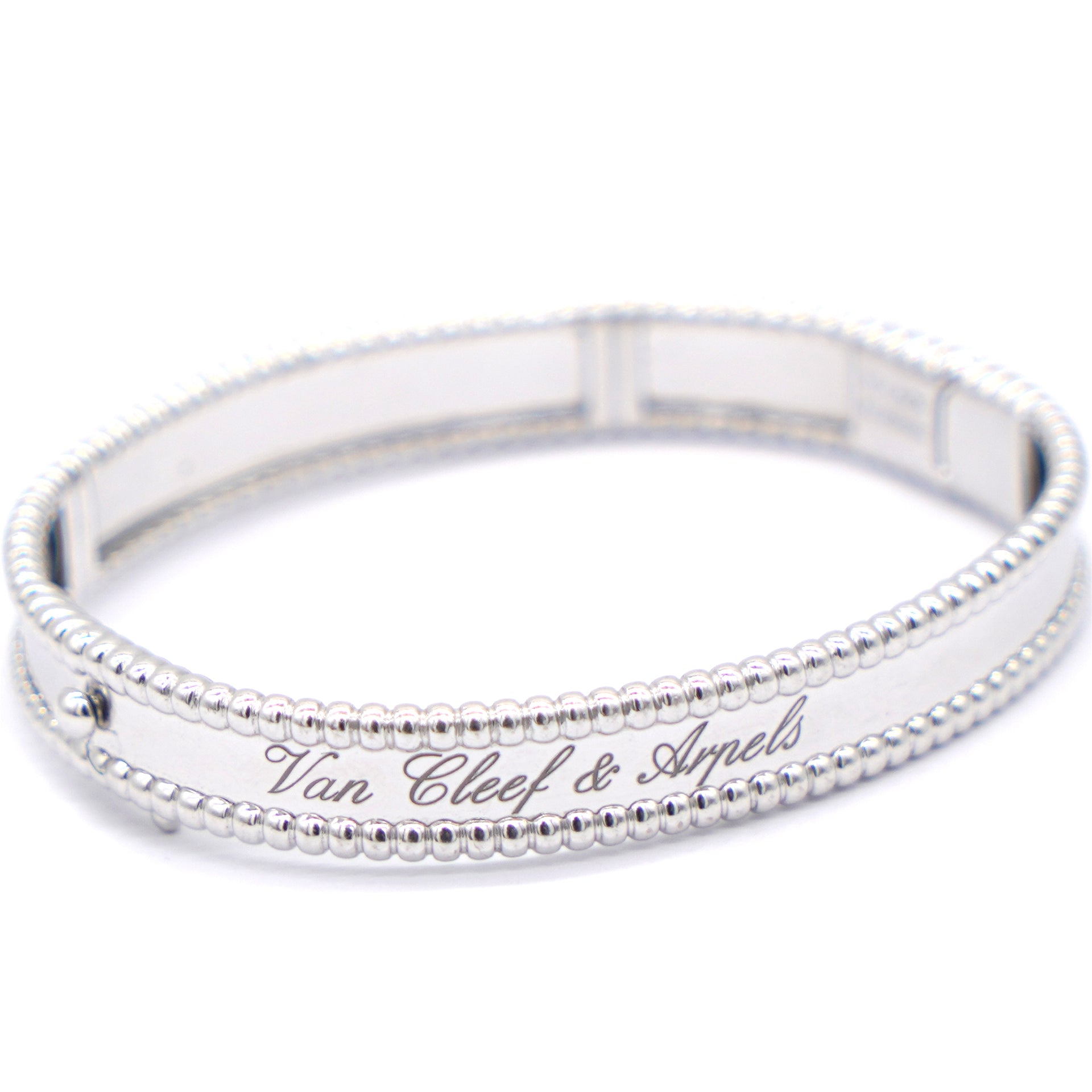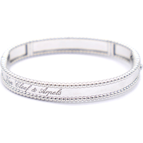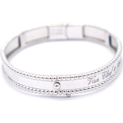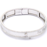 | While it may be a dream for many to own a bracelet as beautiful as this one from Van Cleef & Arpels, you can proudly have this very dream sitting on your wrist. Finely created from 18k white gold, the bracelet is visually stunning. Set beautifully on the contours are the Perlée beads that exemplify the brand's fine collection of jewelry and the center flaunts the brand label engravings. |