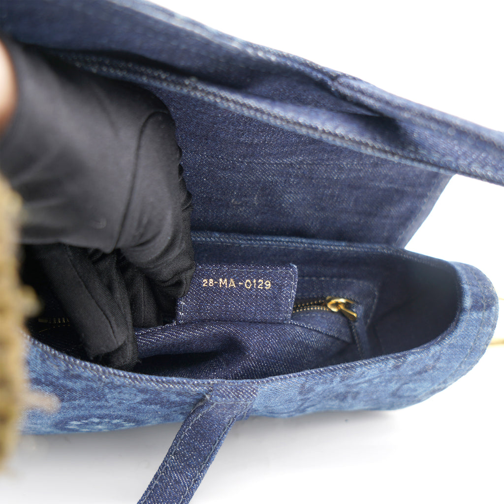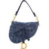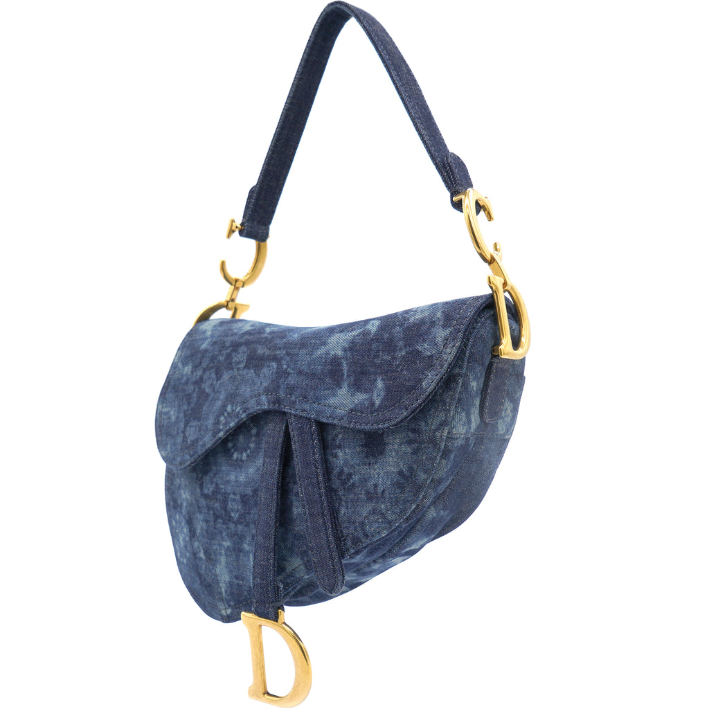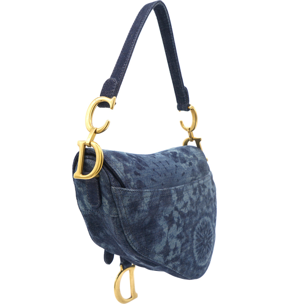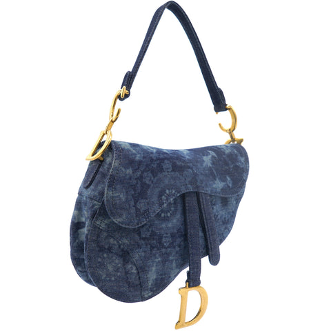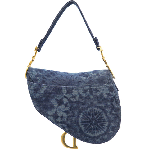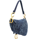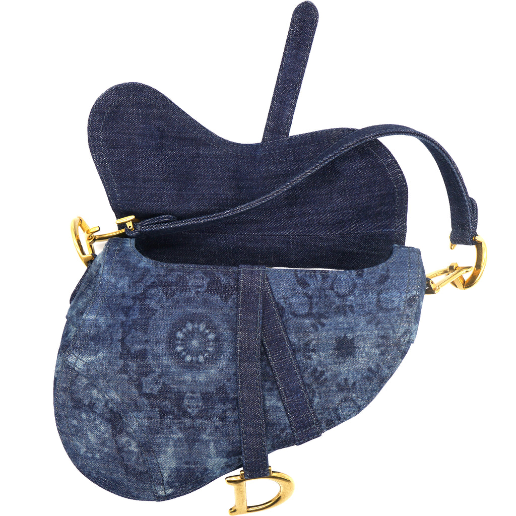 | Signature Dior Saddle Bag in denim embroidered with a blue KaléiDiorscopic pattern, aged gold-colored jewelry. Limited edition from 2019. worn on the shoulder or hand. |