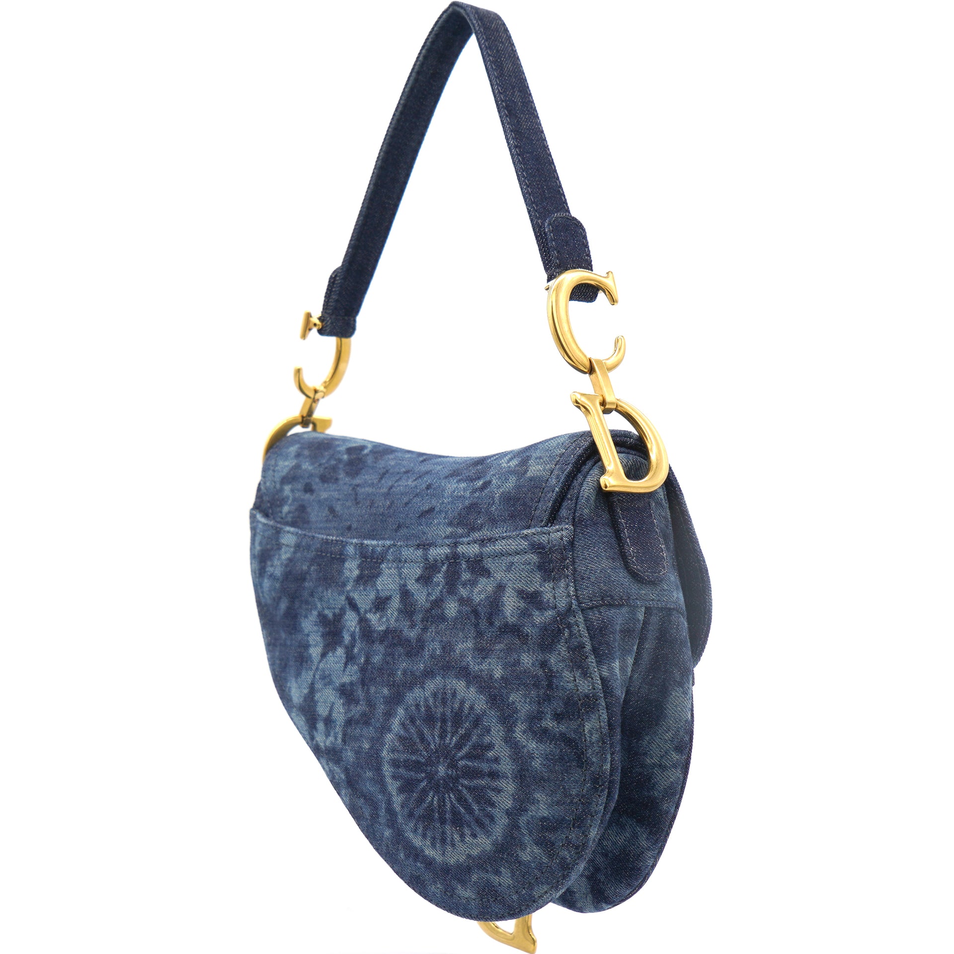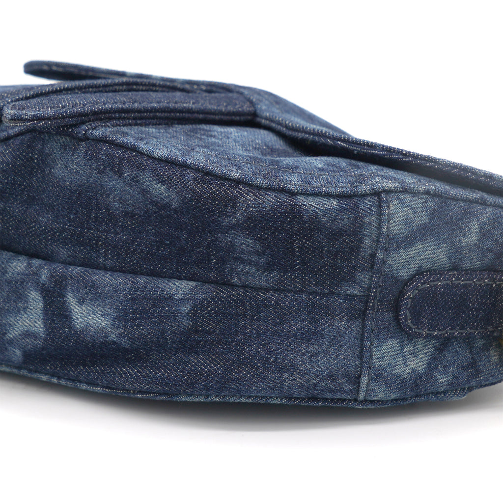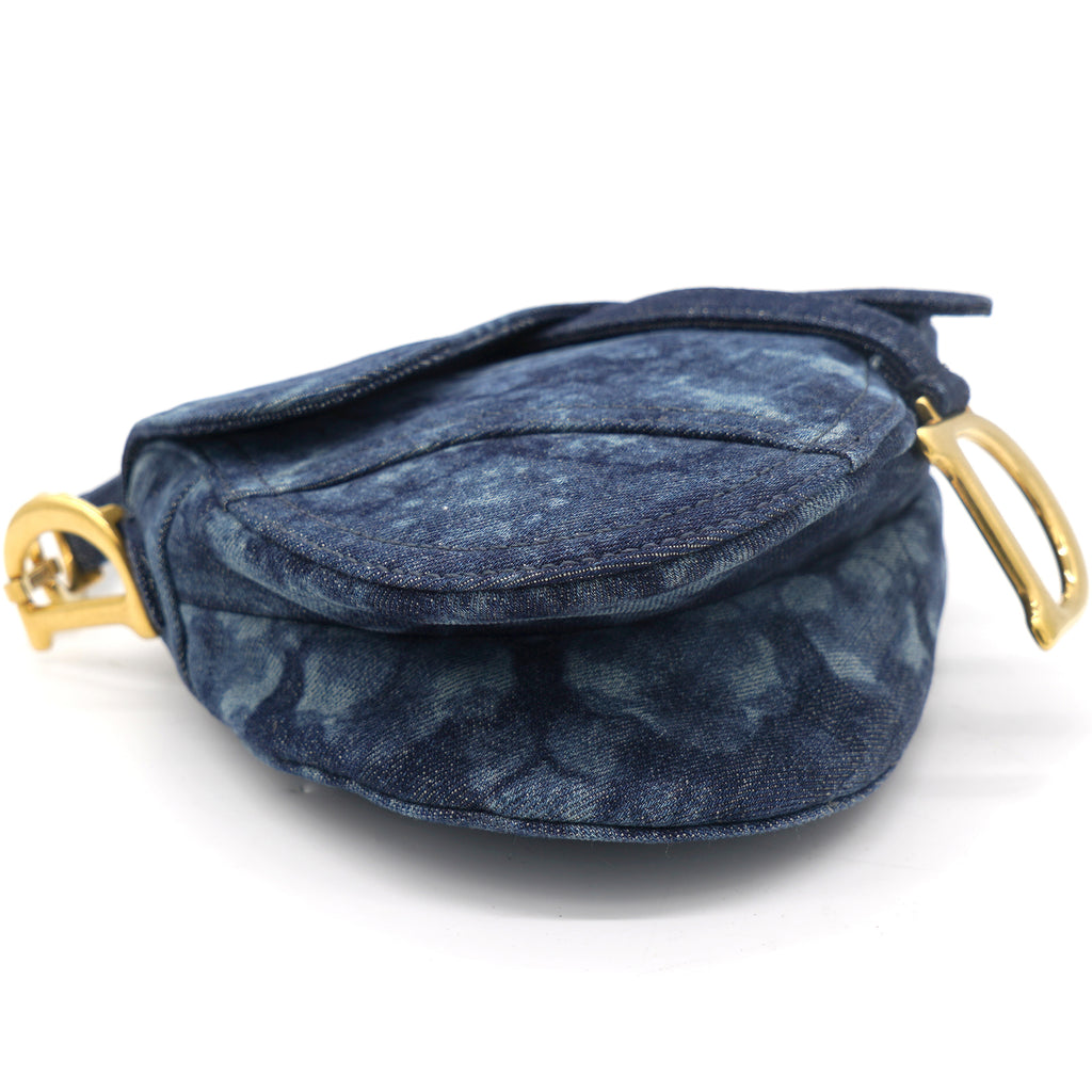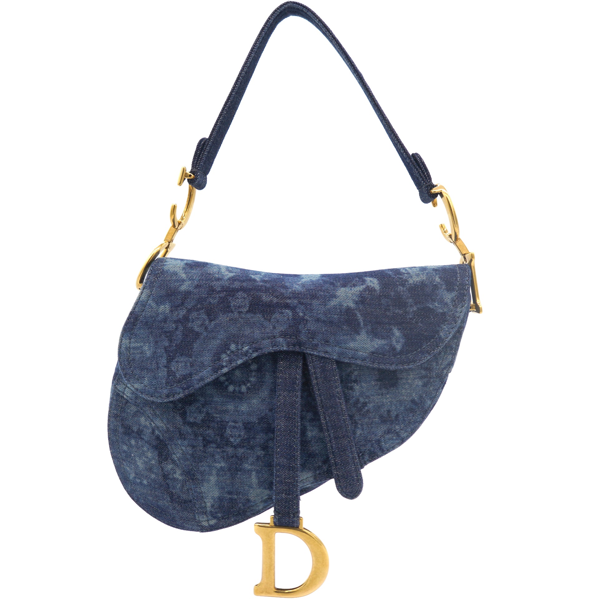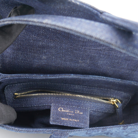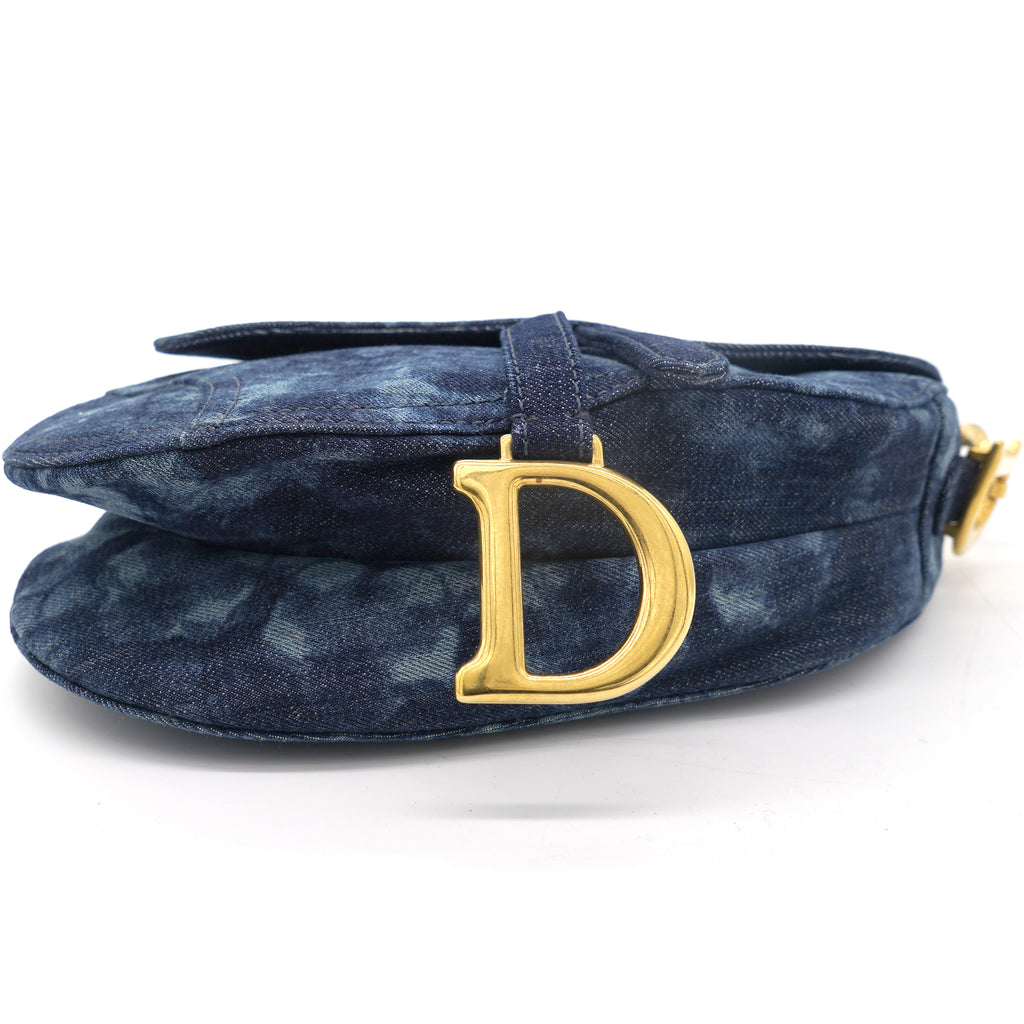 | Signature Dior Saddle Bag in denim embroidered with a blue KaléiDiorscopic pattern, aged gold-colored jewelry. Limited edition from 2019. worn on the shoulder or hand. |