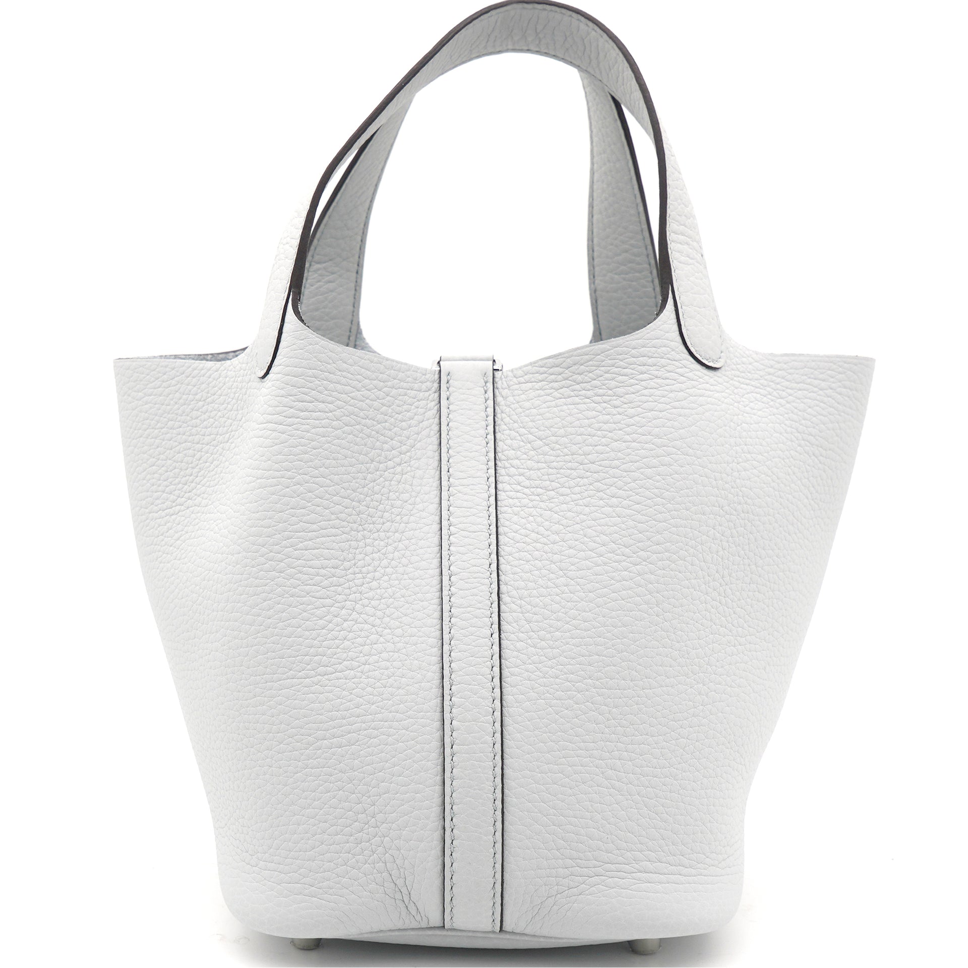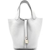 | This chic tote is crafted of textured clemence calfskin leather in light blue. This bucket style bag features a unique one piece reinforced design with leather top handles and a closure strap that can be secured by a palladium padlock. This opens to a spacious blue suede interior with a textured leather base. |