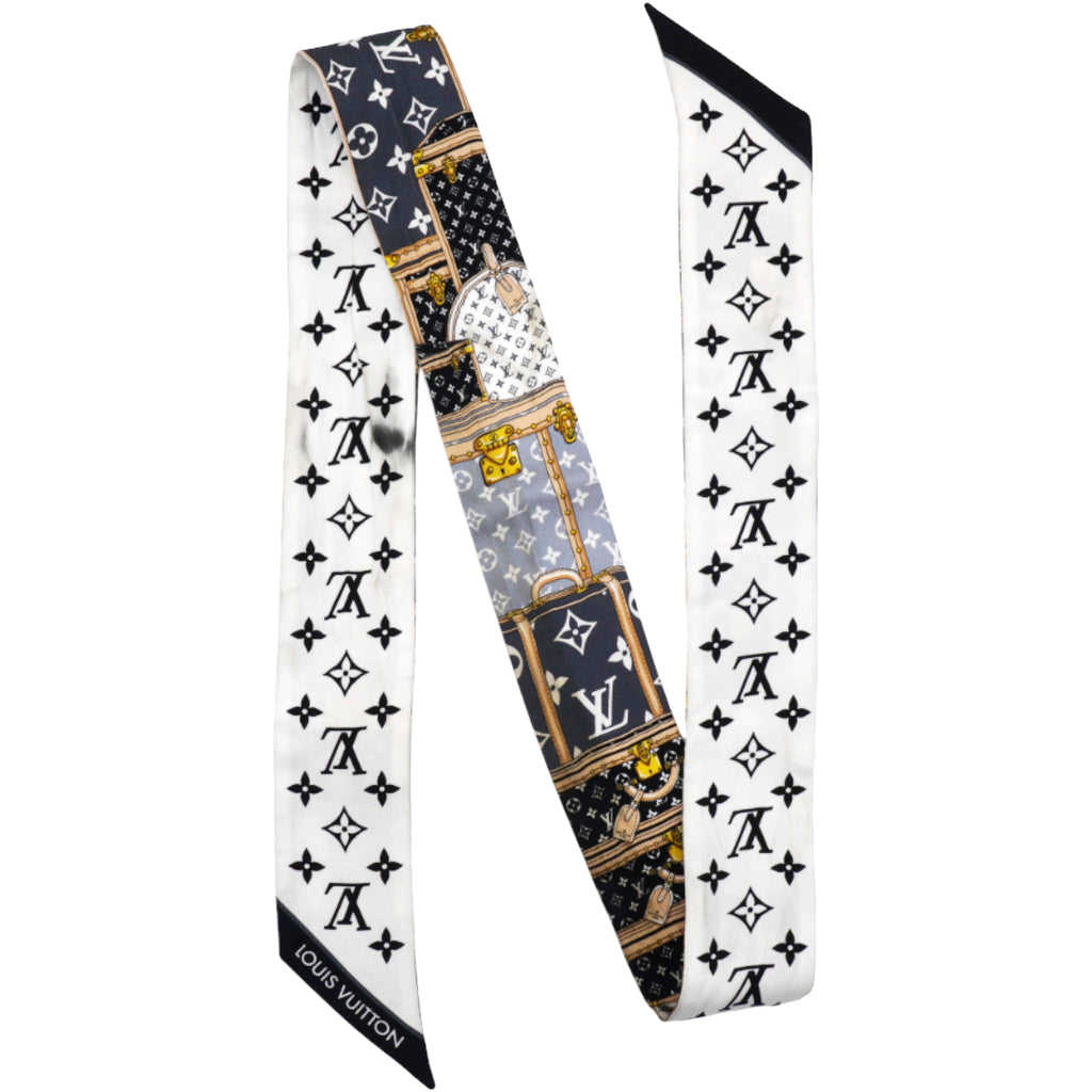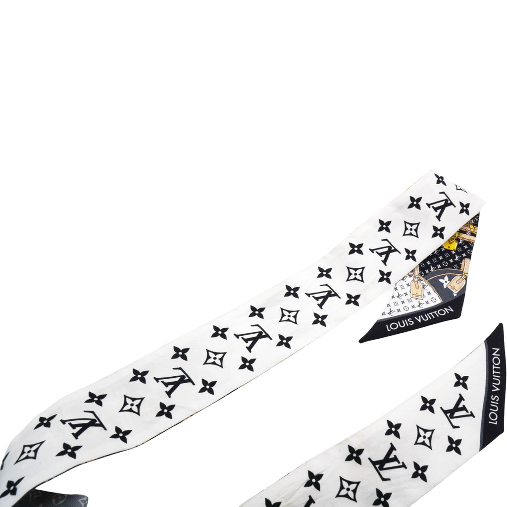 | The Louis Vuitton Bandeau BB Let's Go scarf is a stylish accessory crafted from 100% silk, featuring a classic black and white design, this scarf is versatile for various styling options. |