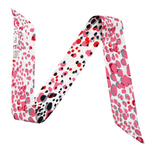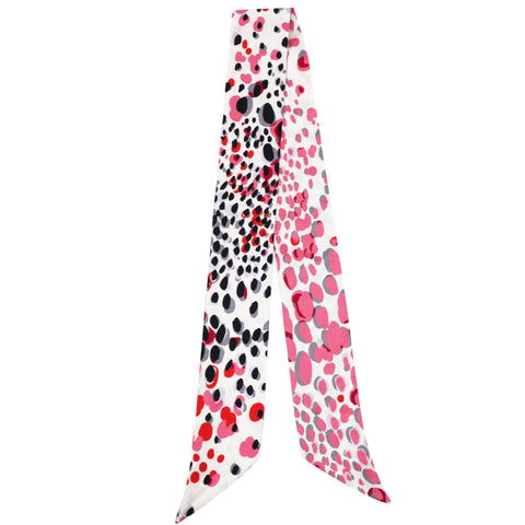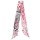 This chic Mitzah scarf features a bold leopard spot print in striking black and pink hues, crafted from luxurious silk. Its slim, versatile design makes it perfect for tying around the neck, accessorizing a handbag, or wearing as a stylish headband. A statement piece that adds a touch of elegance and flair to any outfit.