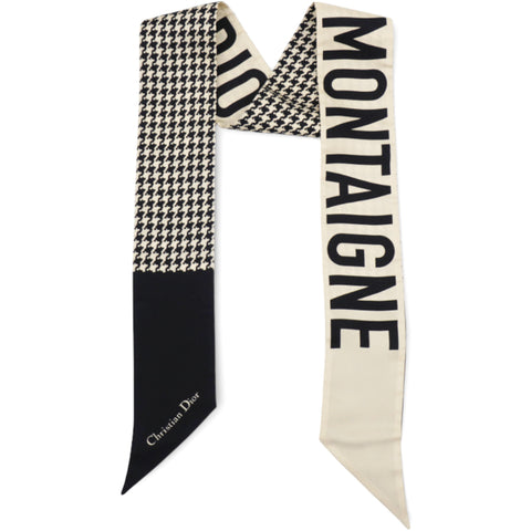 | This Dior bandeau is crafted from silk and features the 30 Montaigne print in black and beige tones. The elongated, narrow shape allows flexible styling around the neck, hair, or handbag handle. Designed to add graphic interest, it offers a versatile accessory option rooted in recognizable house motifs. |