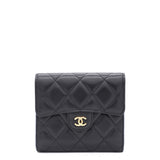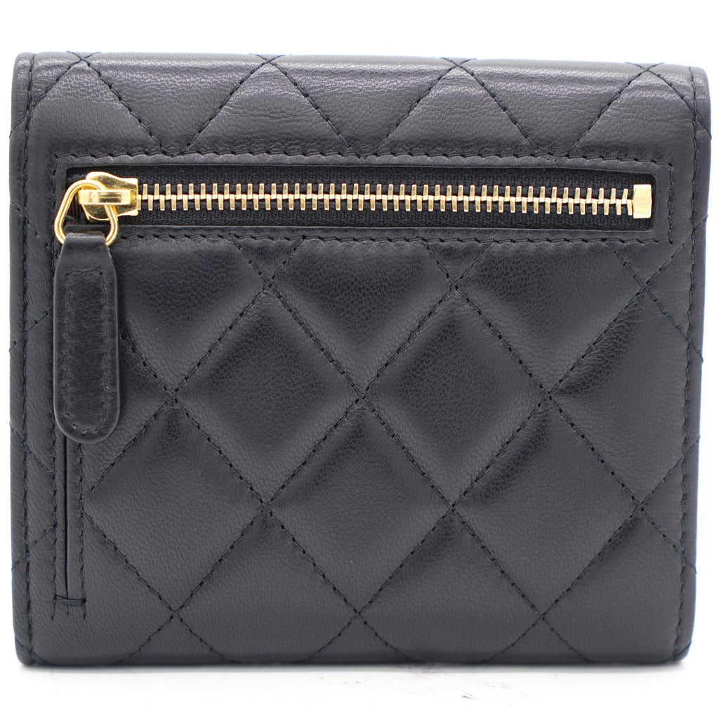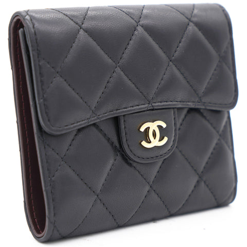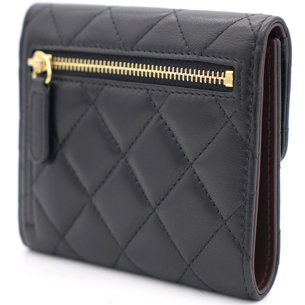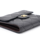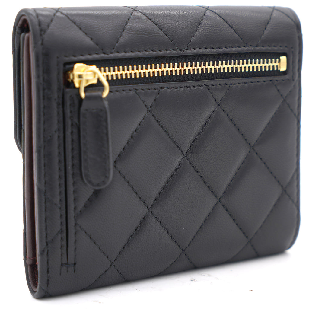 | This gorgeous wallet from the house of Chanel is crafted from leather and carries the signature quilted pattern all over the exterior. Styled with a CC-adorned flap, the wallet is equipped with card slots and a pocket to carry your necessities. Complete with a rear zipped pocket and silver-tone hardware, this wallet is definitely chic and posh. |