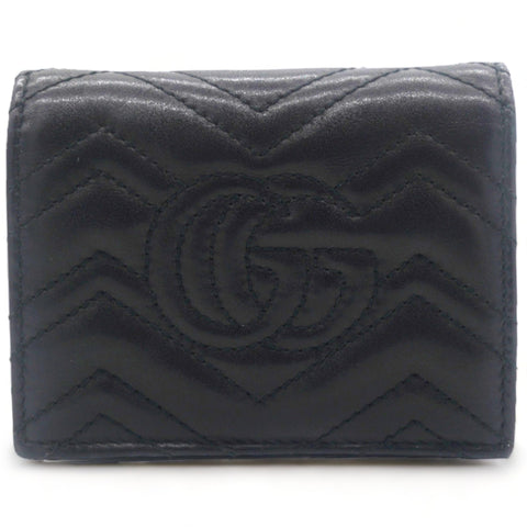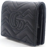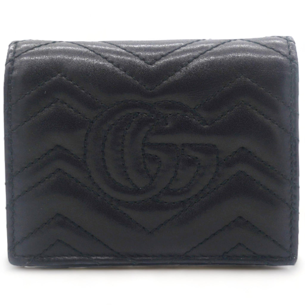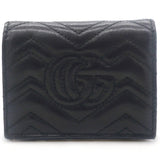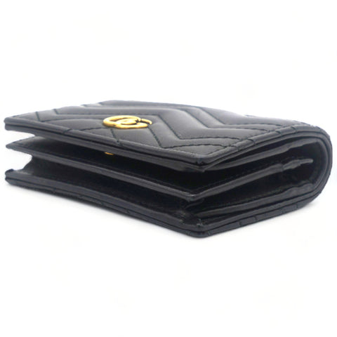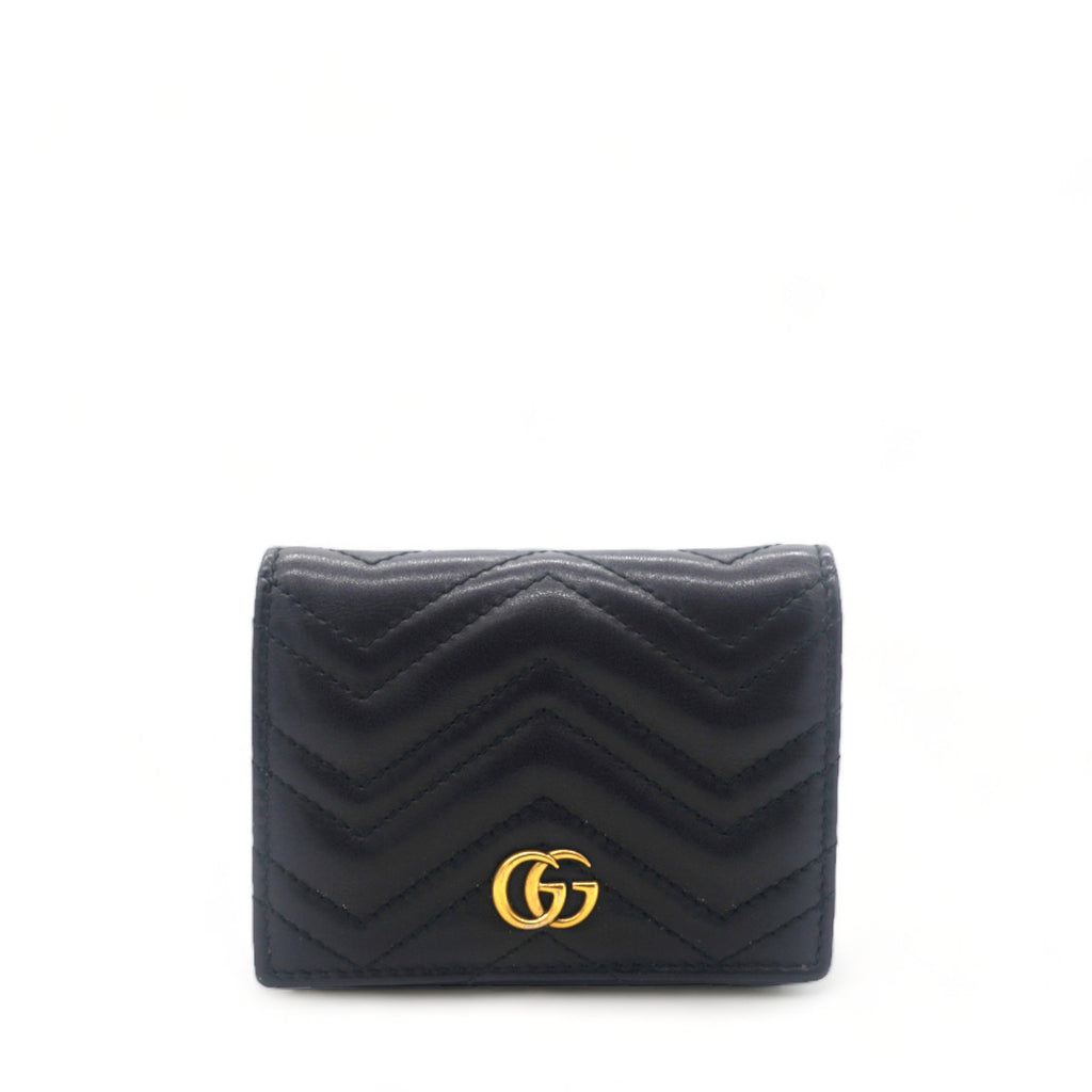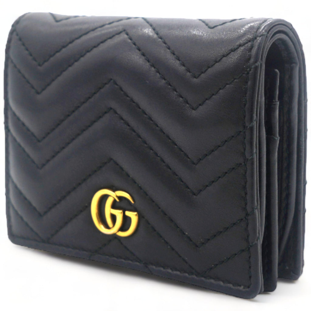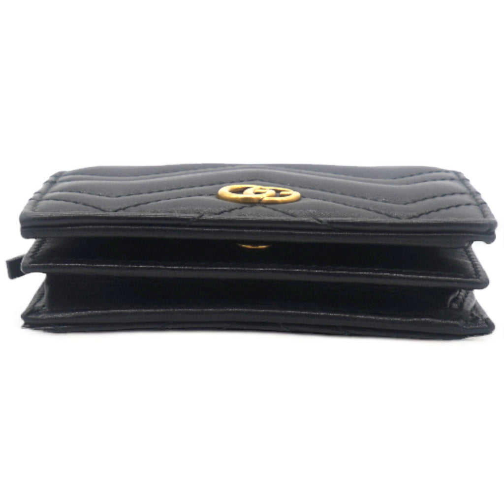 | This stylish card holder is crafted of chevron-quilted calfskin leather in bblack. It features a prominent interlocking aged GG logo on the front and snaps open to a smooth black leather interior with card slots, a patch pocket, and a bill compartment. |