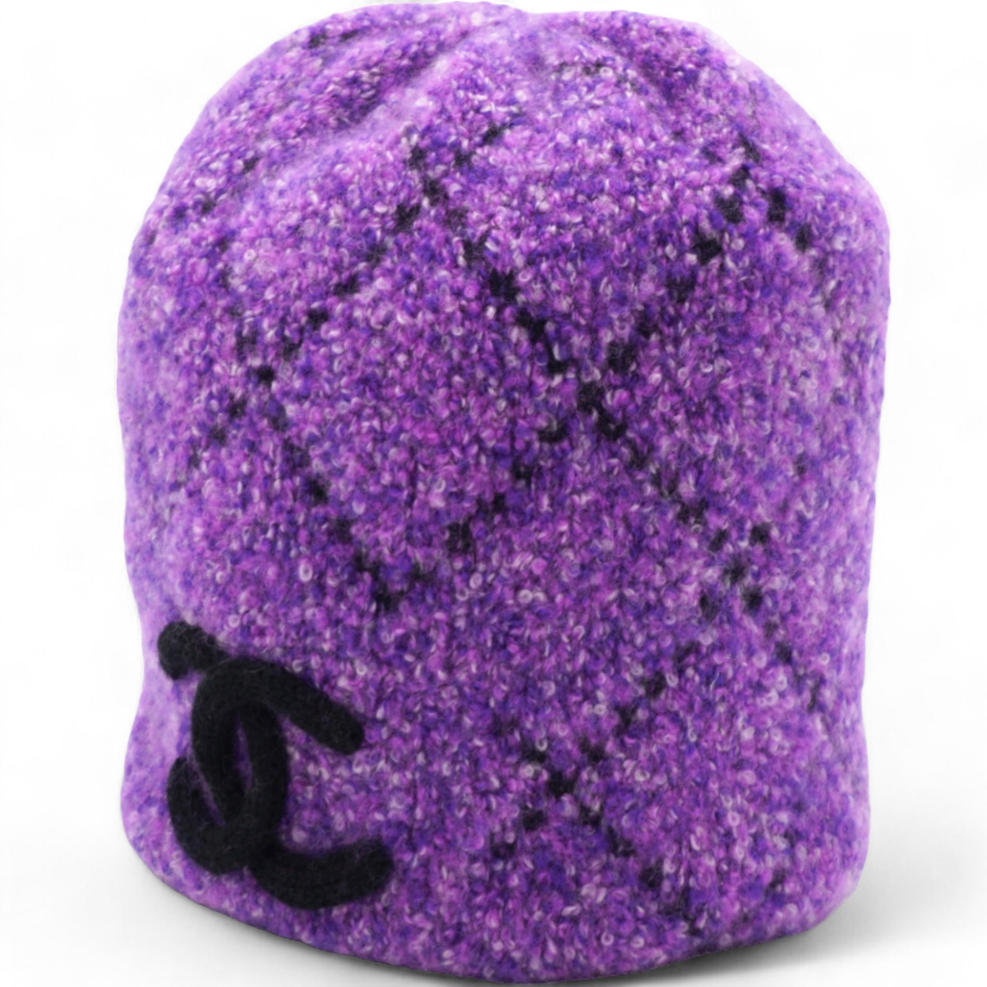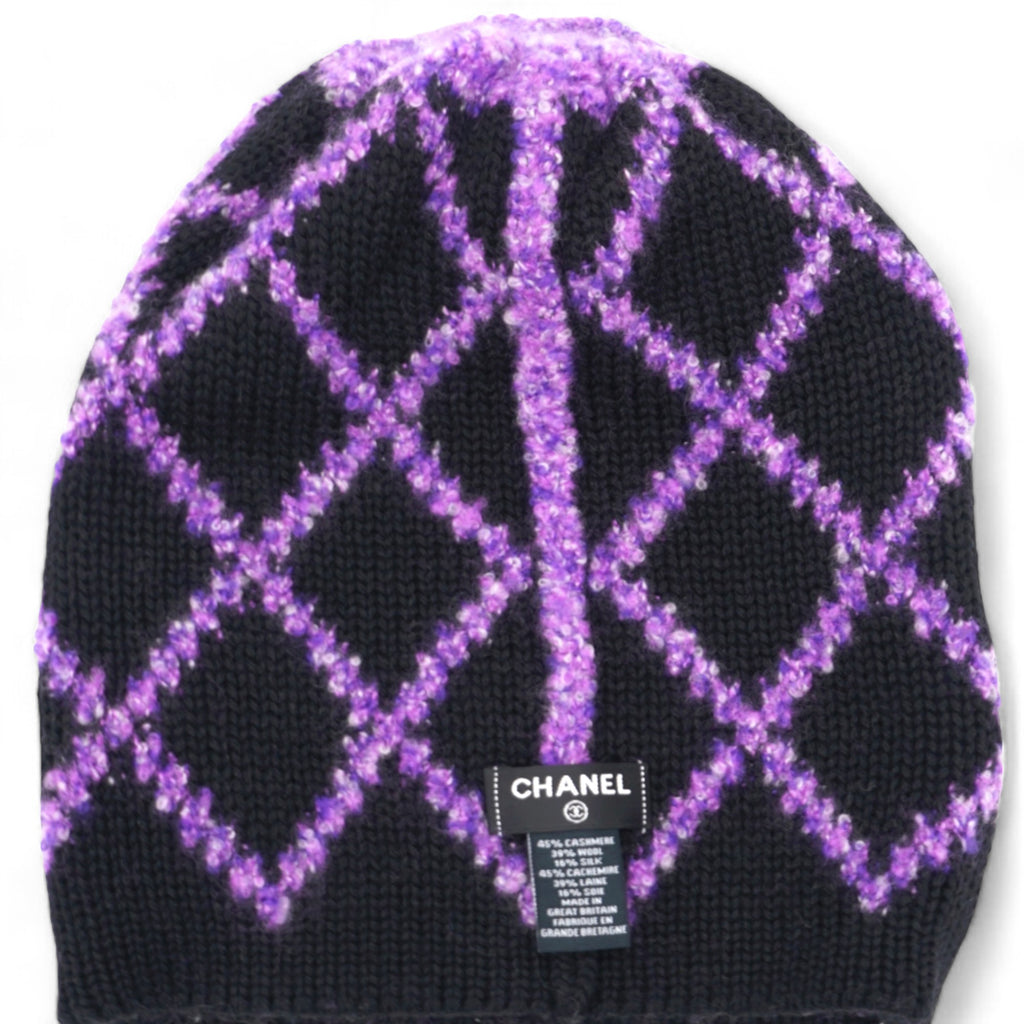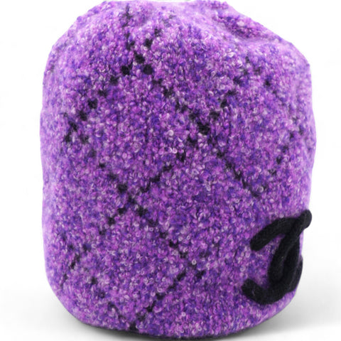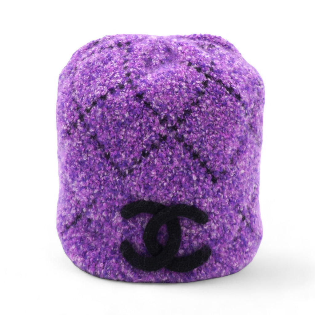 | This CHANEL cashmere hat in a beautiful violet purple shade features an elegant CC logo. Luxuriously soft and stylish, it is the perfect accessory to keep you warm and chic all season long. Made with high-quality material, this hat is a must-have for any fashion-forward individual. |