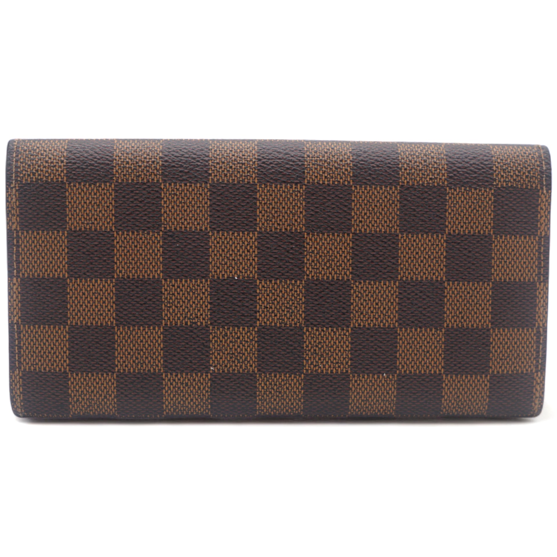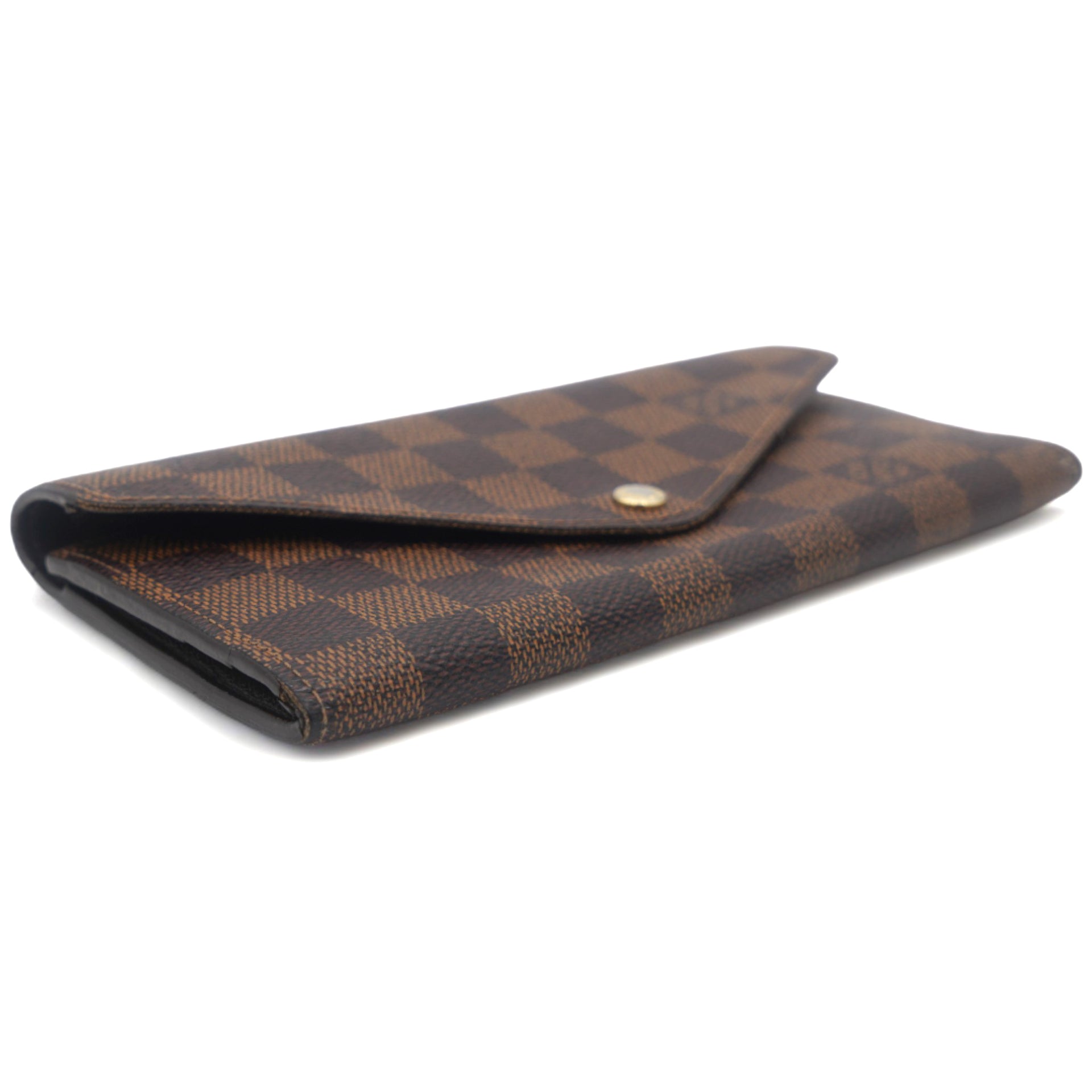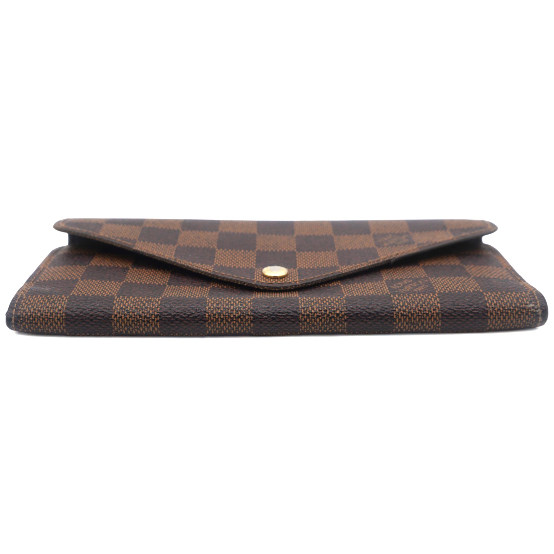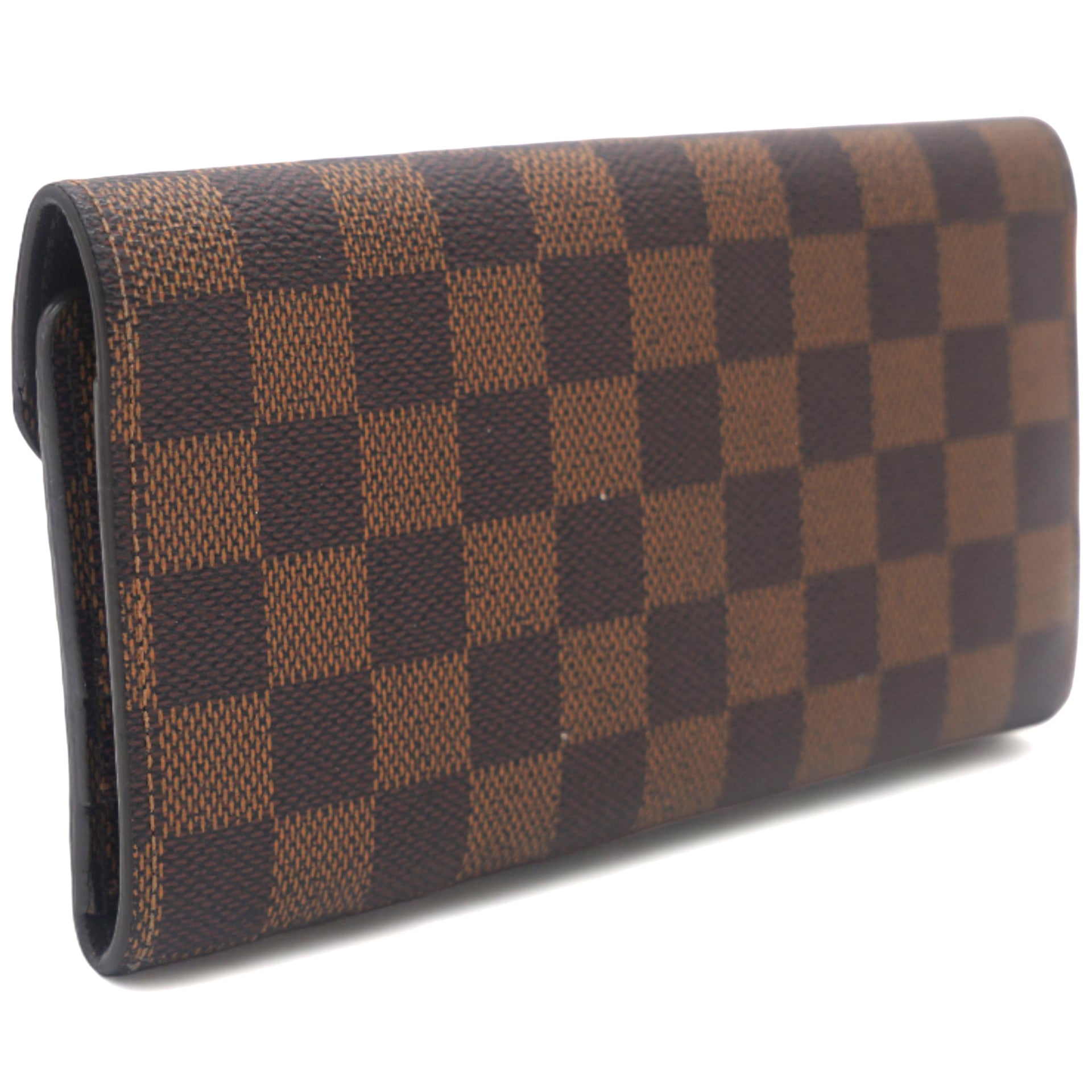 | This wallet is crafted of traditional Louis Vuitton Damier Ebene checkered-coated canvas. It features a gold snap button and opens to a chocolate cross-grain leather interior with card slots, patch pockets, and removable insert. |