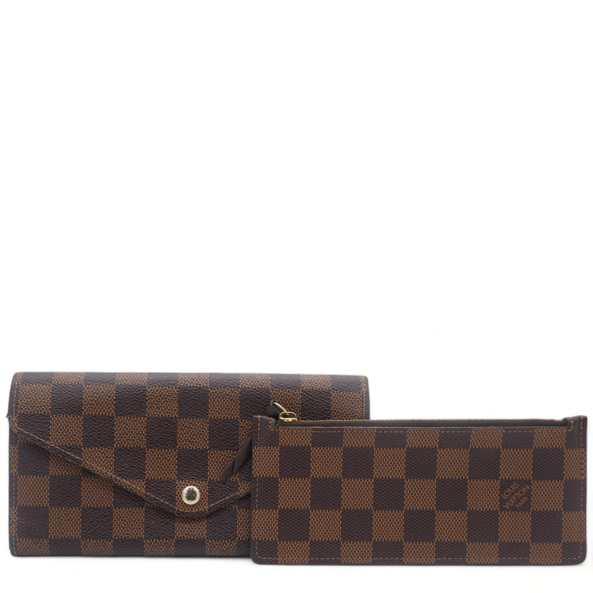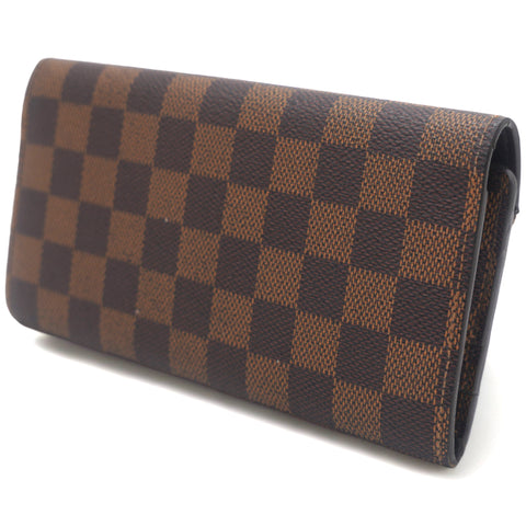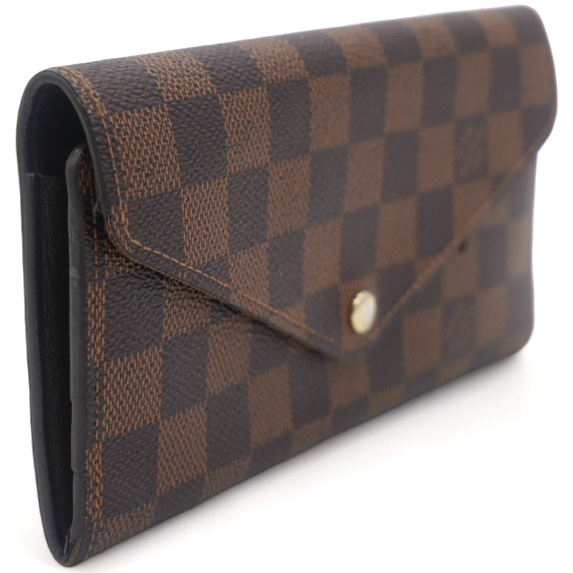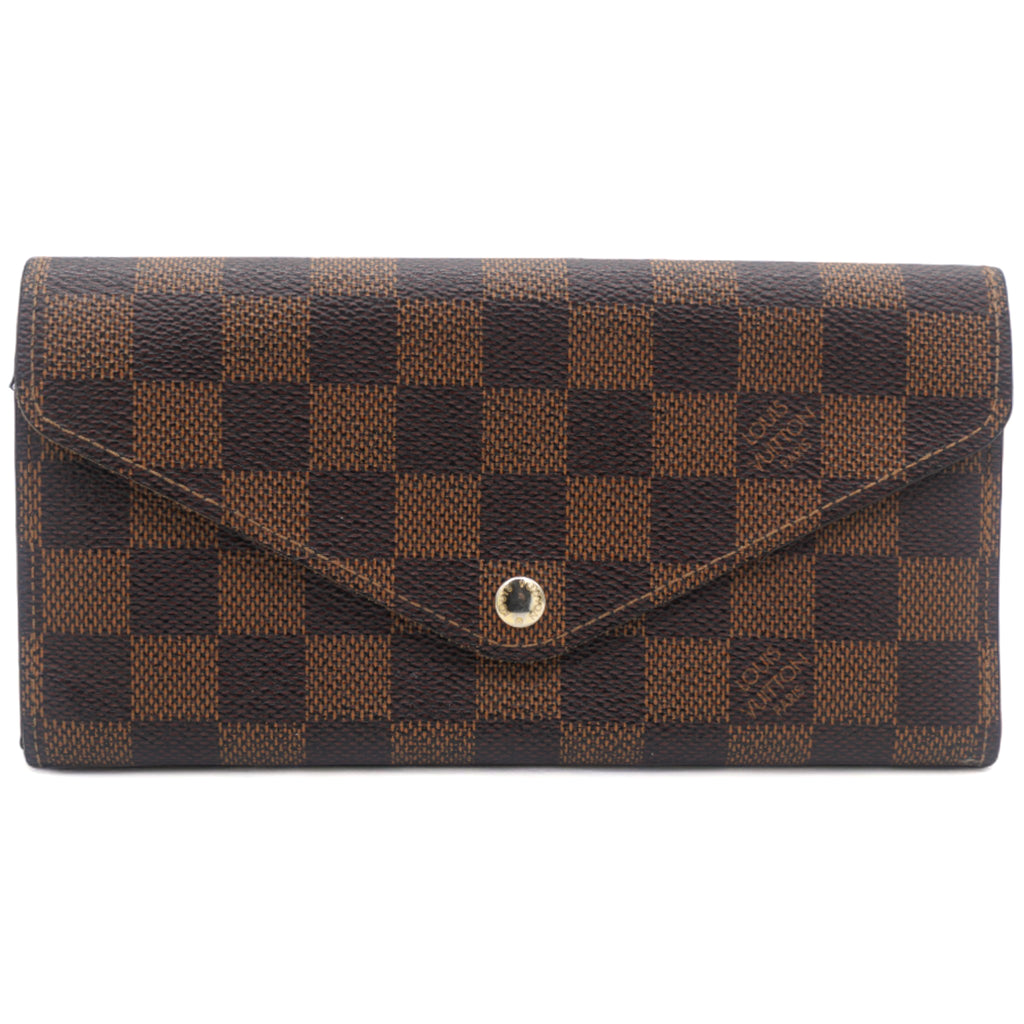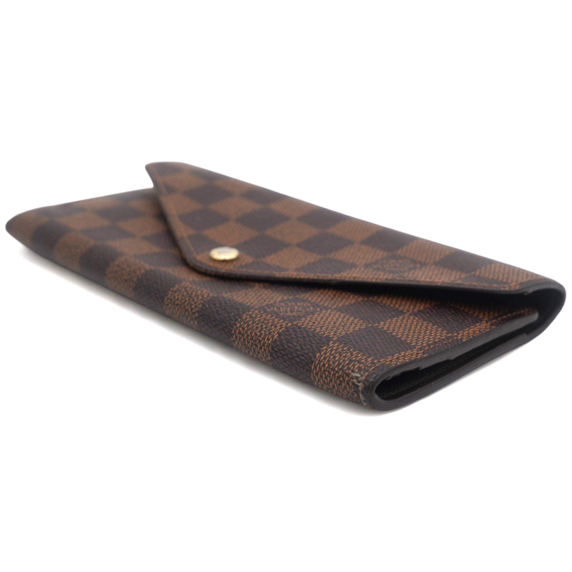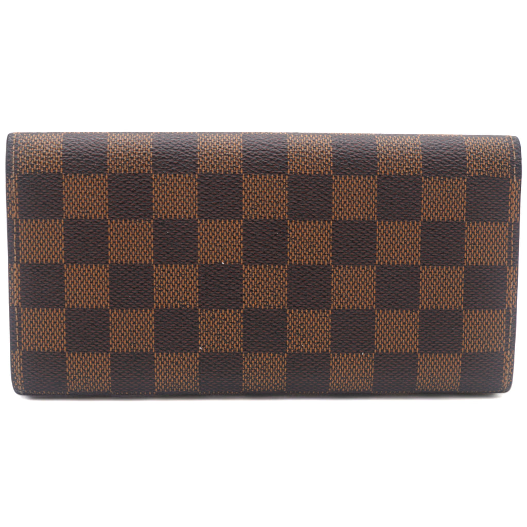 | This wallet is crafted of traditional Louis Vuitton Damier Ebene checkered-coated canvas. It features a gold snap button and opens to a chocolate cross-grain leather interior with card slots, patch pockets, and removable insert. |