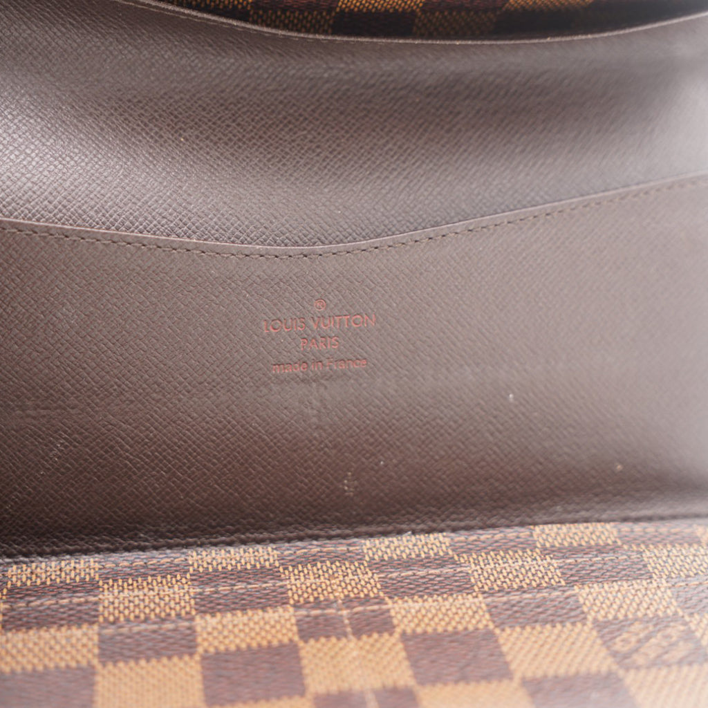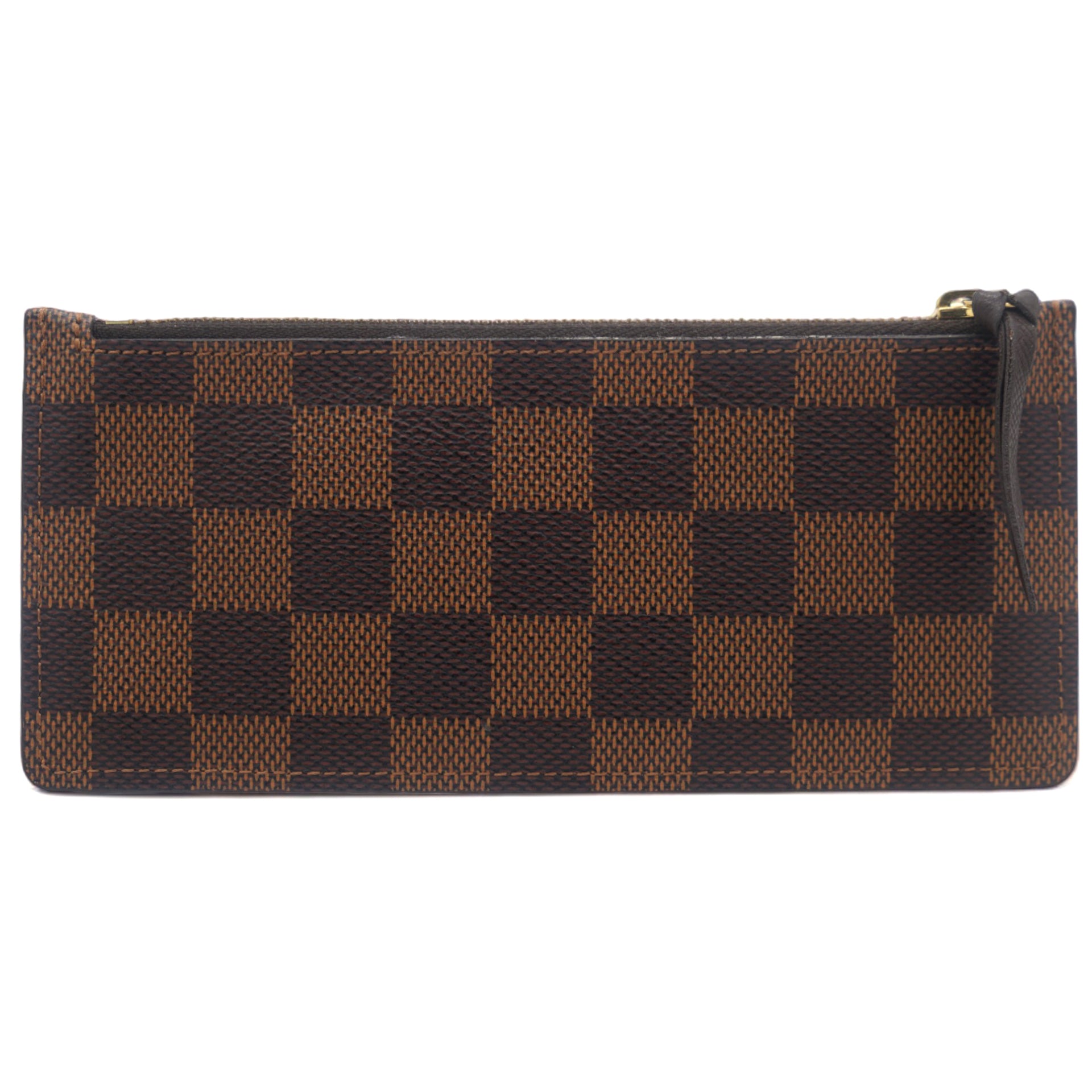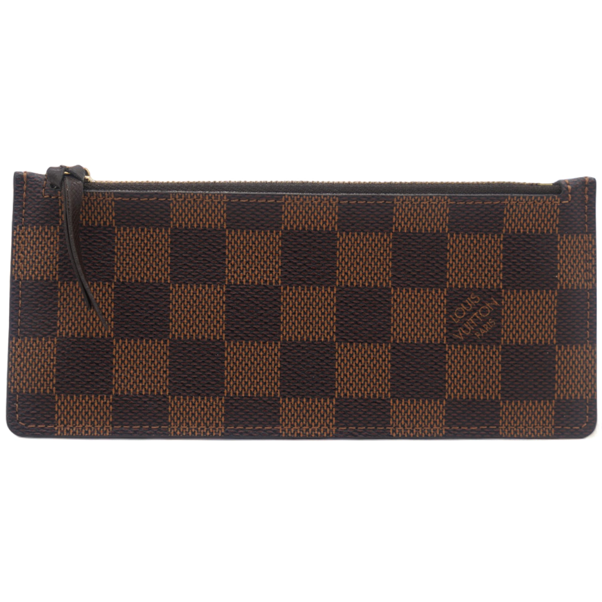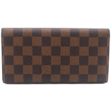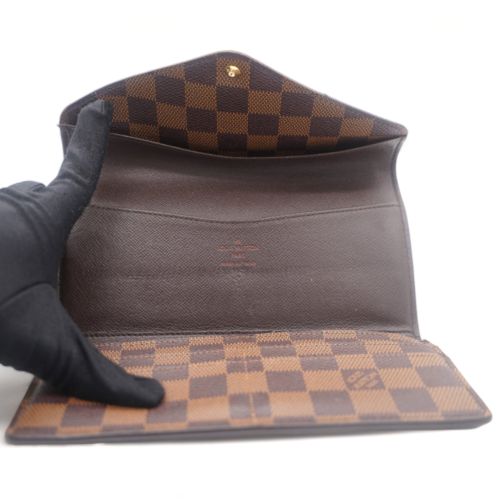 | This wallet is crafted of traditional Louis Vuitton Damier Ebene checkered-coated canvas. It features a gold snap button and opens to a chocolate cross-grain leather interior with card slots, patch pockets, and removable insert. |