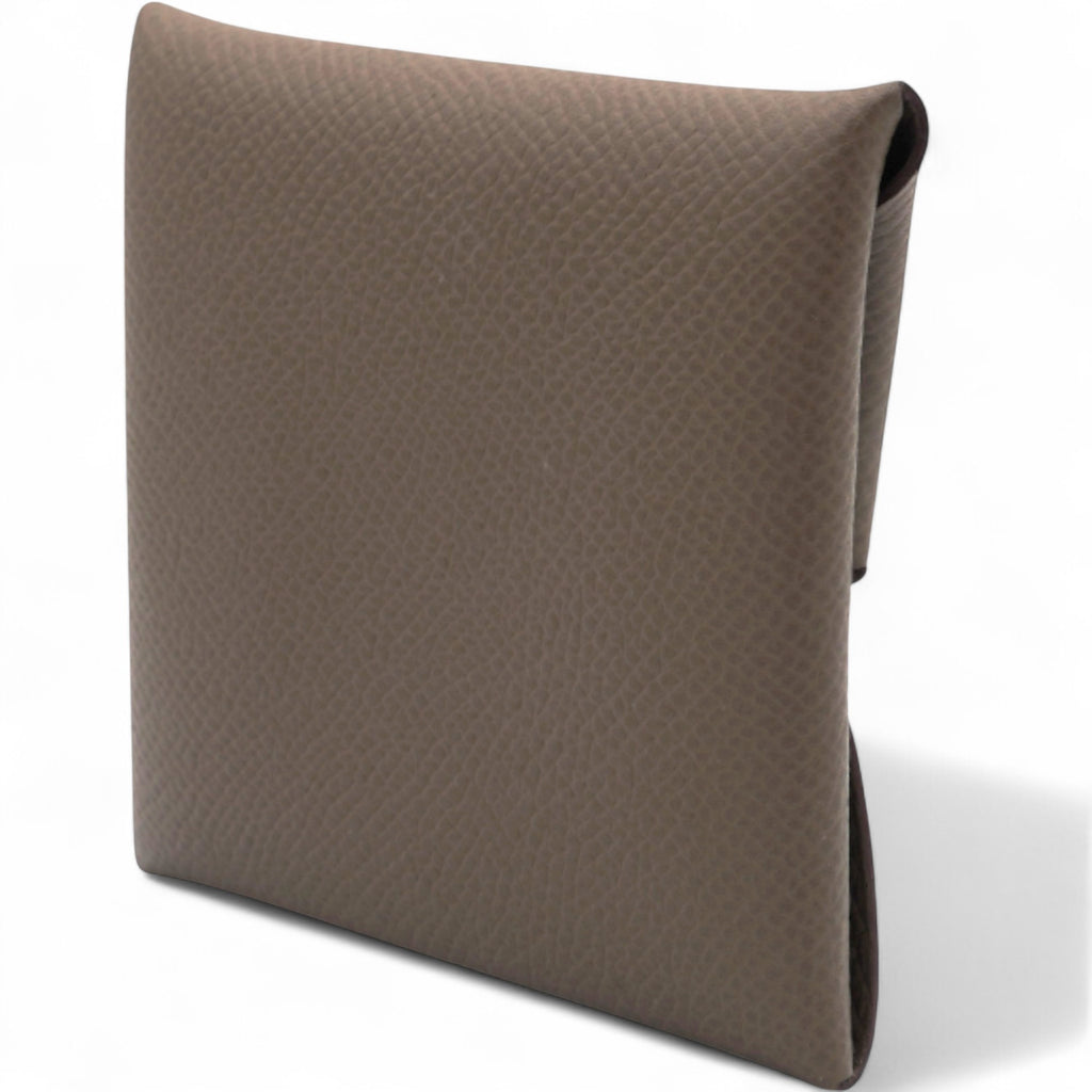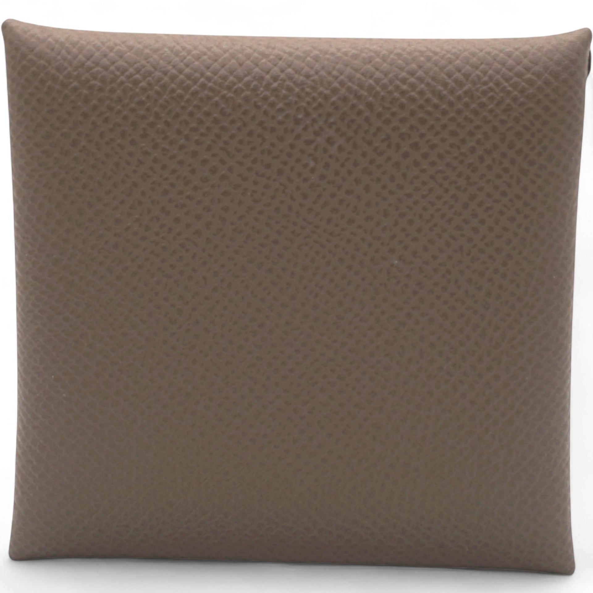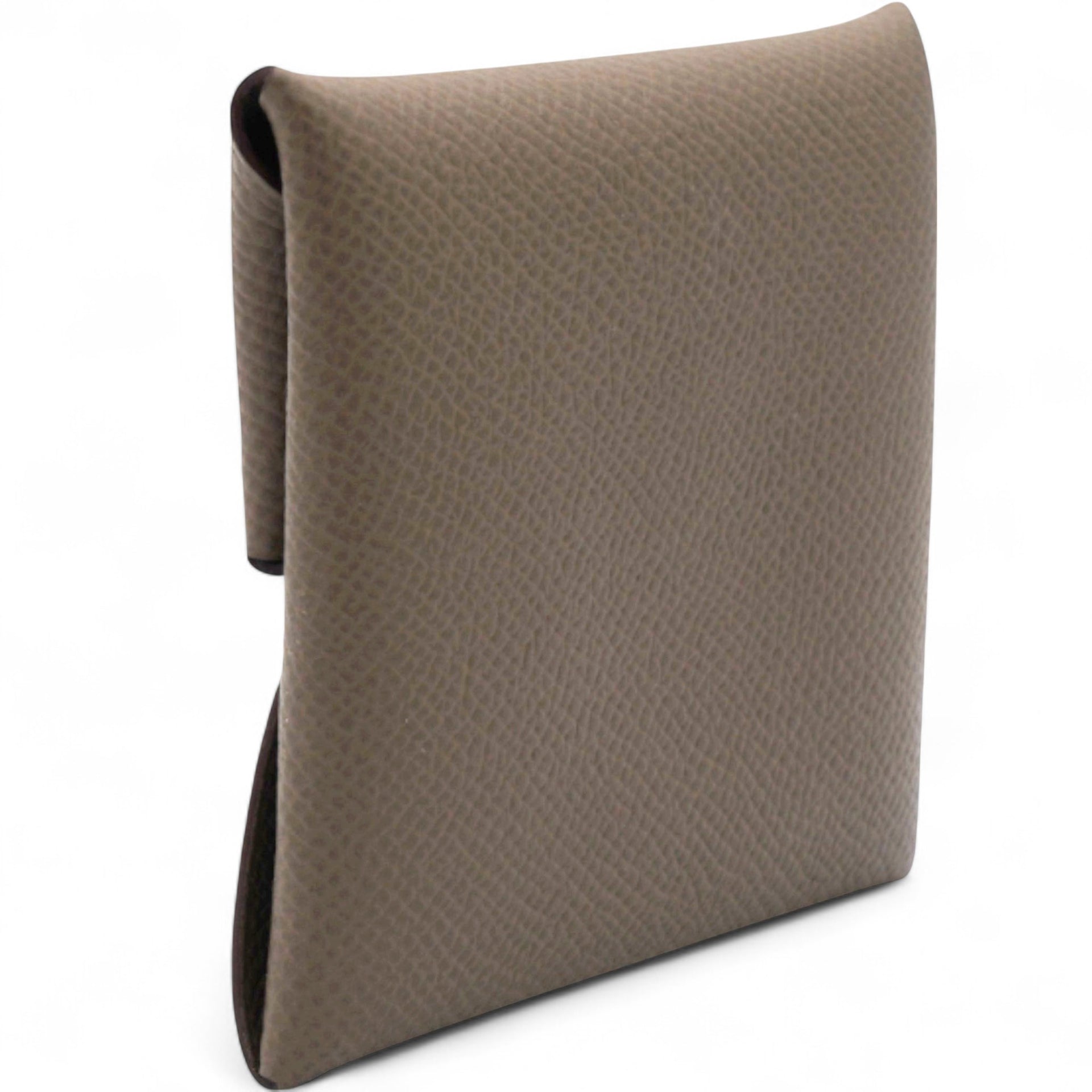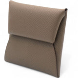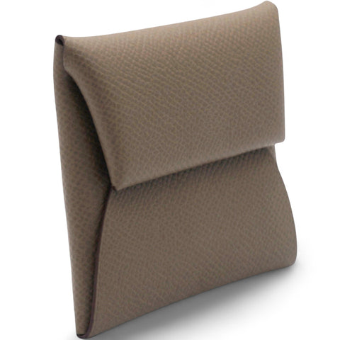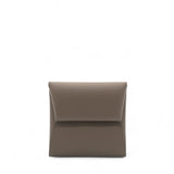 | This chic coin purse is crafted of grained epsom calfskin leather in grey and opens with a snap closure to a matching interior. |