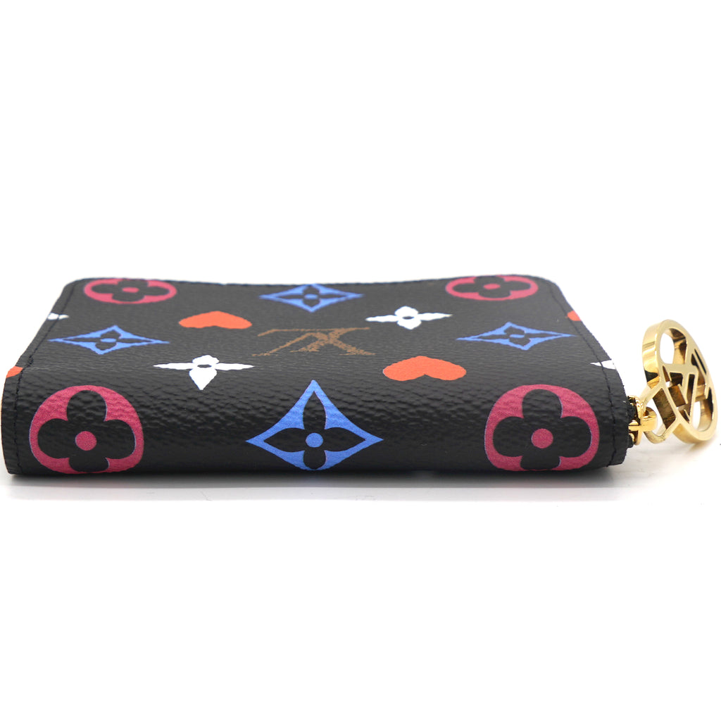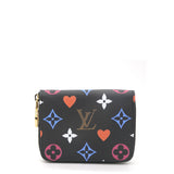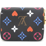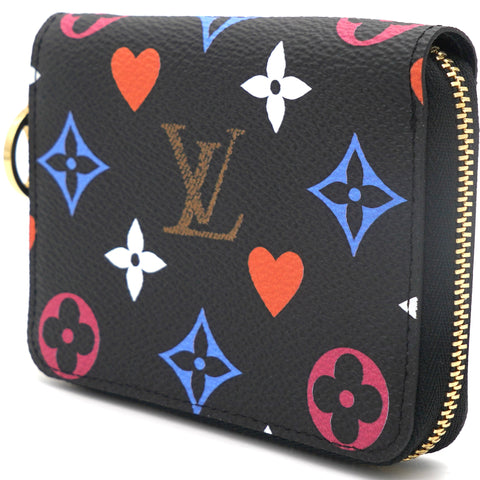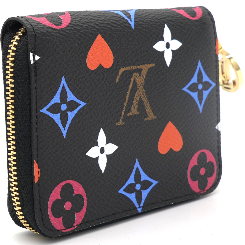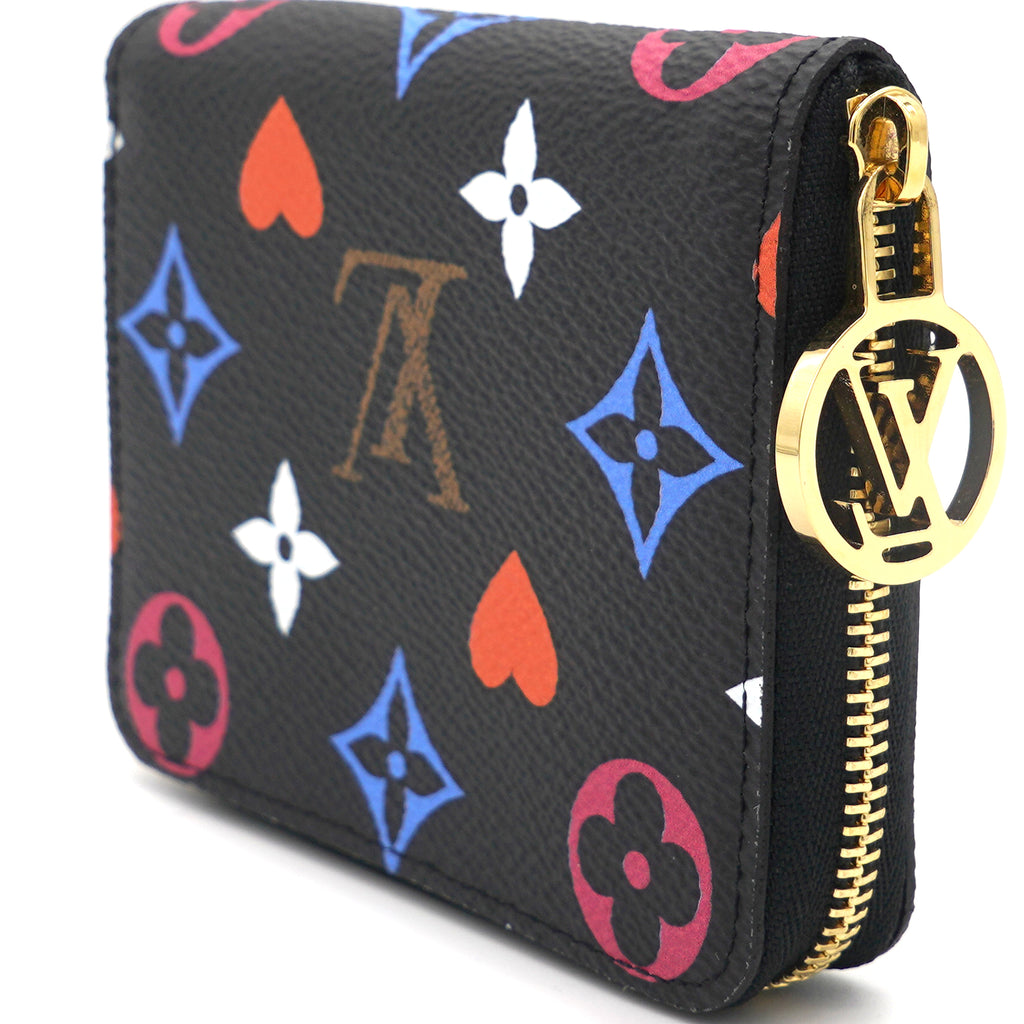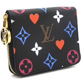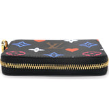 | This chic wallet is crafted of black Louis Vuitton monogram toile canvas with pop colors and heart symbols. The brass zipper opens to a black cross grain leather interior of card slots and patch pockets. This is an ideal wallet for keeping contents close at hand, by Louis Vuitton! |