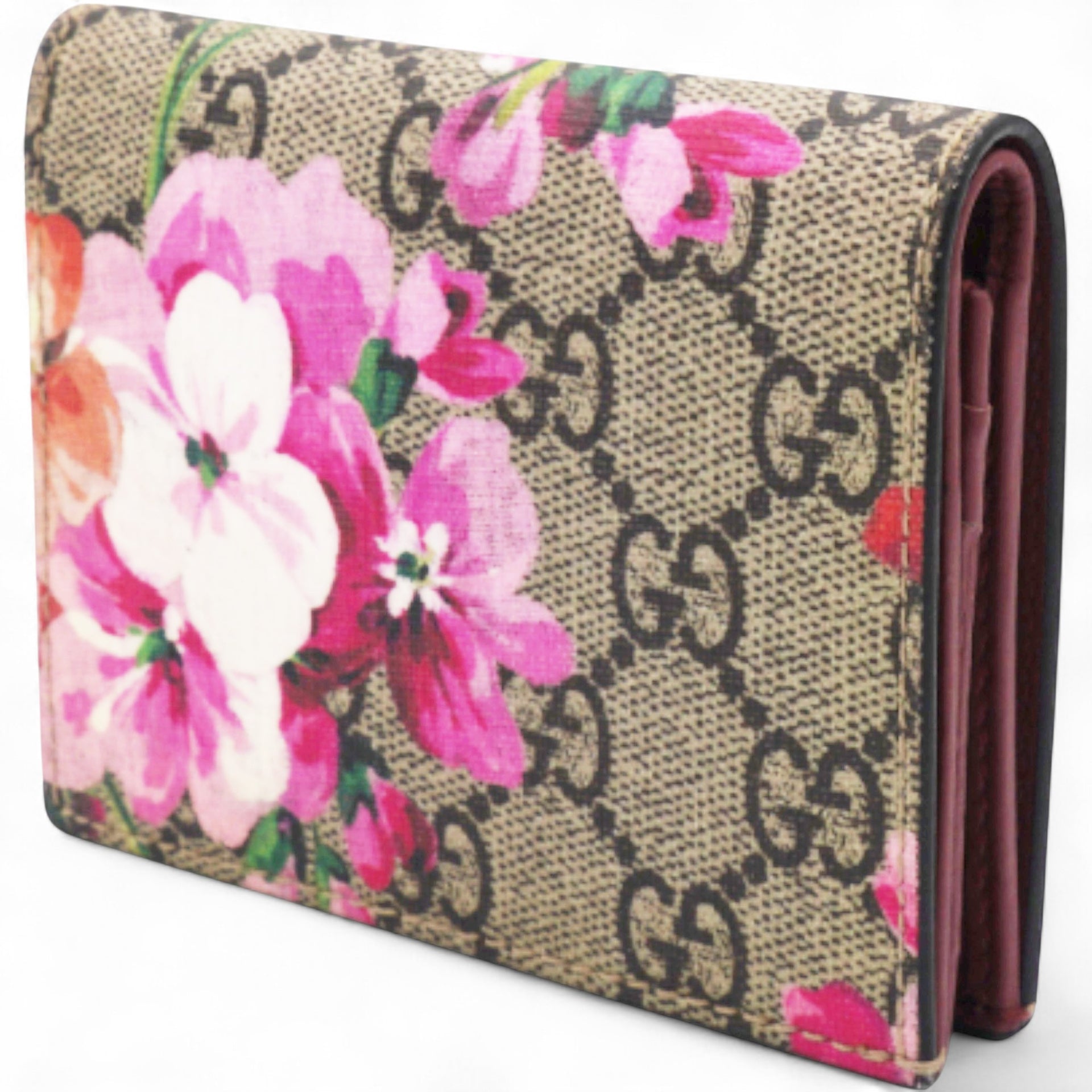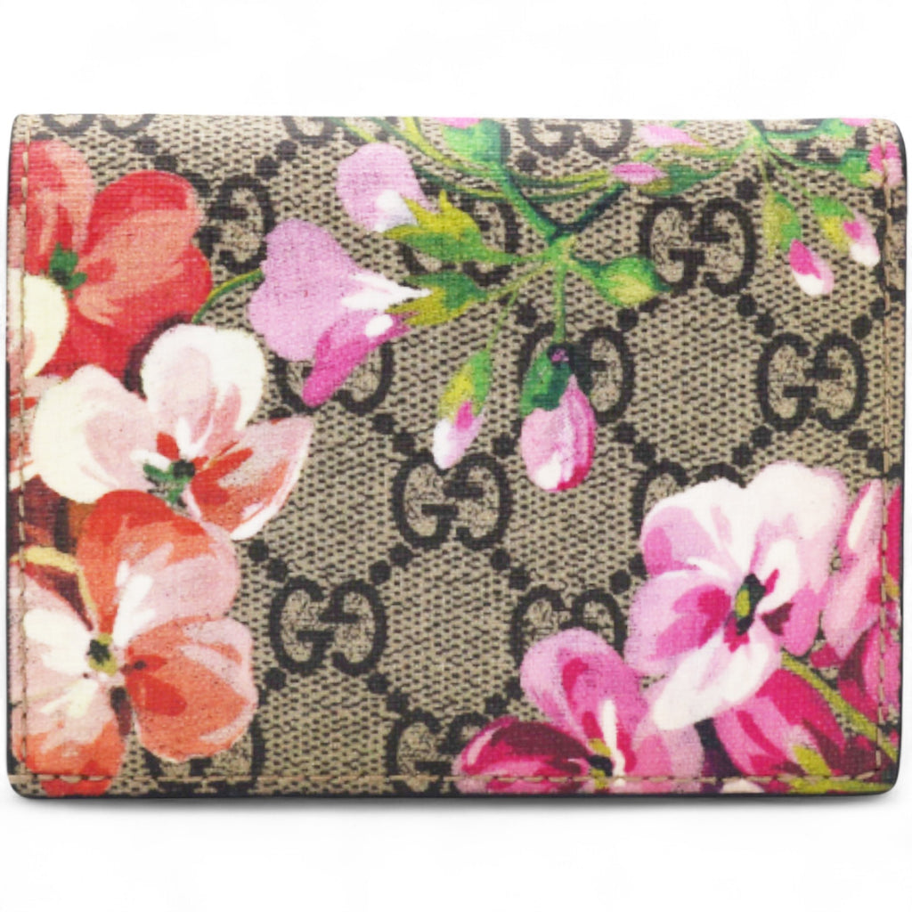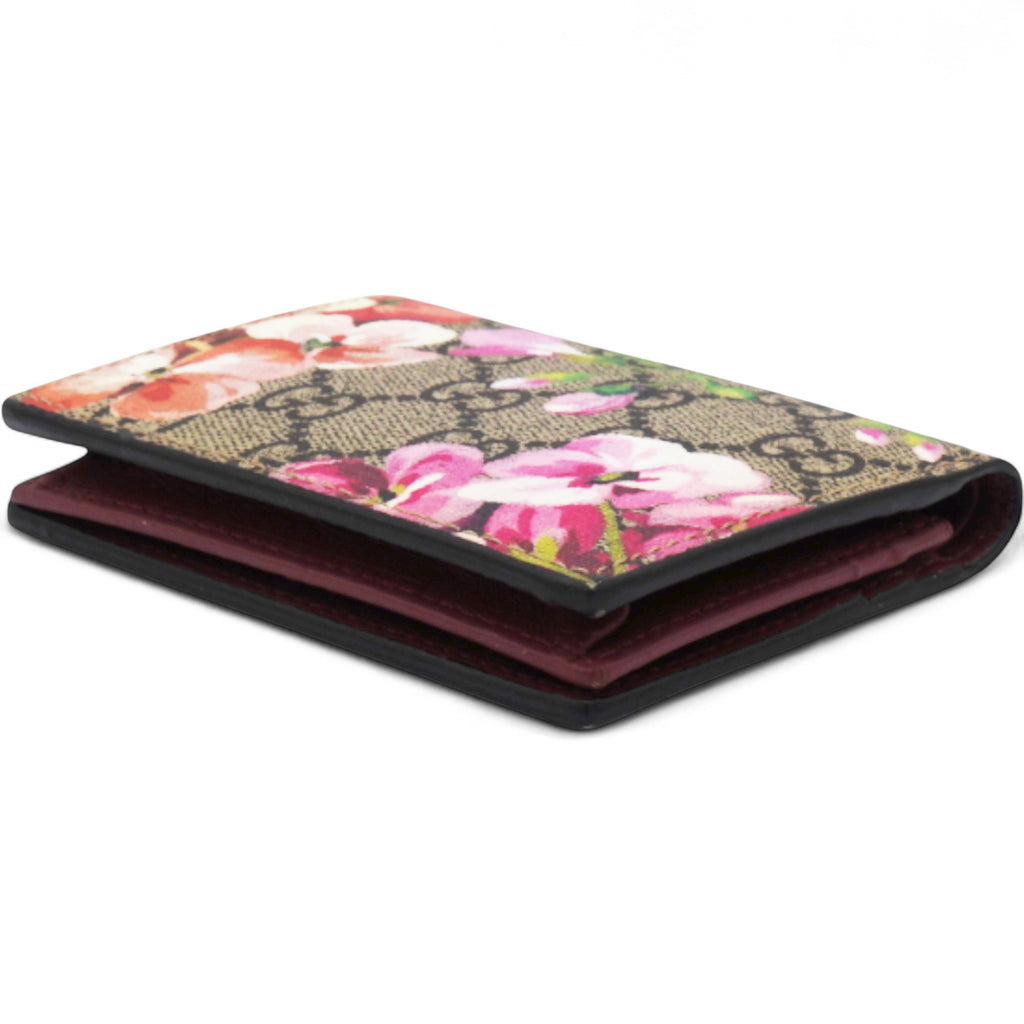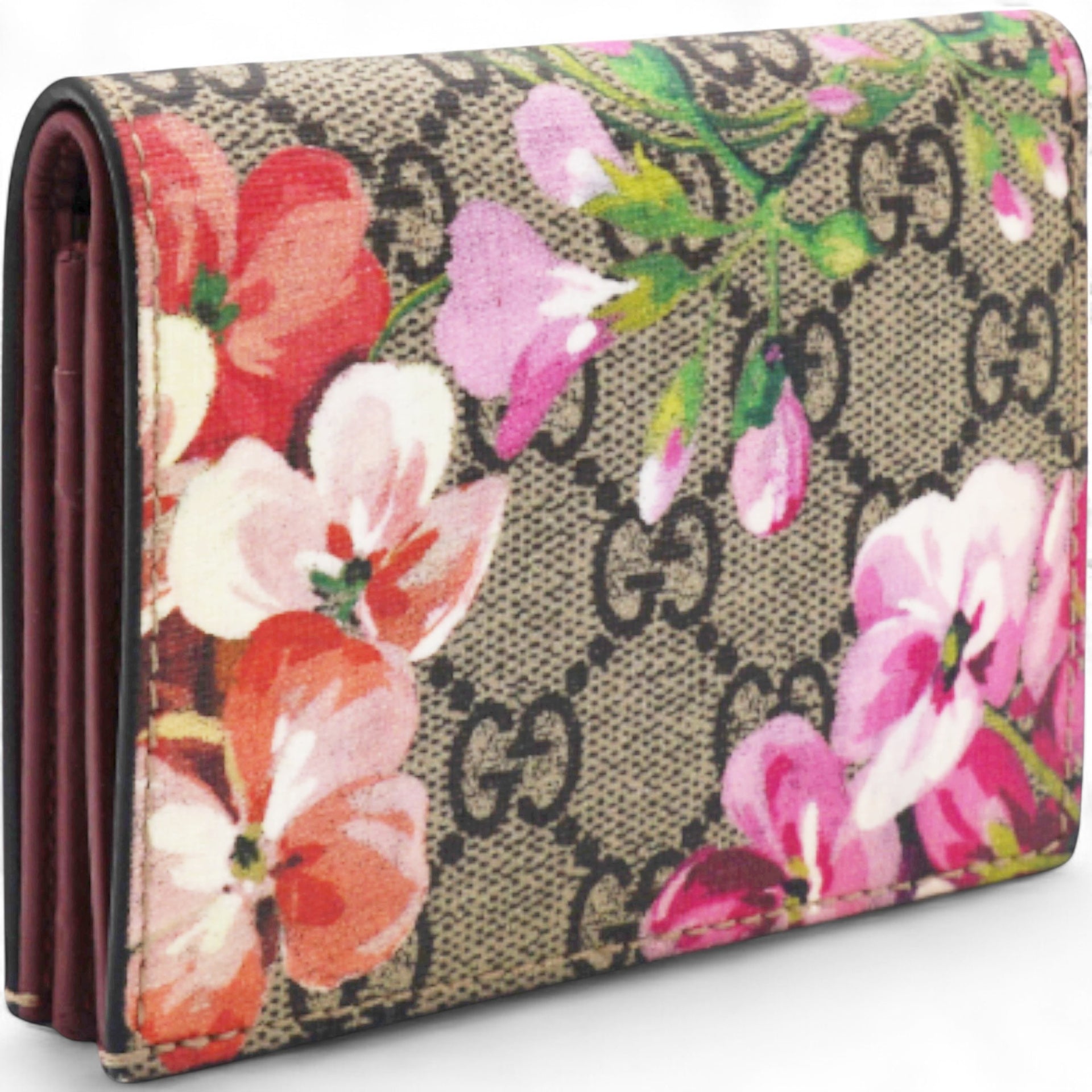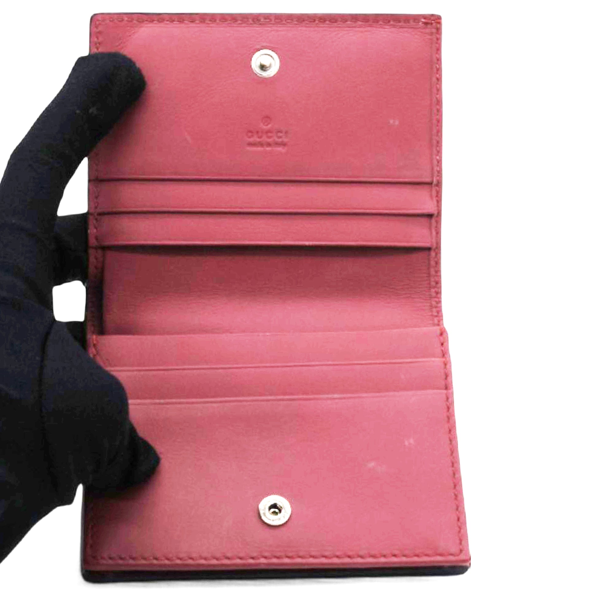 | This petite, yet stylish case is crafted of monogram coated canvas. The case features a beautiful print of various types of flowers throughout, in shades of pinks and reds. This wallet opens to a compact deep berry leather interior with card slots, patch pockets and a built in bill flap. This is a beautiful card holder with a beautiful twist of style from Gucci! |