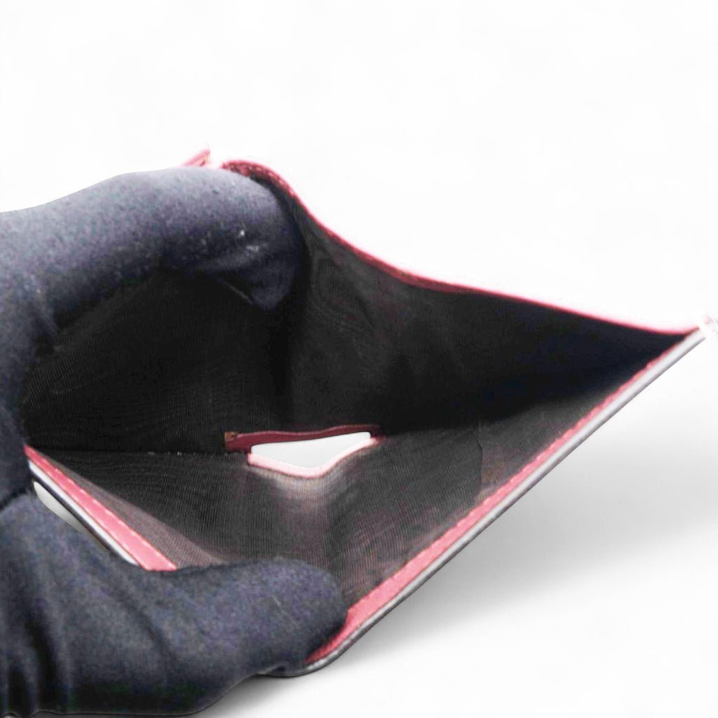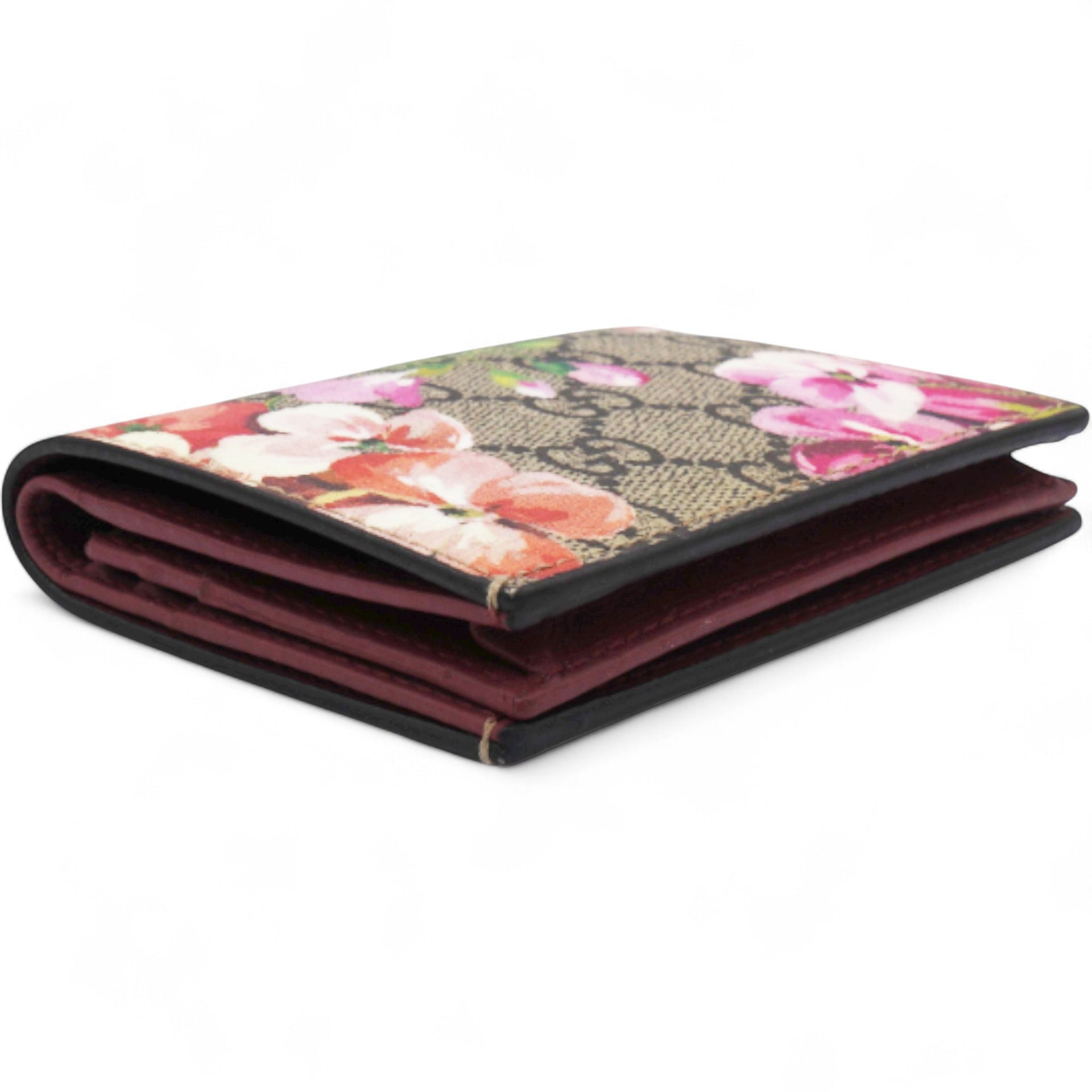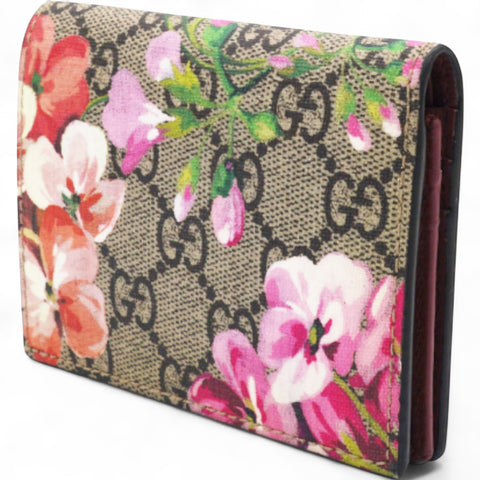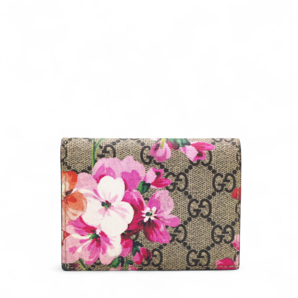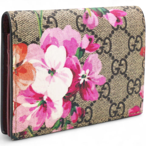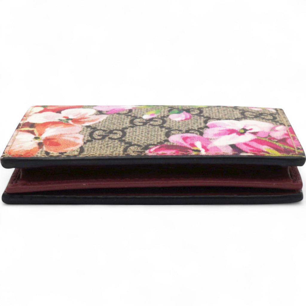 | This petite, yet stylish case is crafted of monogram coated canvas. The case features a beautiful print of various types of flowers throughout, in shades of pinks and reds. This wallet opens to a compact deep berry leather interior with card slots, patch pockets and a built in bill flap. This is a beautiful card holder with a beautiful twist of style from Gucci! |
