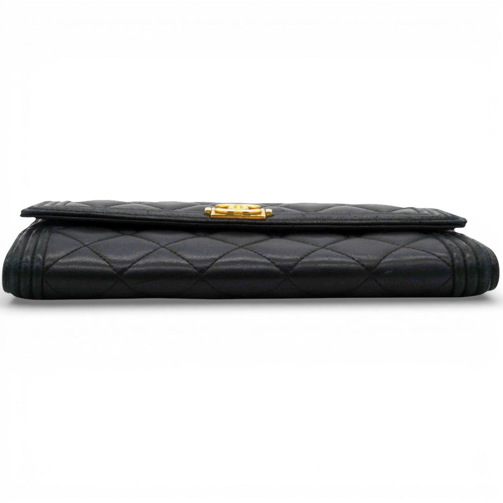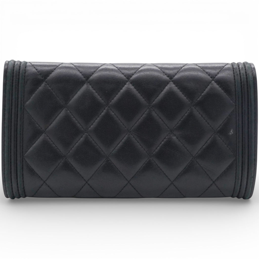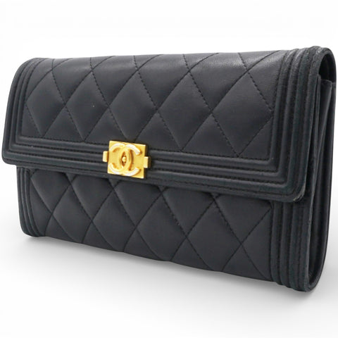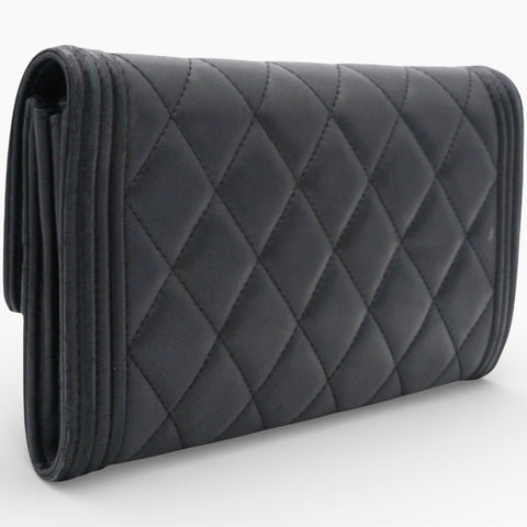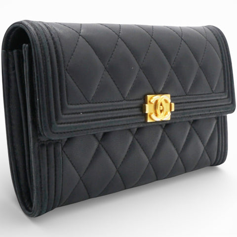 | This Chanel Boy flap Wallet has a flap, which makes it easy to open and close while the design looks like a ‘wallet’ and not a ‘Flap Bag’. Crafted out of beautifully soft diamond quilted leather with a border of linear quilted leather.The wallet has a facing flap with a unique squared Chanel CC press lock that opens to a matte leather interior with two full card slot panels, a central currency zipper pocket and space between. |