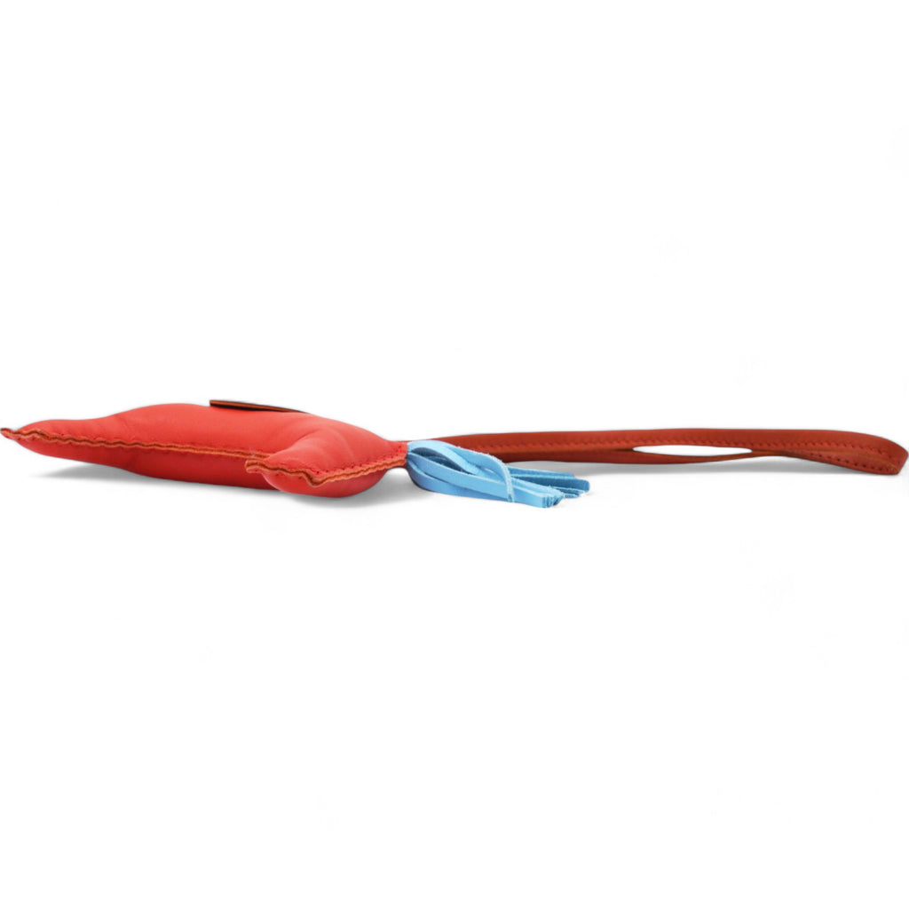 | This lovely bag charm is crafted of stuffed orange lambskin leather with a blue fringe mane and tail and a burnt orange leather strap with saddle bags. |