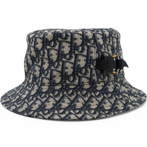 | The essential bucket hat is revisited through House codes. Crafted in navy blue and beige blended cotton jacquard, it is distinguished by its all-over Dior Oblique motif, first seen on House creations in 1969. A utilitarian Dior buckle adorns the side with a hallmark touch. The bucket hat will lend a modern finish to all relaxed outfits. |