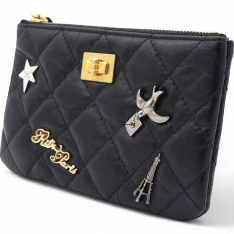 | This chic case is crafted of diamond quilted aged calfskin leather in black with a small aged gold Chanel Mademoiselle faux turn lock and features four frontal charms. The top zipper opens to burgundy fabric interior. This is a practical and chic case for all your traveling needs from Chanel! |
