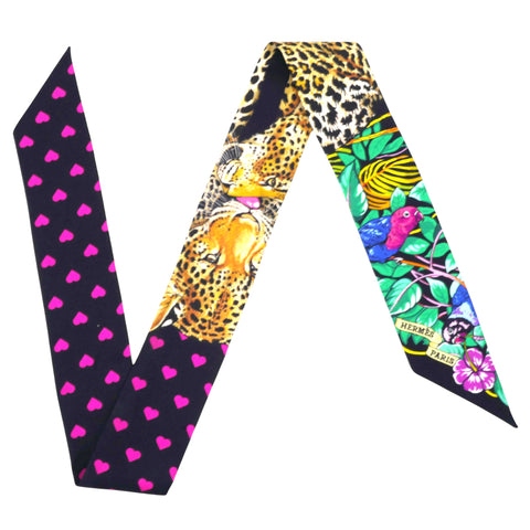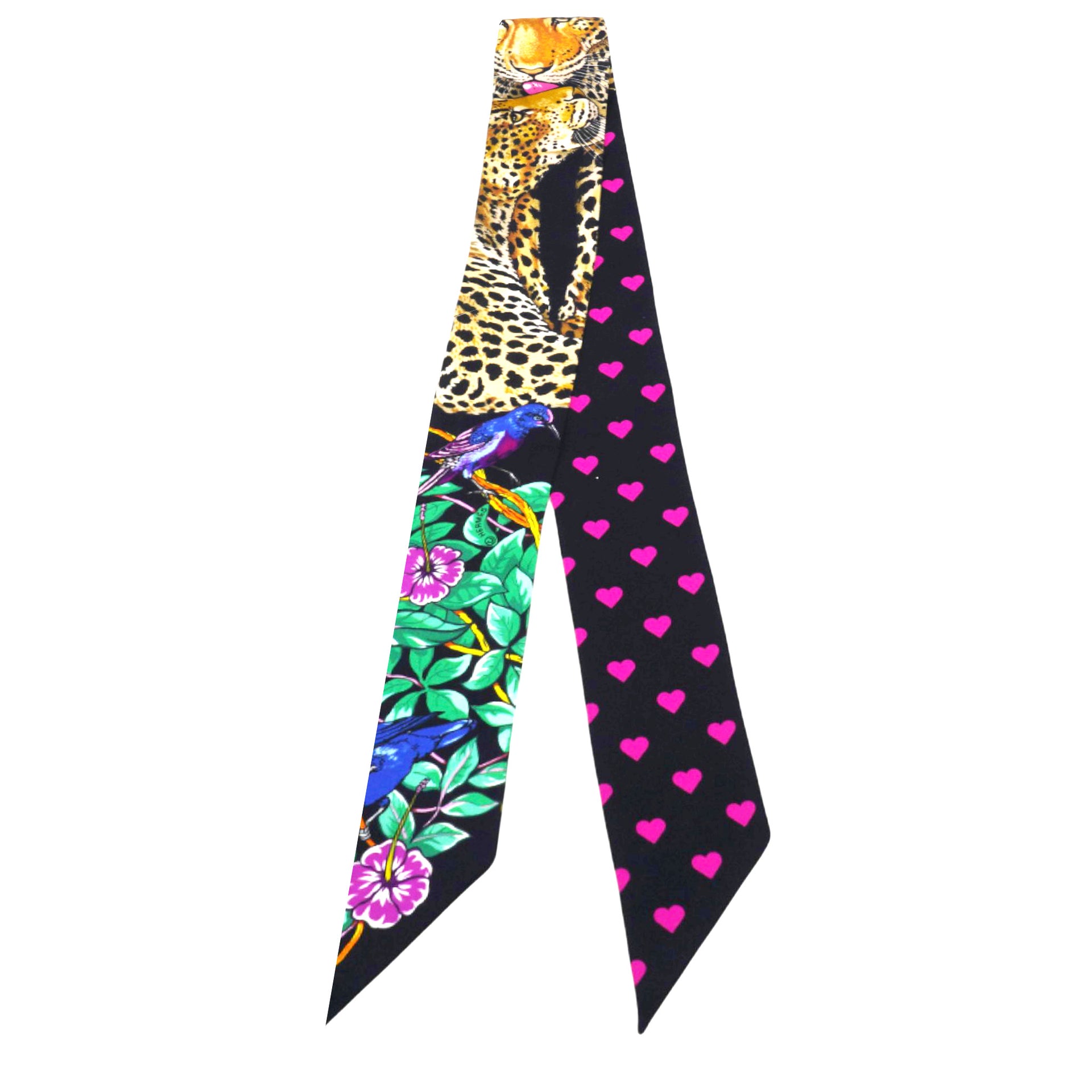 | The bold design and exceptional quality of this Hermes bandeau makes it a fabulous fashion accessory. This scarf features a cheetah and jungle design on a black background. |