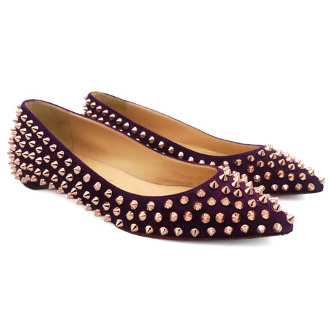 | Crafted out of merlot suede leather, these flats are a charming add-on accessory that you absolutely need to own. These ballet flats from the house of Christian Louboutin feature pointed toes and signature red soles.They are exquisitely embellished with spikes on the exterior and come equipped with comfortable leather-lined insoles. |