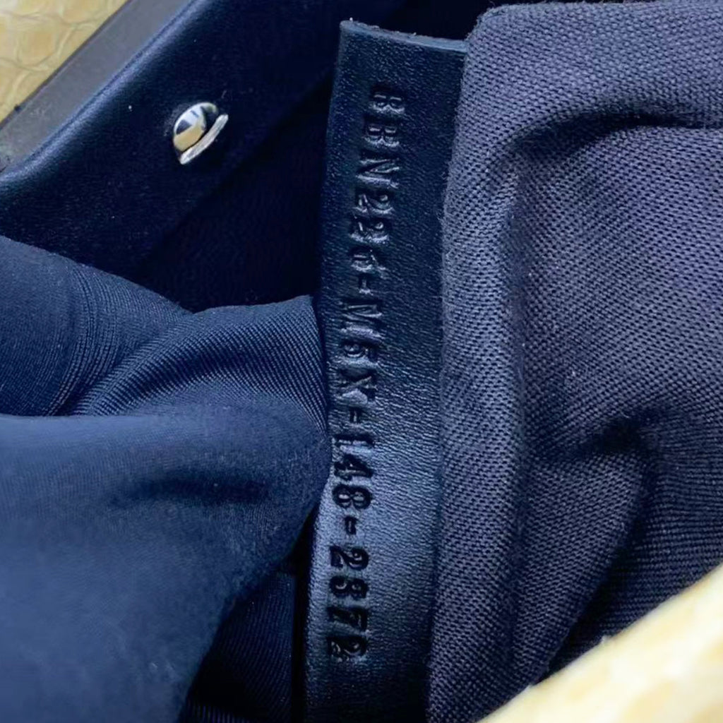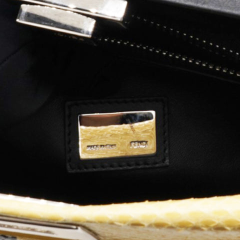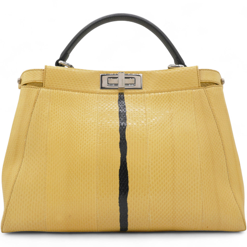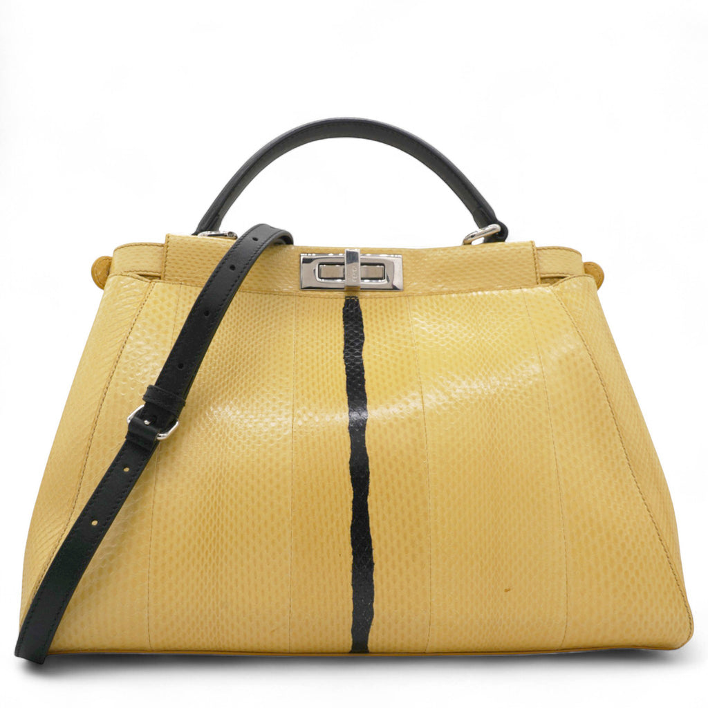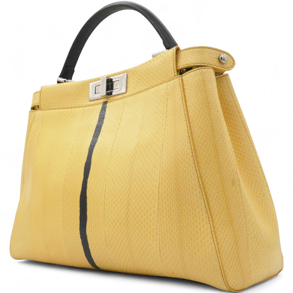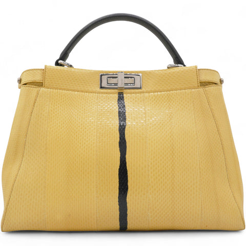 Stylish and elegant, the Fendi Peekaboo is crafted using exotic python, comes with a detachable shoulder strap for hands free carrying and has enough compartments to keep your essentials organised - you will find yourself reaching for this iconic Fendi over and over again! Yellow python leather exterior; black leather trim and single top handle; silver tone hardware; detachable and adjustable leather shoulder strap; twin turn locks open to two main compartments with central partition; black leather lined interior with 1 x zip pocket.