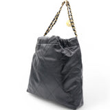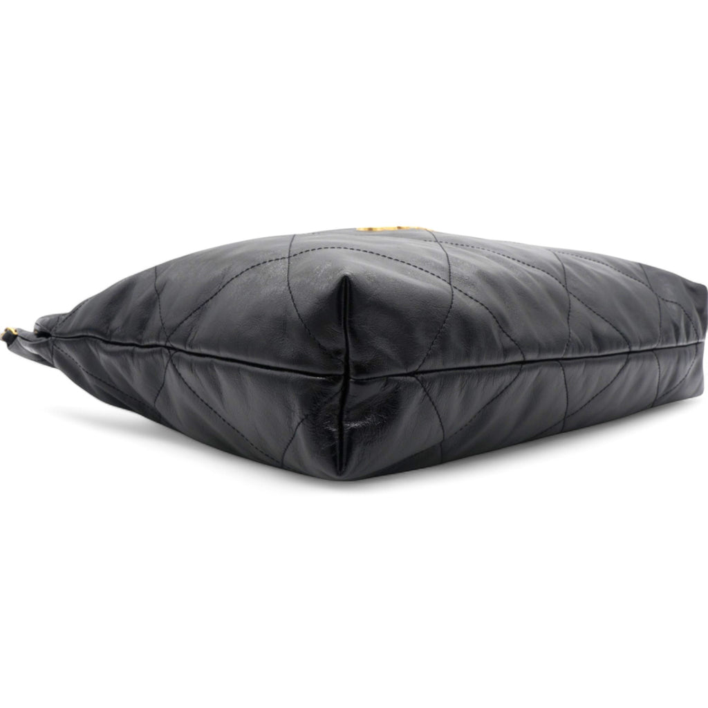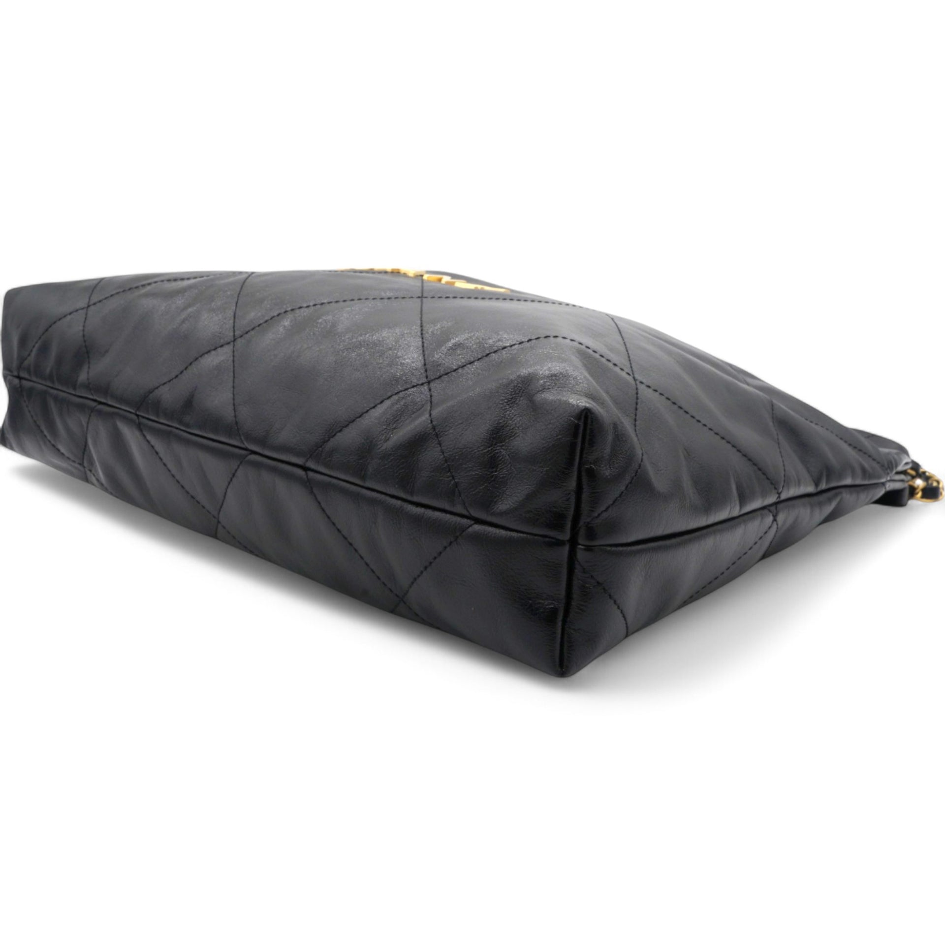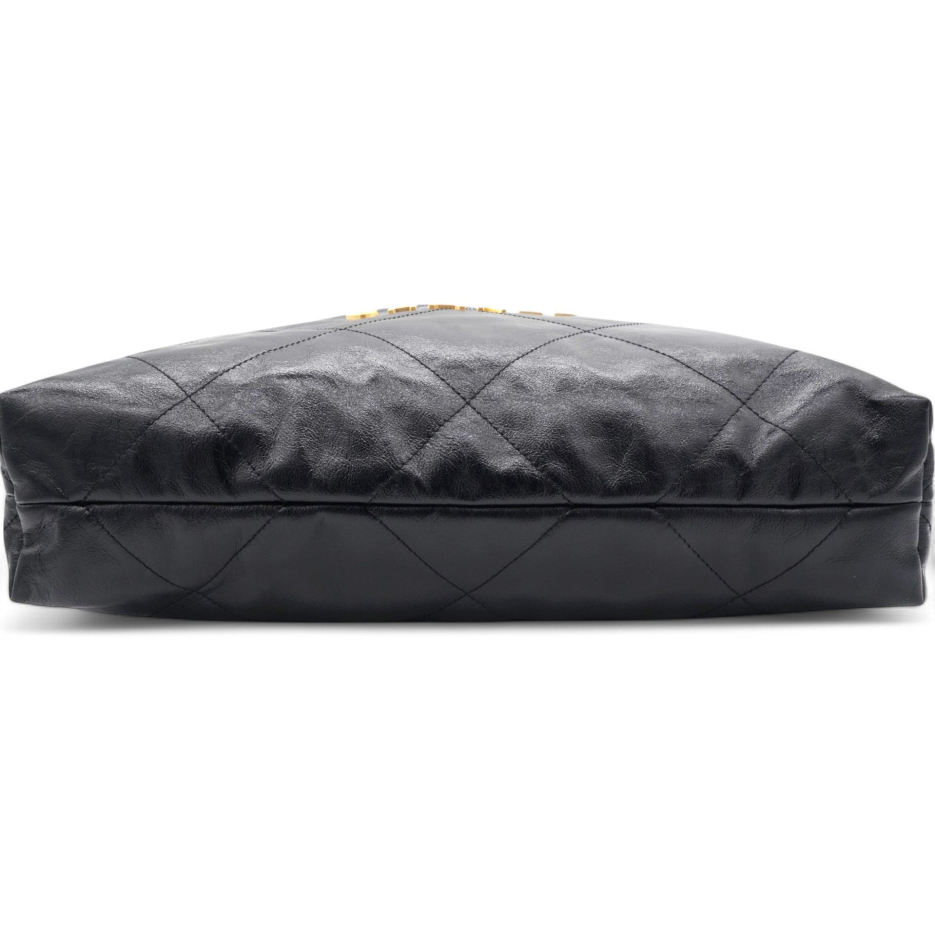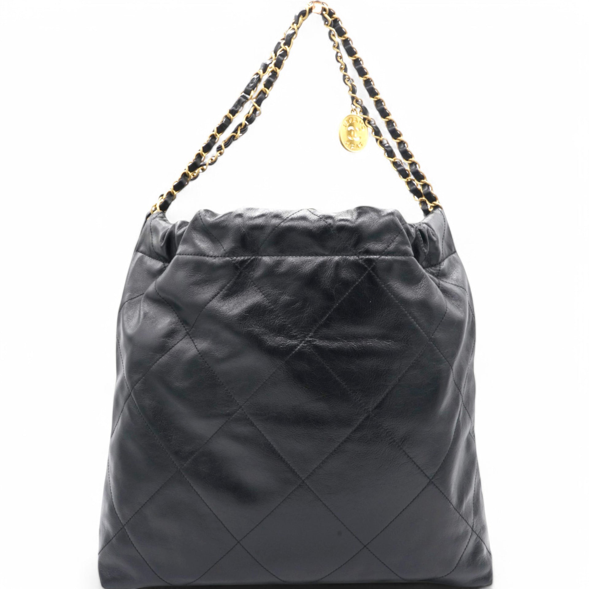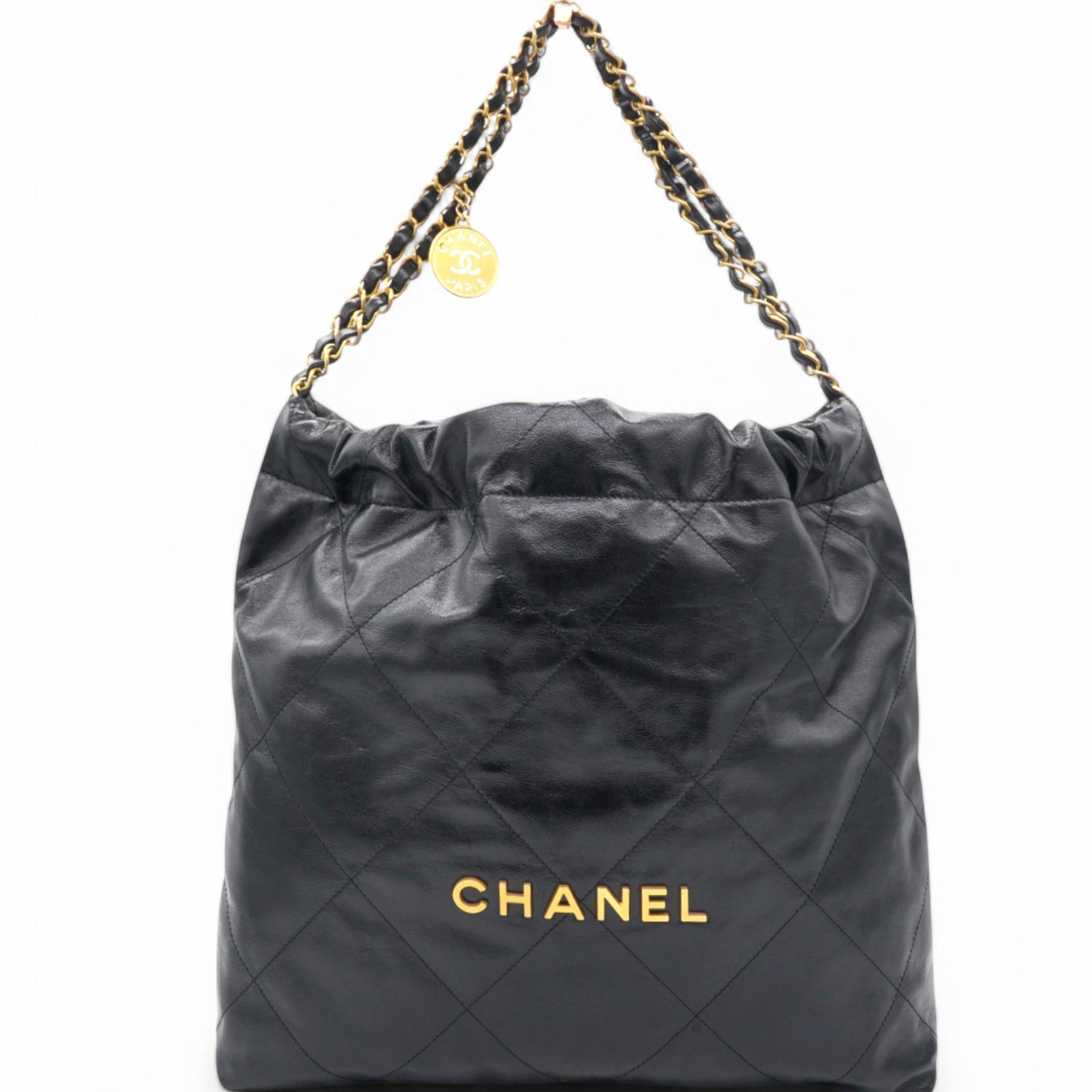 | The bag features leather threaded gold chain shoulder straps and a gold Chanel logo on the front. The open top with magnetic closure leads to a black fabric interior with a zipper pocket and a removable pouch. |