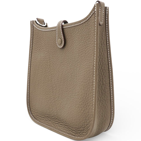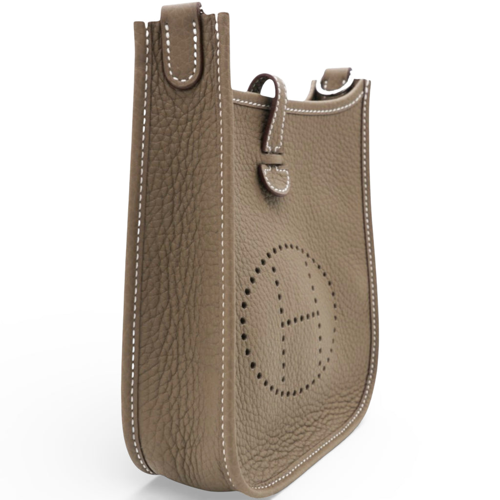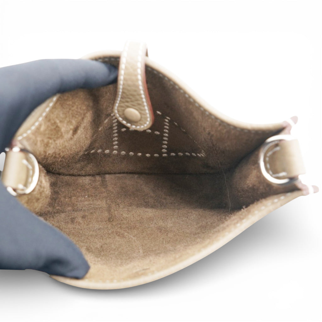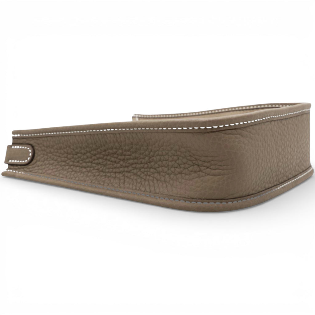 This messenger bag is crafted of rich Taurillon Clemence calfskin leather in taupe. The shoulder bag features a canvas crossbody strap, polished silver palladium hardware, and a perforated Hermes H oval logo. The top of the bag opens with a crossover strap to a matching suede interior.