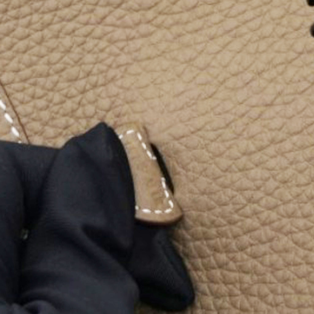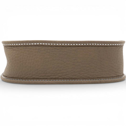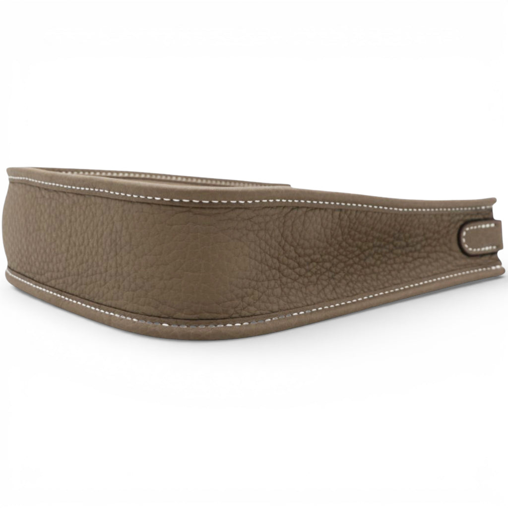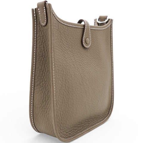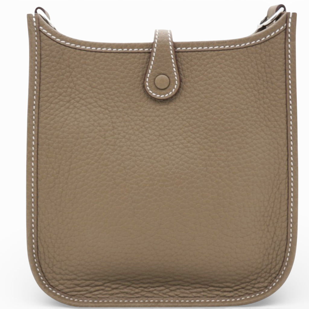 This messenger bag is crafted of rich Taurillon Clemence calfskin leather in taupe. The shoulder bag features a canvas crossbody strap, polished silver palladium hardware, and a perforated Hermes H oval logo. The top of the bag opens with a crossover strap to a matching suede interior.