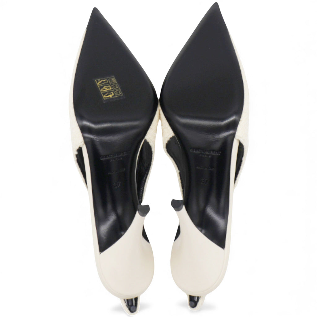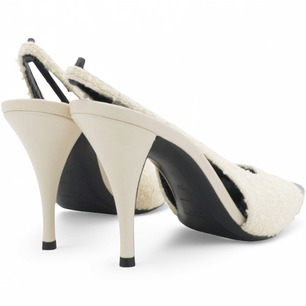 Slingback pump heels in paneled bouclé wool-blend and leather, featuring a patent leather pointed toe, a covered stiletto heel, and a leather sole. Approx. 3.5" heel.