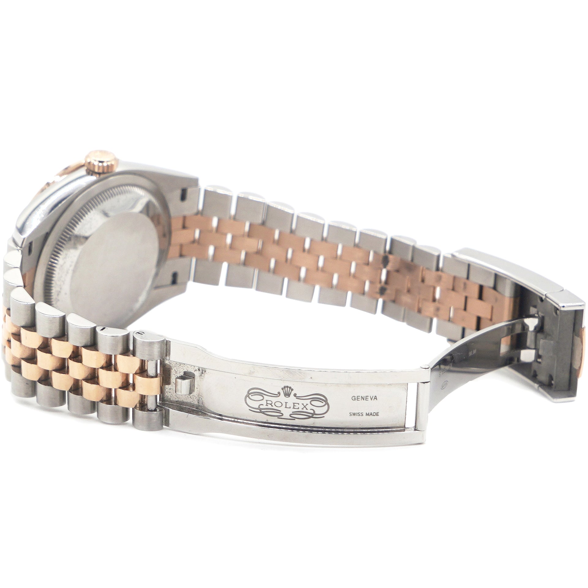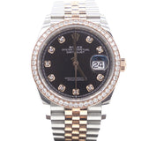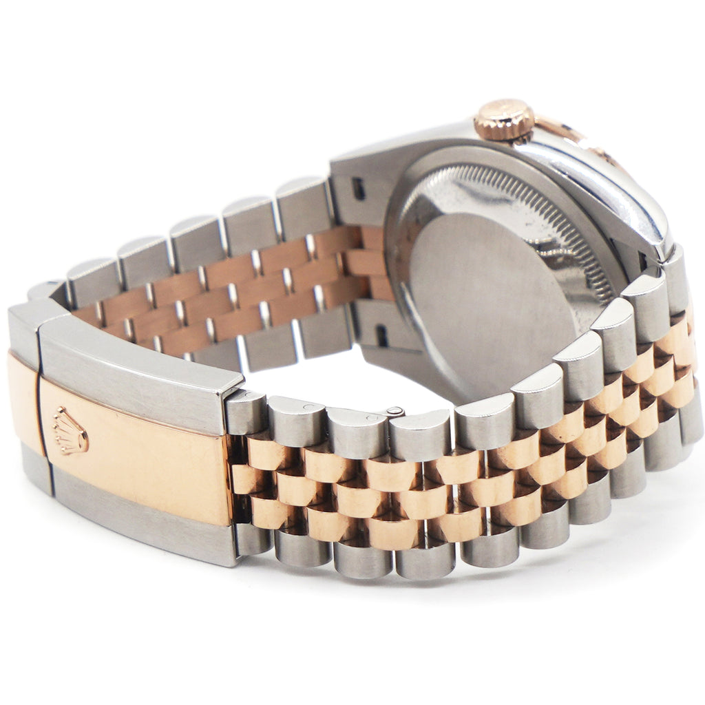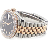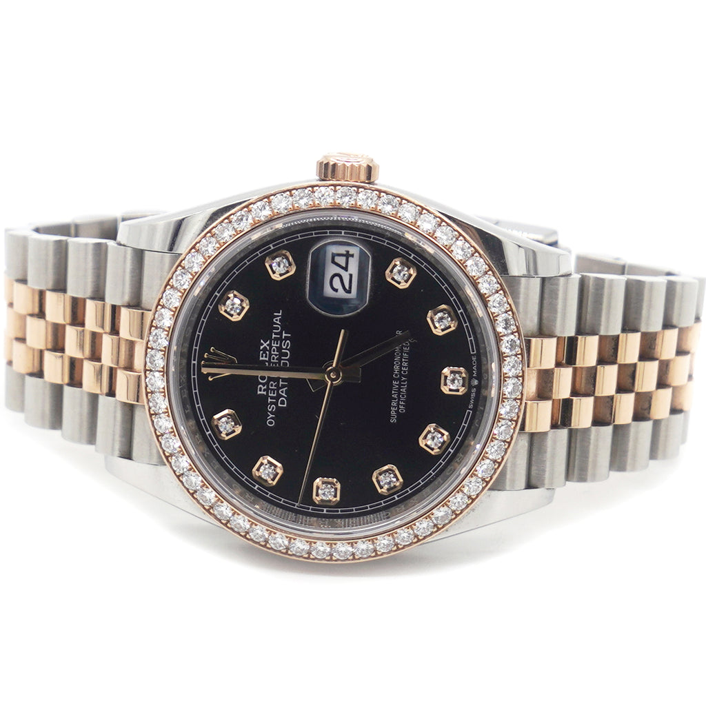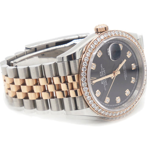 | This oyster perpetual datejust 36 in oystersteel and everose gold features a bright black, diamond-set dial and a jubilee bracelet. Its dial features diamonds in 18 ct gold settings. The light reflections on the case sides and lugs highlight the elegant profile of the 36 mm oyster case, which is fitted with a diamond-set bezel. Aesthetically, the datejust has spanned eras, while retaining the enduring codes that make it, notably in its traditional versions, one of the most recognized and recognizable of watches. |