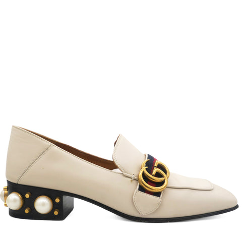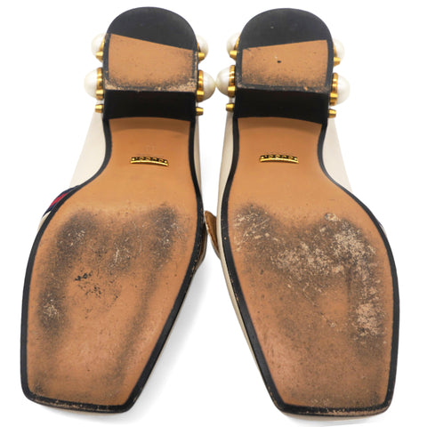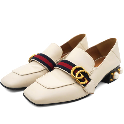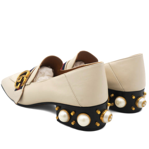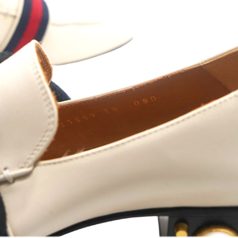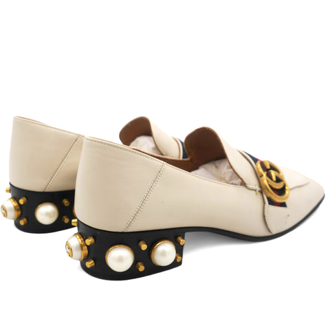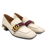 | This is an authentic pair of GUCCI Betis Glamour Calfskin Web Pearl Embellished Peyton 35mm Loafer Pumps 38 in Mystic White. These bold loafers are crafted of ivory calfskin leather and antique gold hardware. They feature a navy blue and red web cross over strap with an off-center GG logo, a squared toe and a black block heel with over-sized pearls and gold stud detailing. |